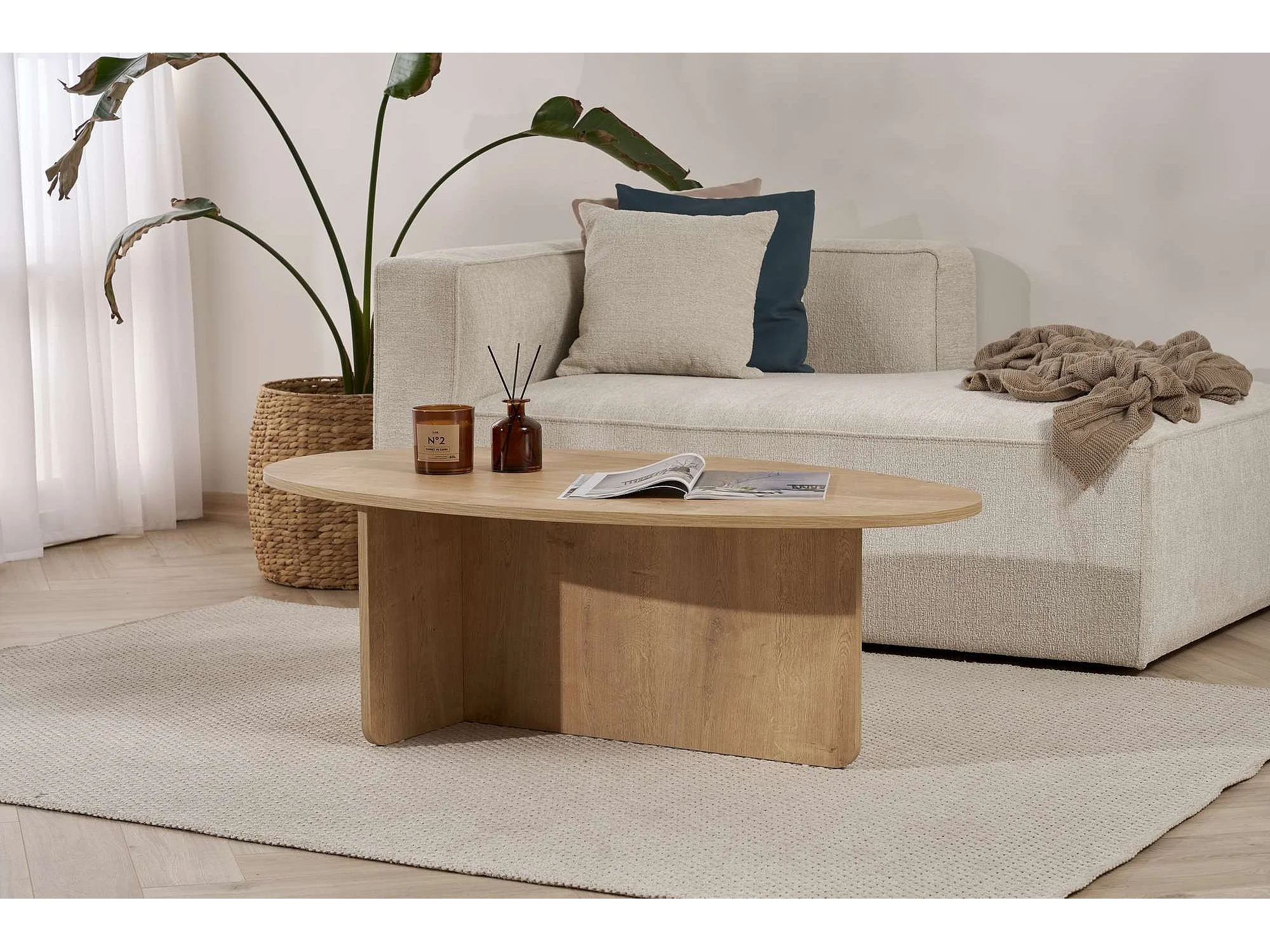 Table basse ovale en bois chêne "Orba" 120x65x40 cm, design épuré sans rangement
