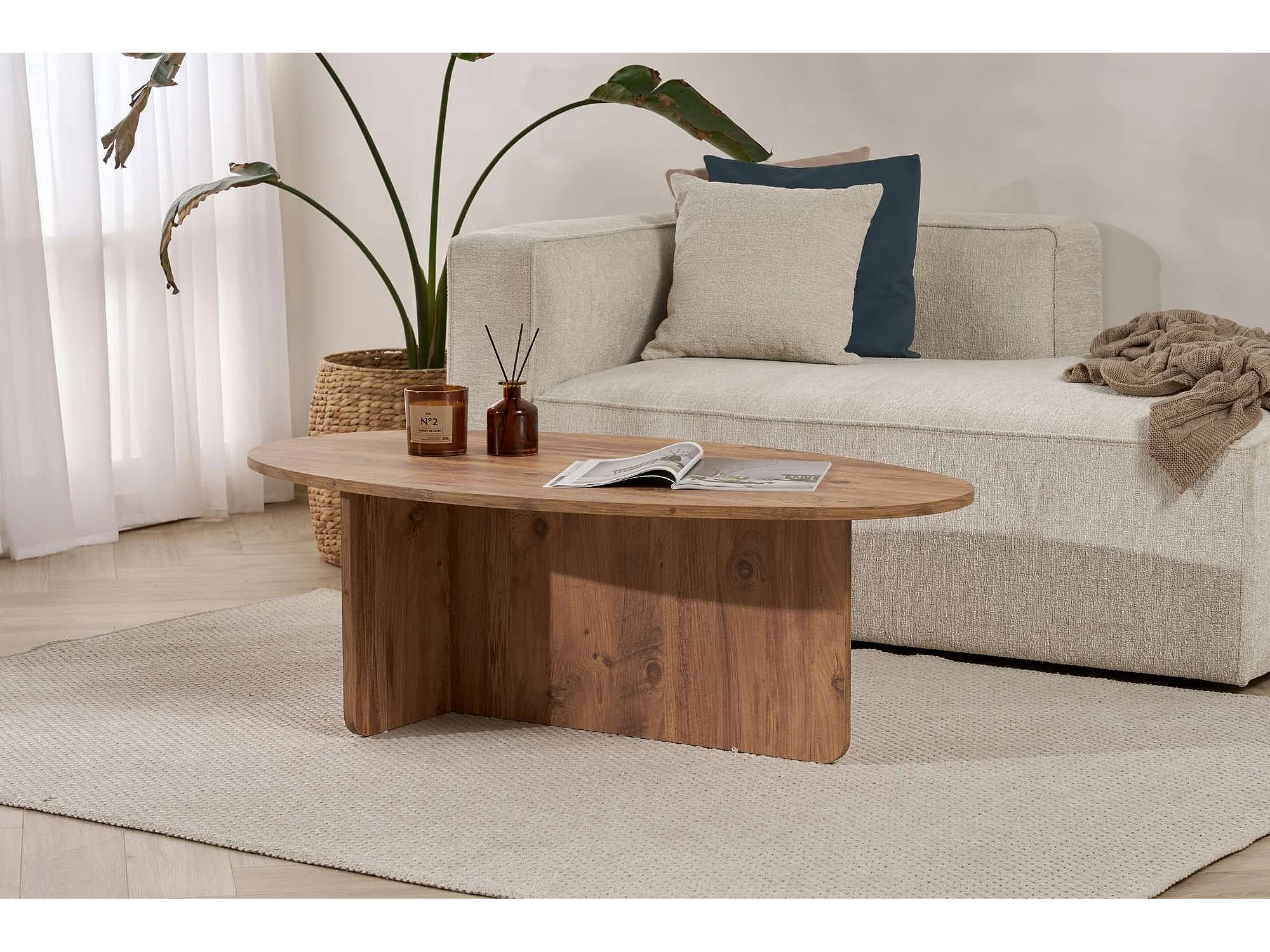 Table basse ovale en bois pin atlantique "Orba" 120x65x40 cm, finition mélamine marron, design épuré sans rangement