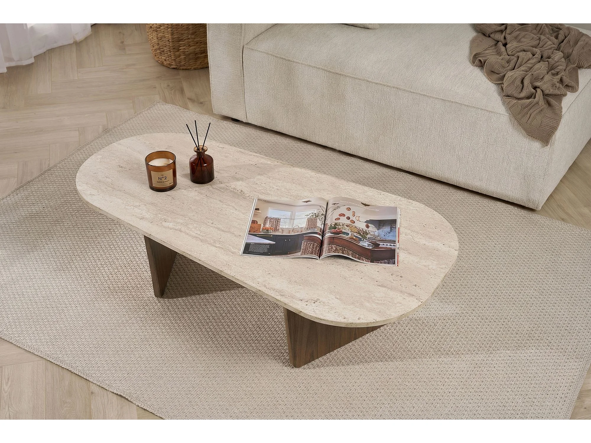 Table Basse en bois "Ovalis" - 130 x 65 x 40 cm - Travertin / Noyer