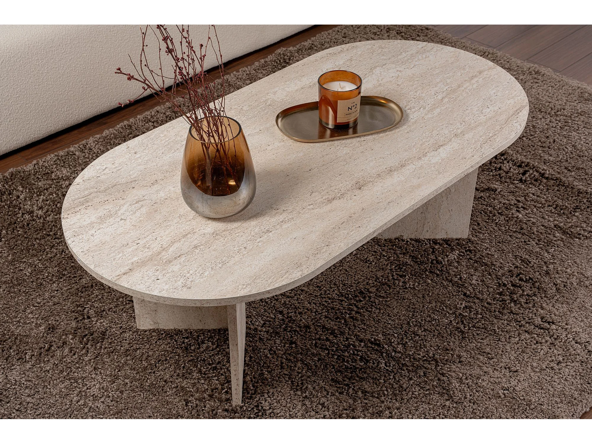 Table basse en bois "Ovalis" - 130 x 65 x 40 cm - Travertin