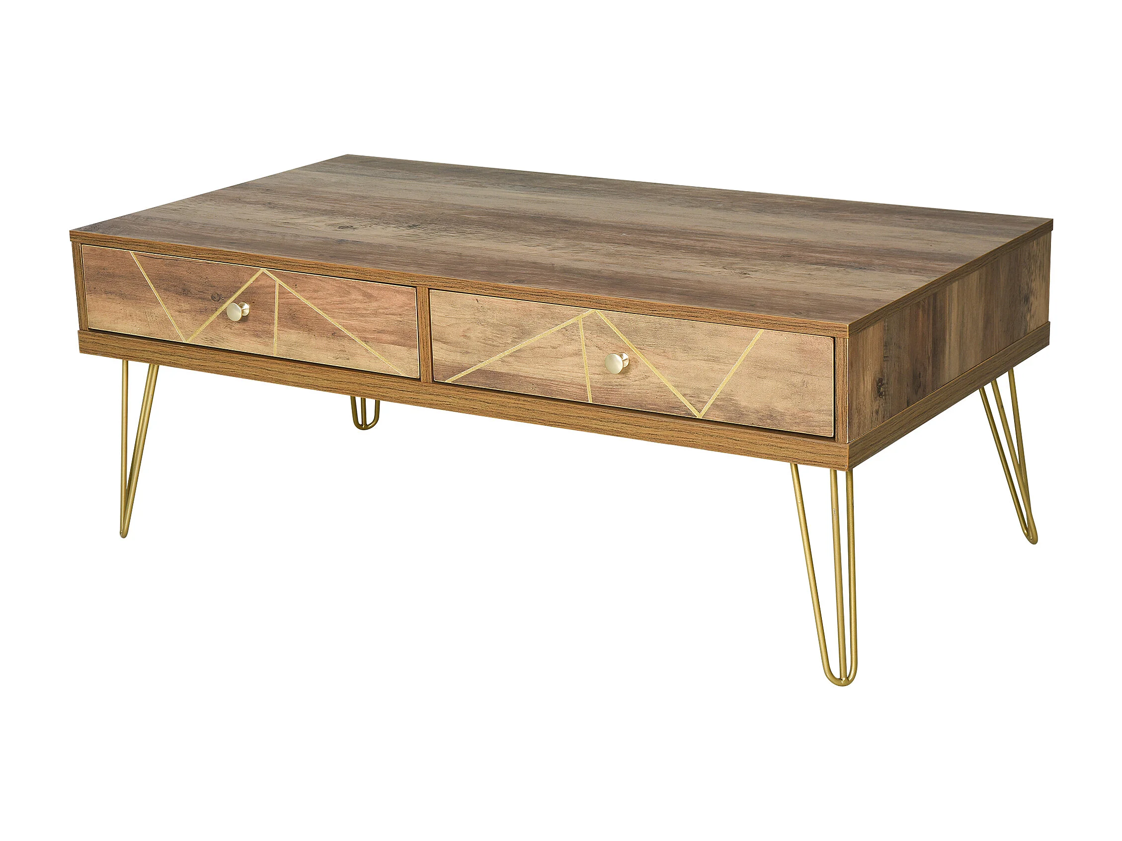 Table Basse en Bois Table de Salon Grand Plateau et 2 Tiroirs Design de Luxe Élégant Décoration avec Lignes Dorées Peintes à La Main 110L x 59l x 42H cm Brun