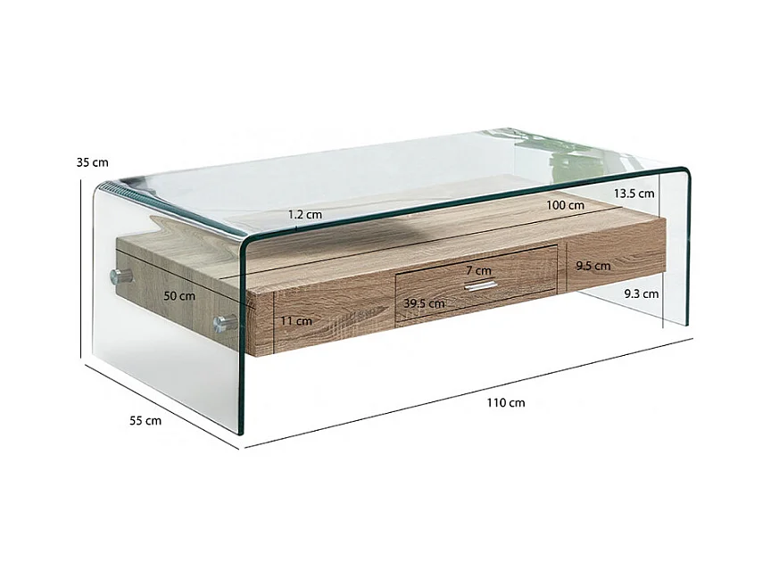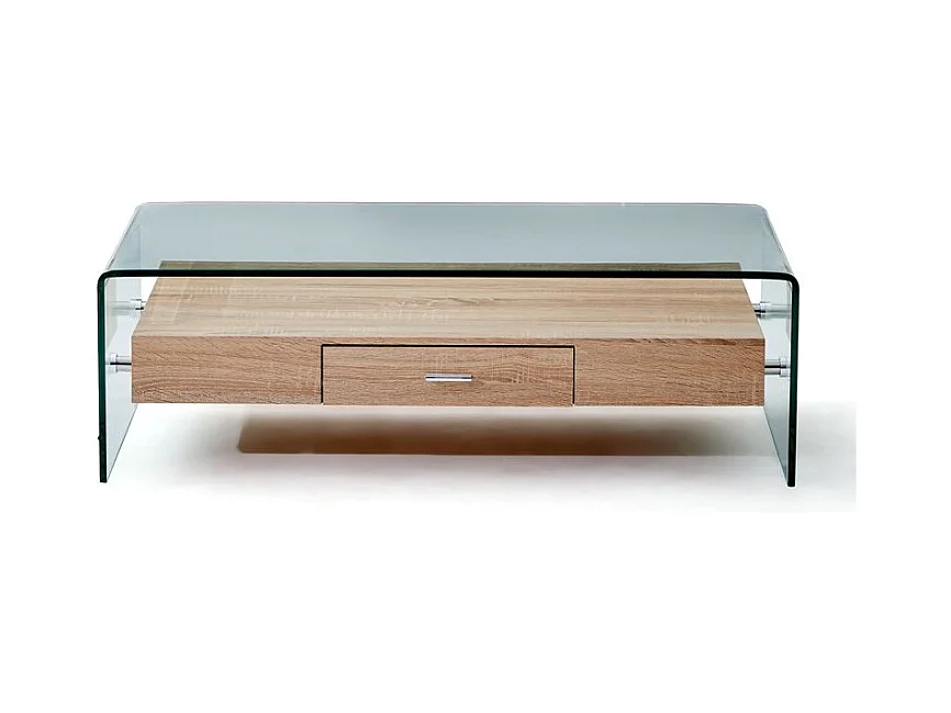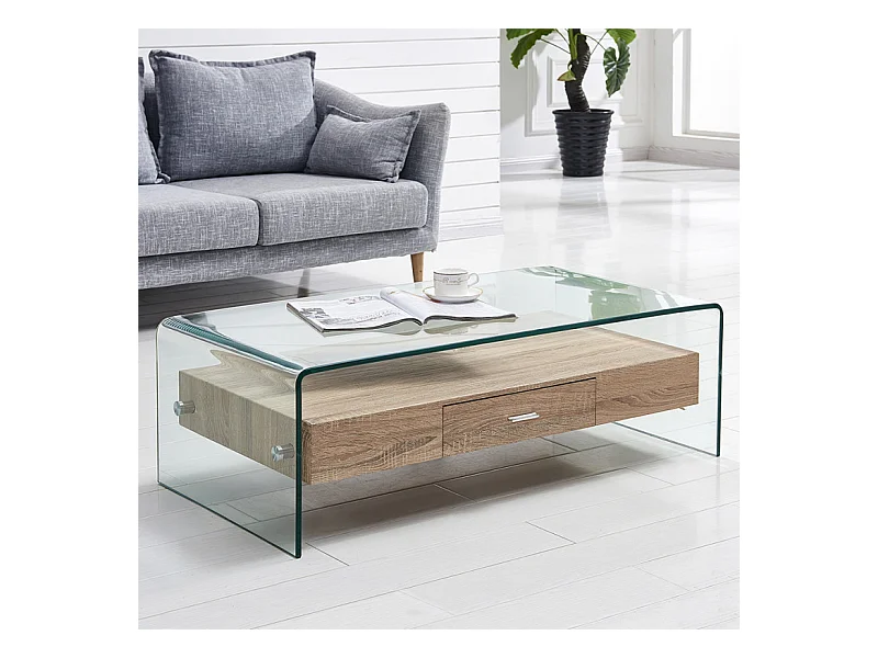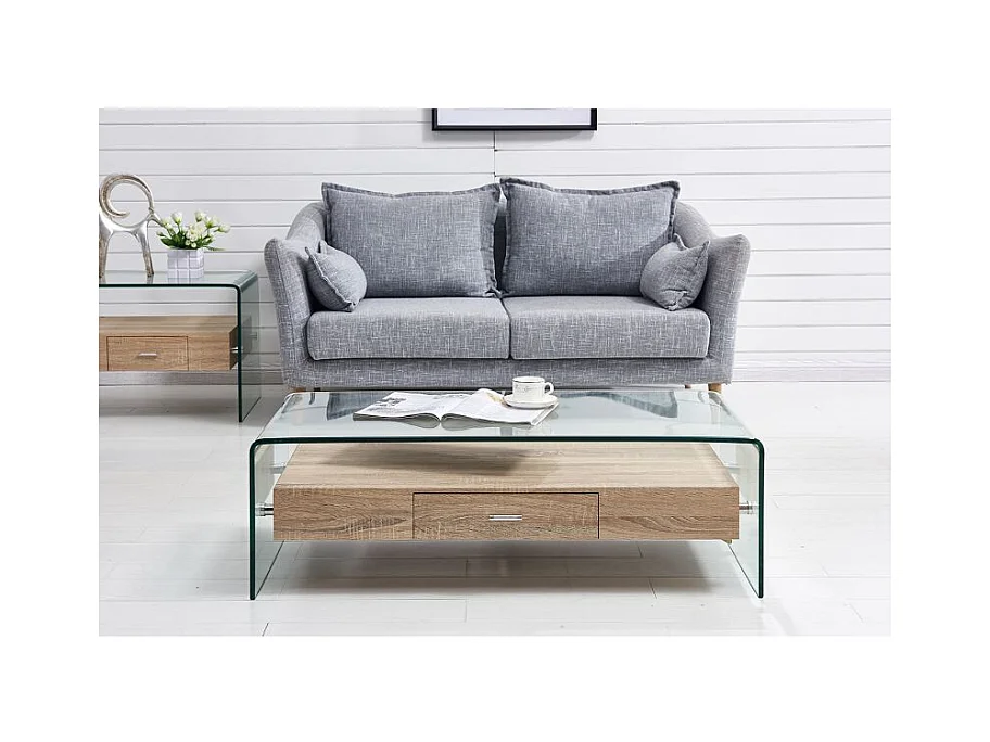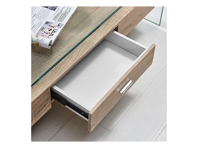 Table basse 110 cm en verre trempé avec tiroir décor chêne - ICE