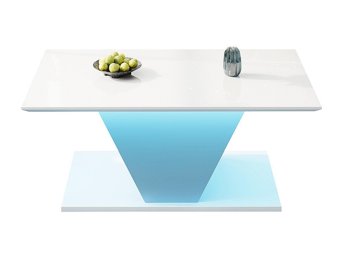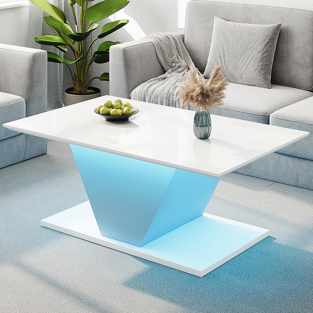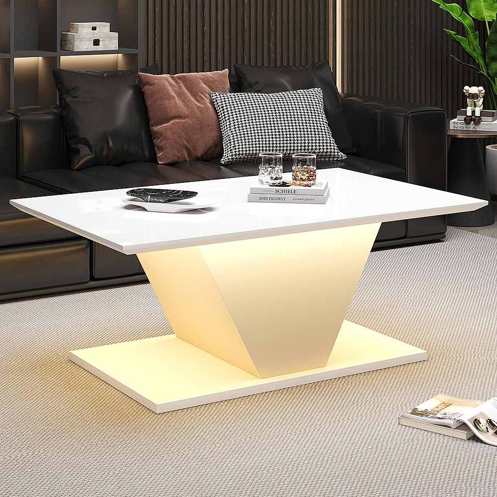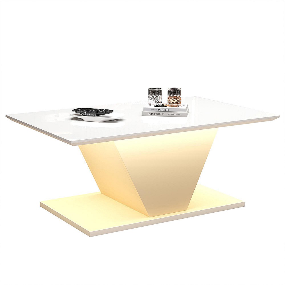 Table basse moderne avec LED, palteau en structure creuse avec verre, surface blanc laqué