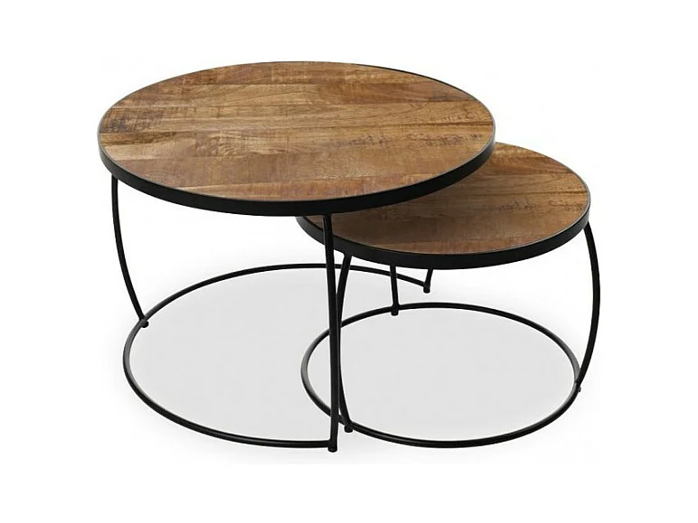 Ensemble de 2 tables basses gigognes rondes LARSON – Bois exotique et métal noir – Style industriel