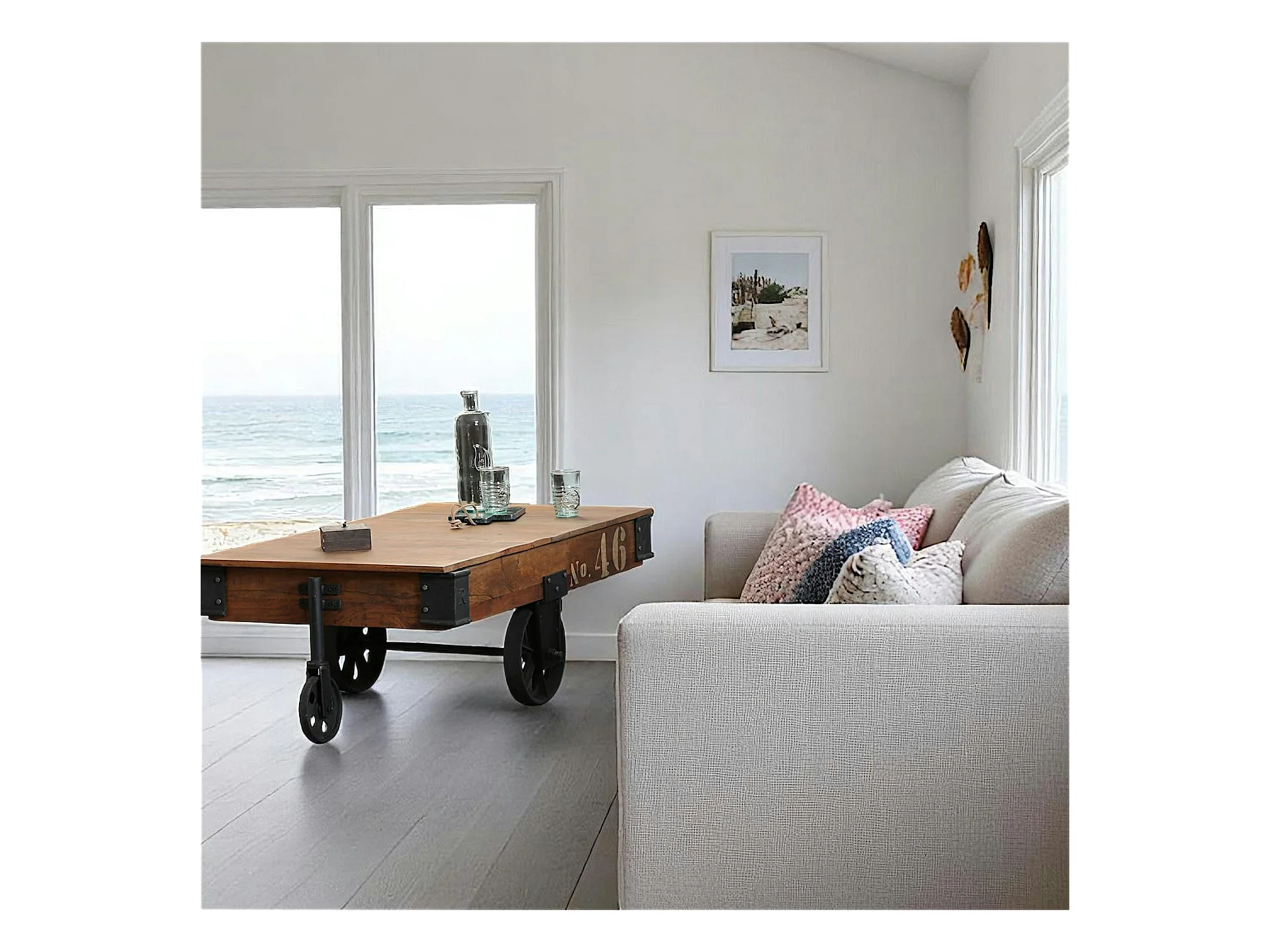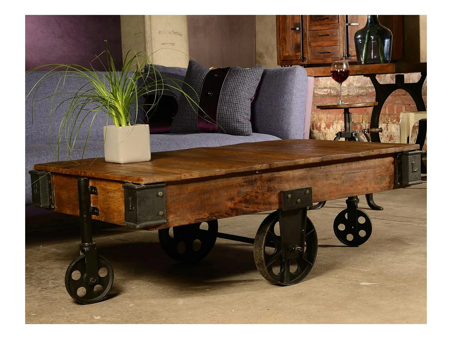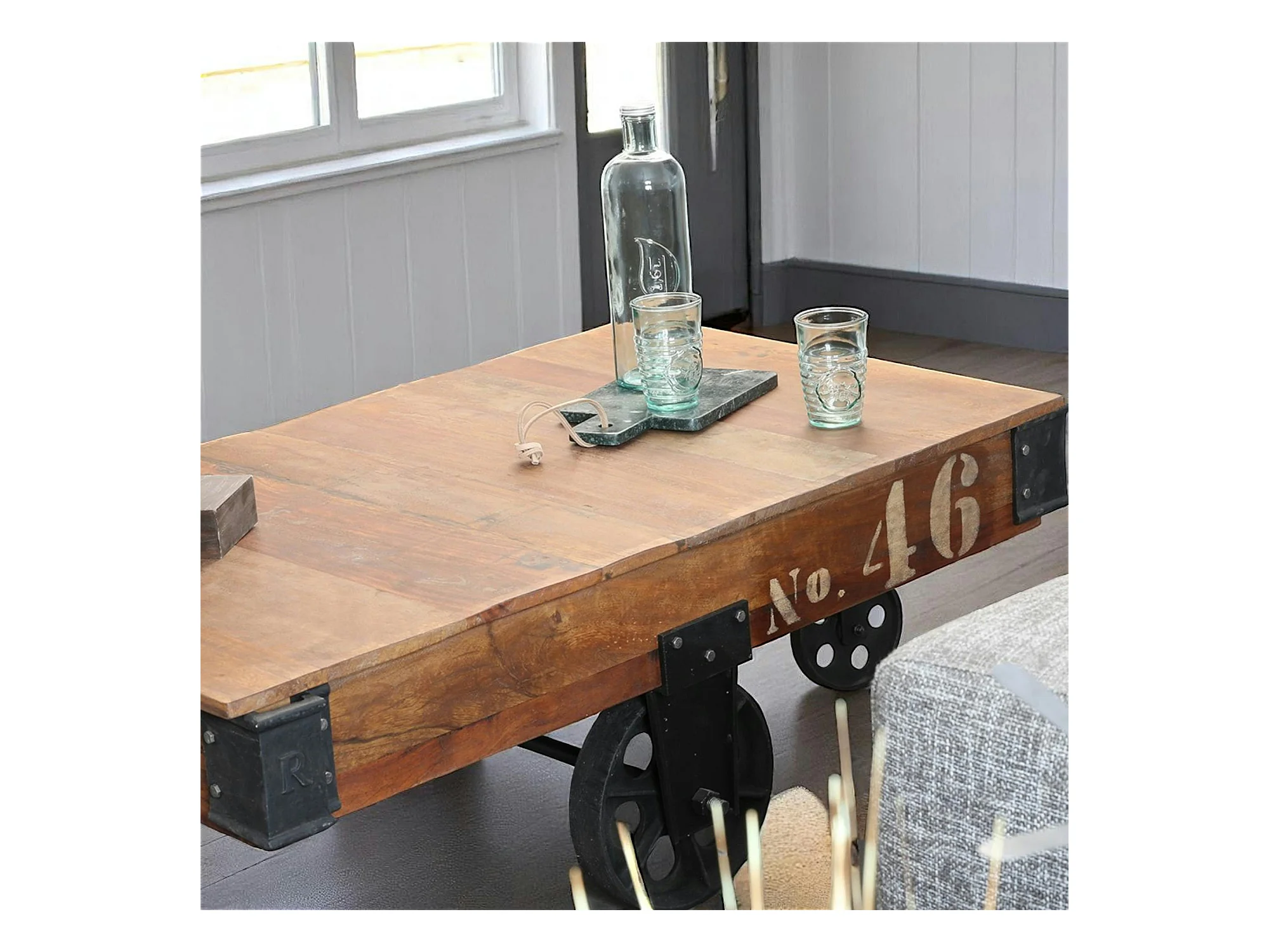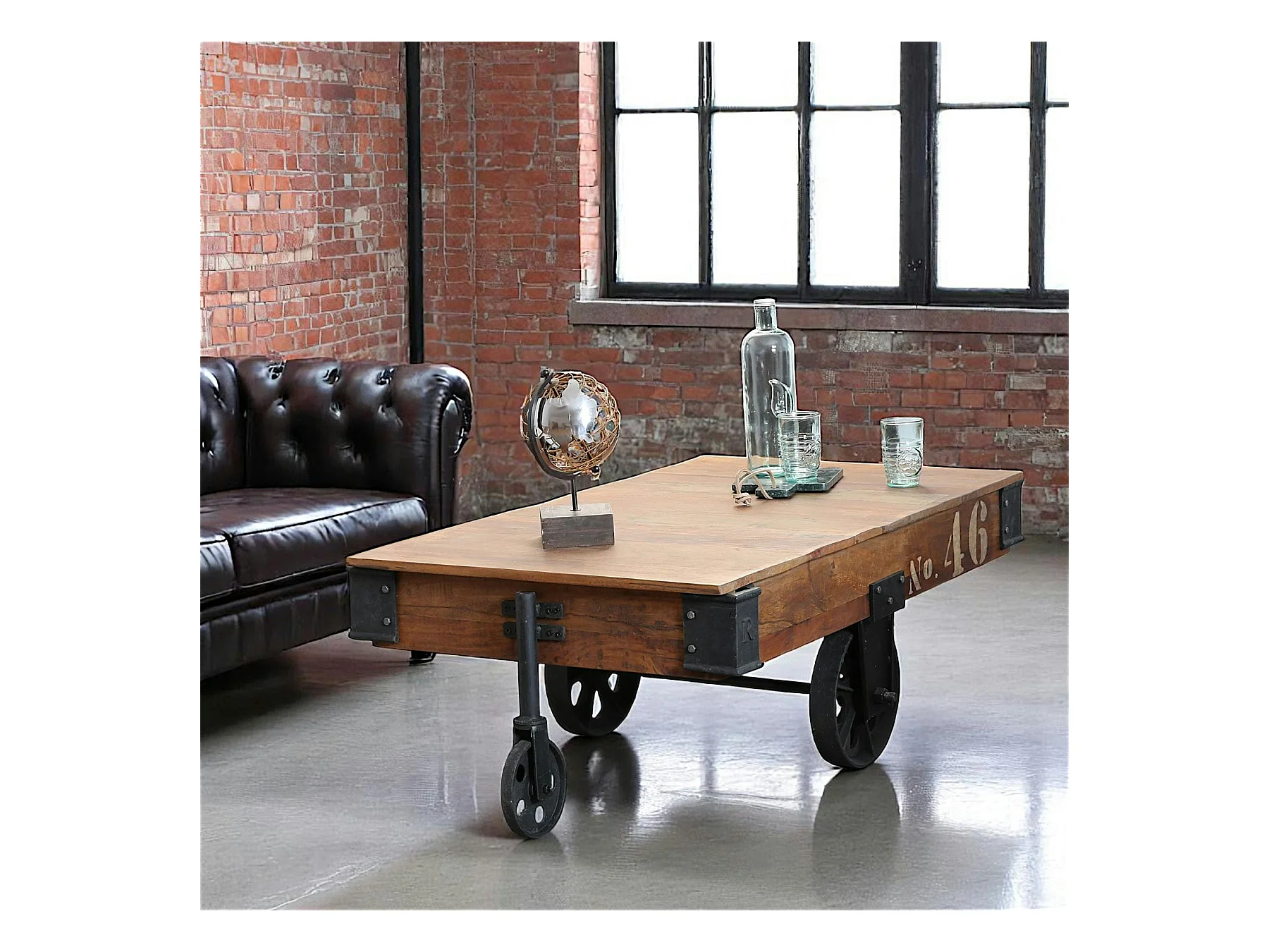 Table basse industrielle vintage bois recyclé roues LEEDS