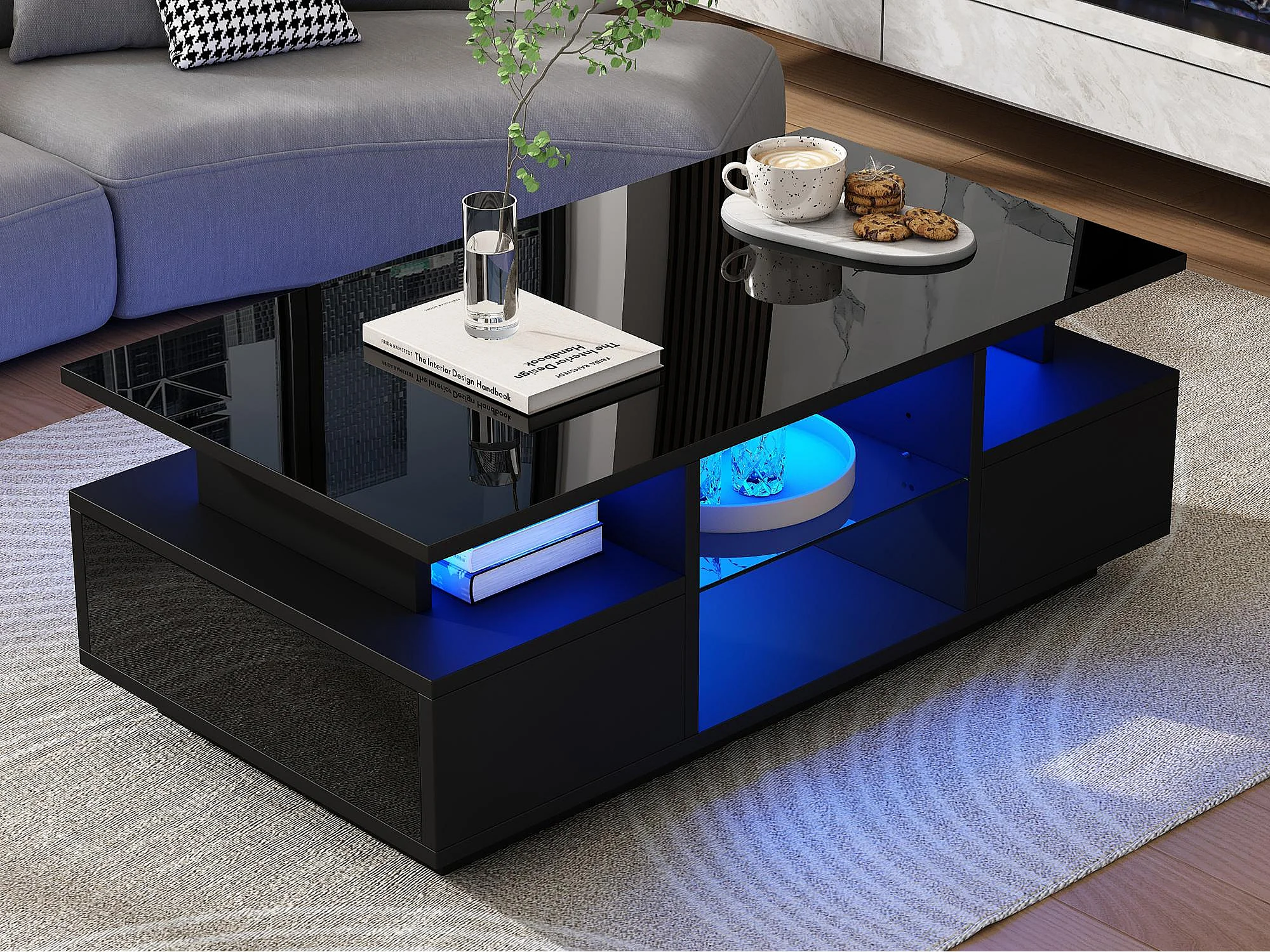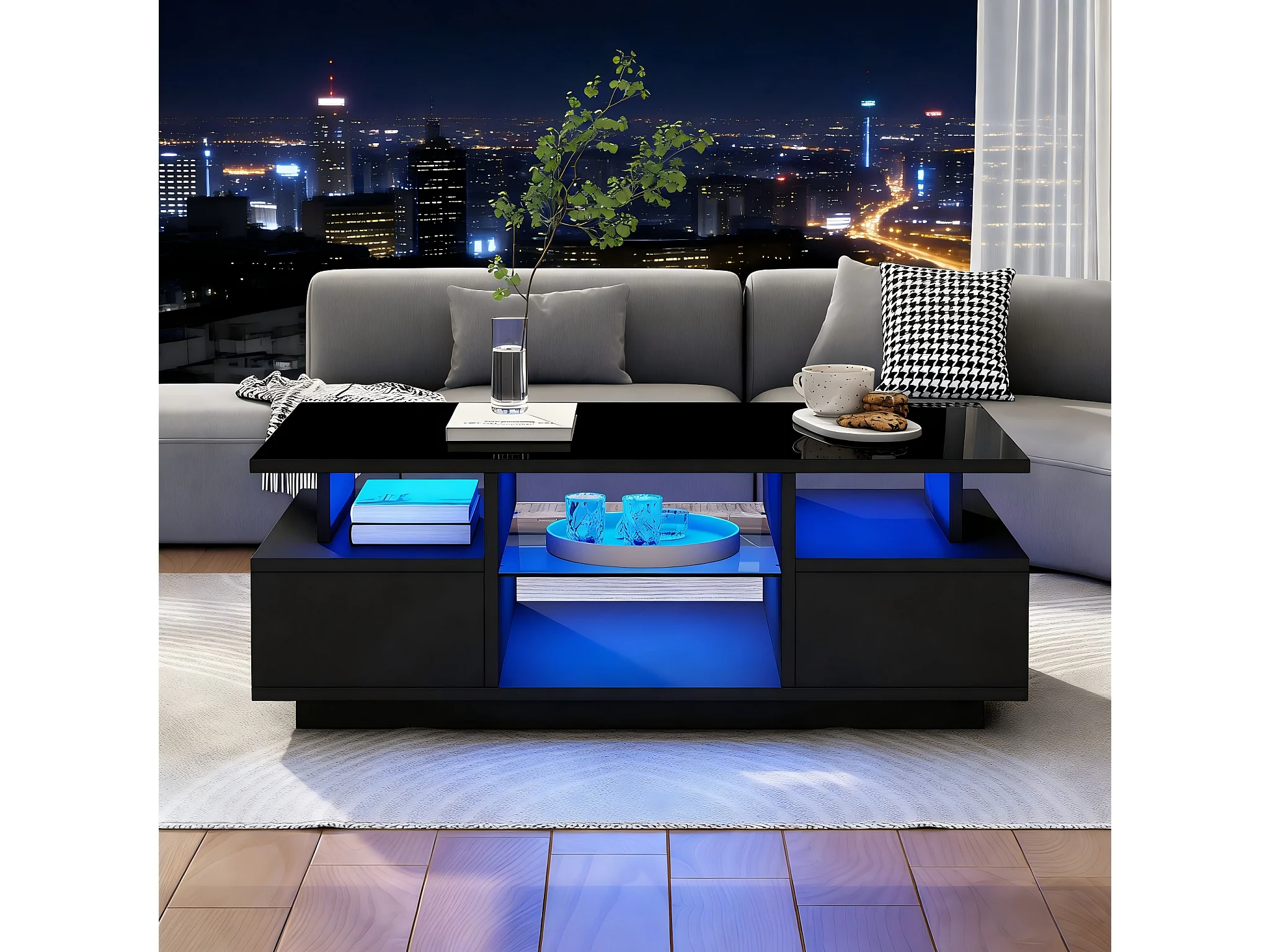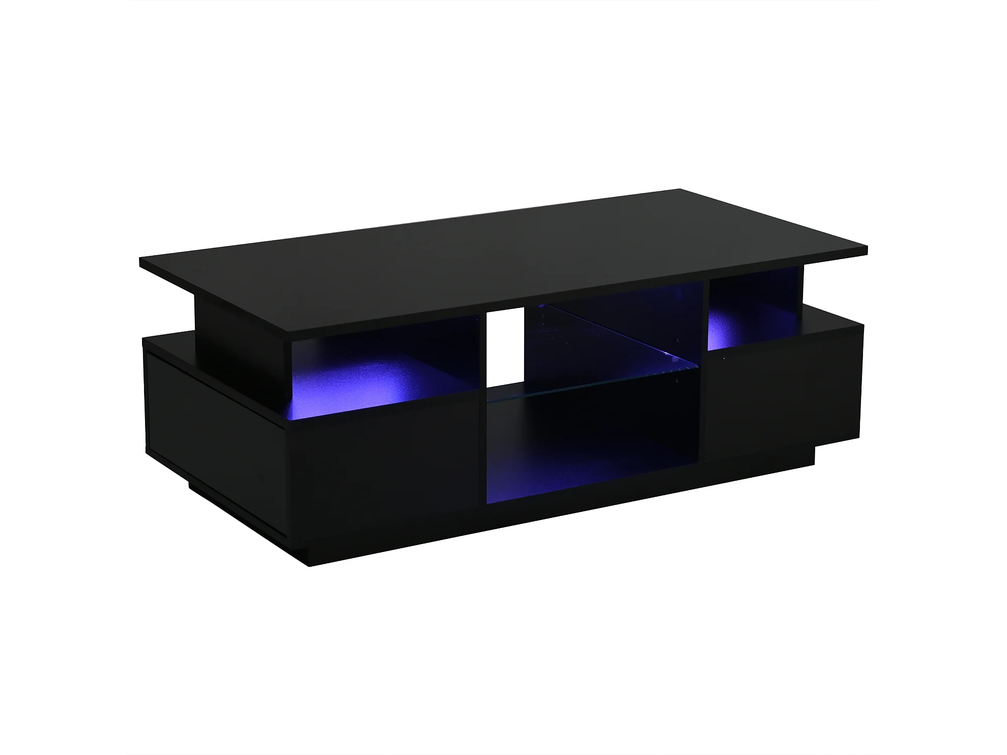Table basse laquée brillante 100x50x36 cm - avec LED - 2 tiroirs et espace de rangement ouvert - panneaux de particules - noir