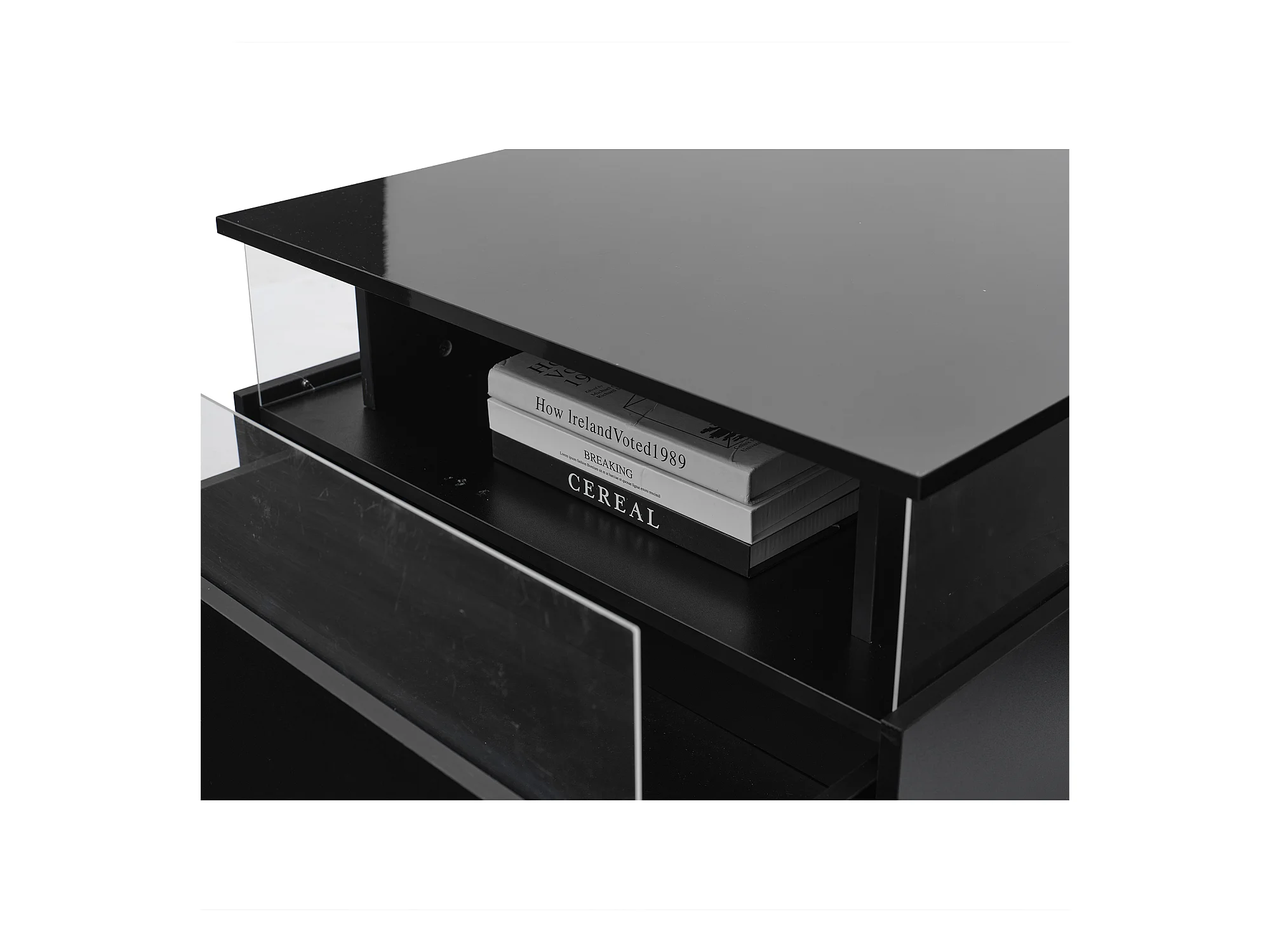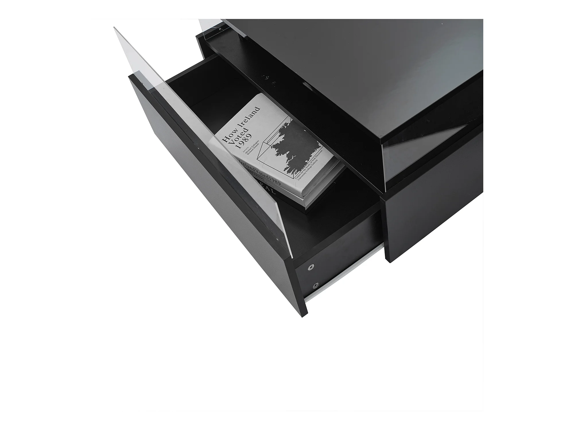 Table basse LED 70x70x41 cm verre brillant 2 tiroirs Noir