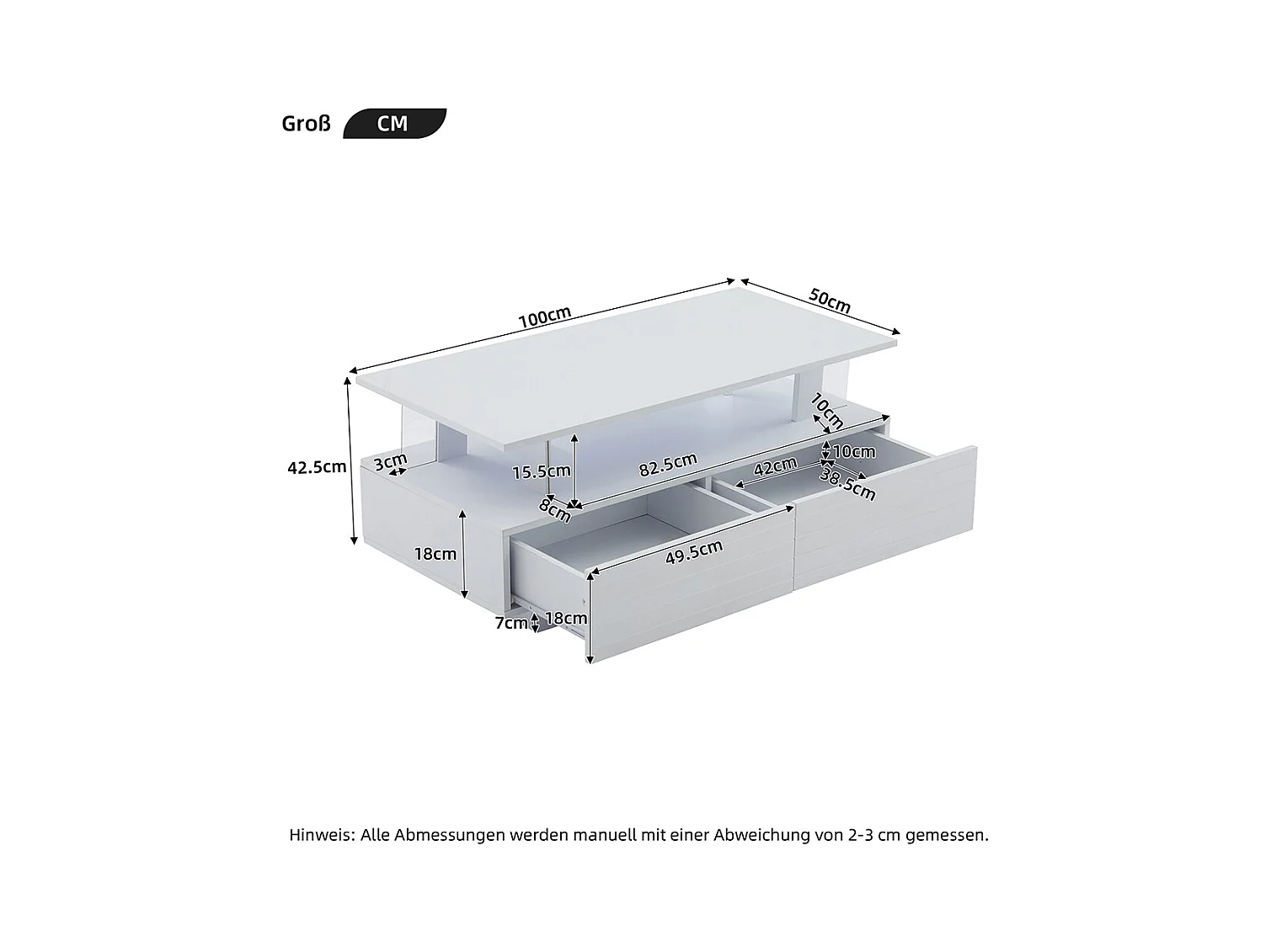 Table basse de salon rectangulaire avec 2 tiroirs et 1 compartiment ouvert blanc et naturel