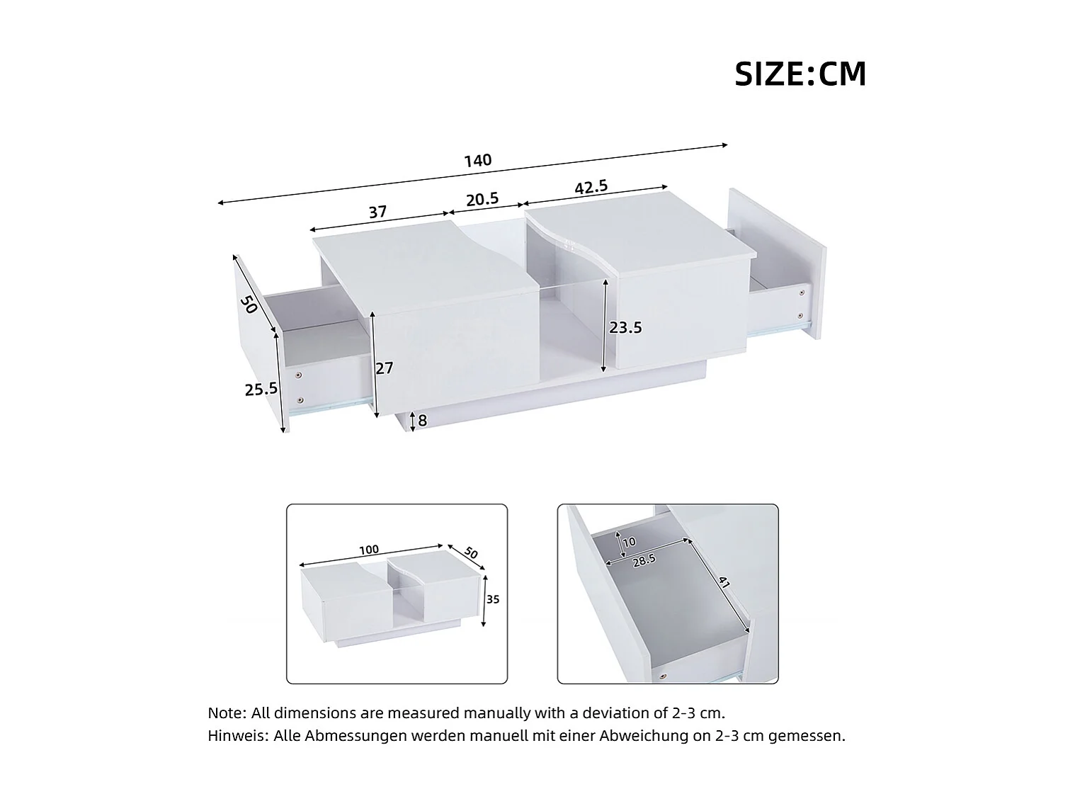 Table basse LED moderne blanc brillant 2 tiroirs éclairage LED plateau acrylique MDF salon chambre