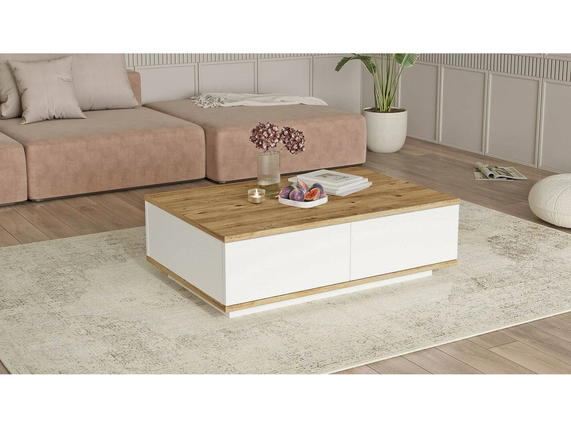 Table basse Marfik, Table basse, Porte-revues pour canapé, Etagère de salon, 90x60h29 cm, Chêne et Blanc