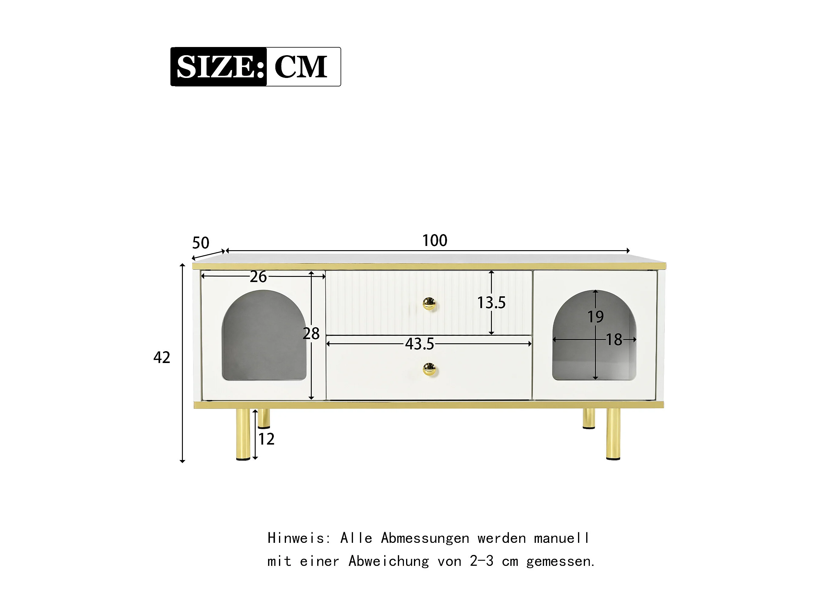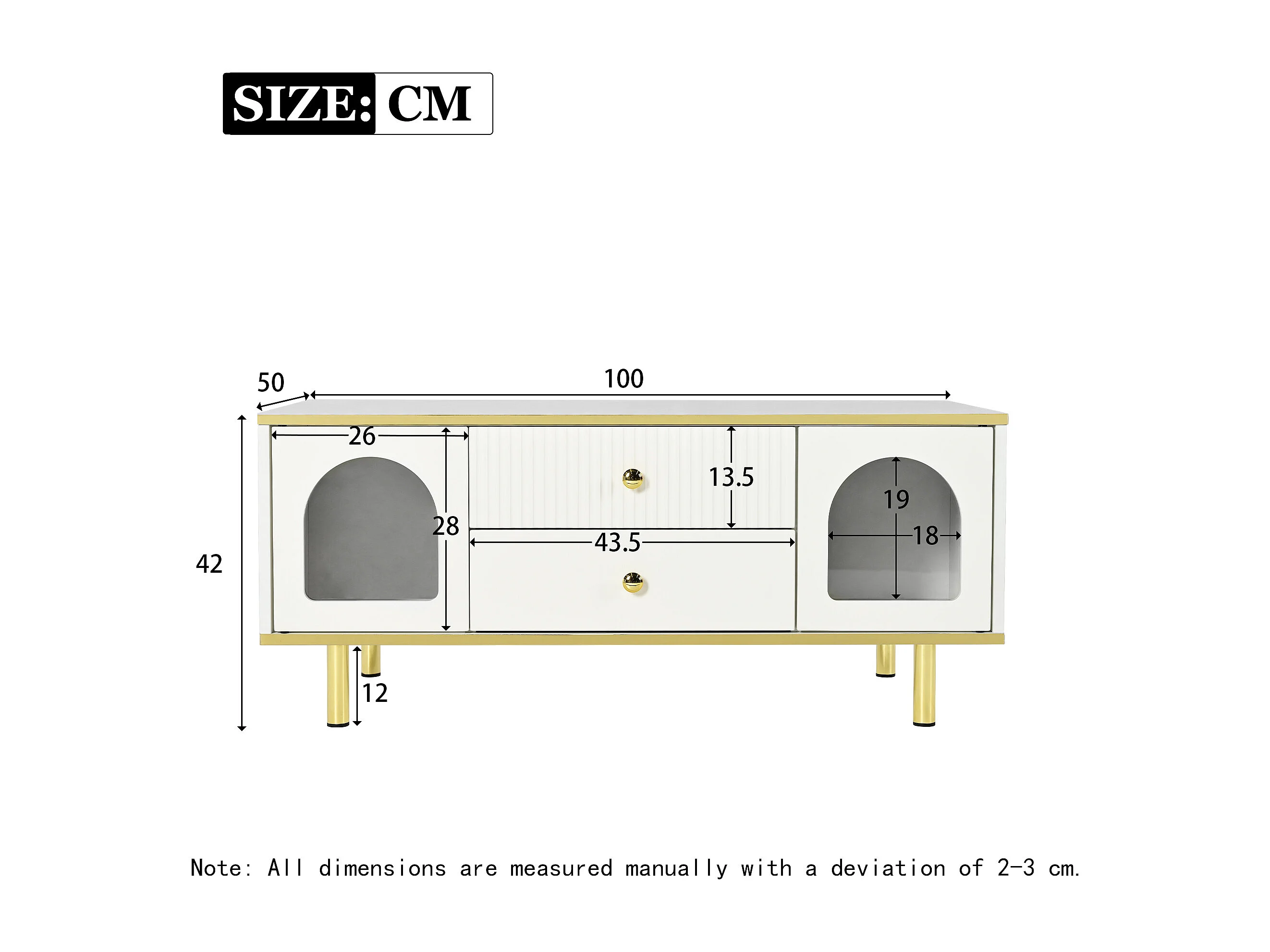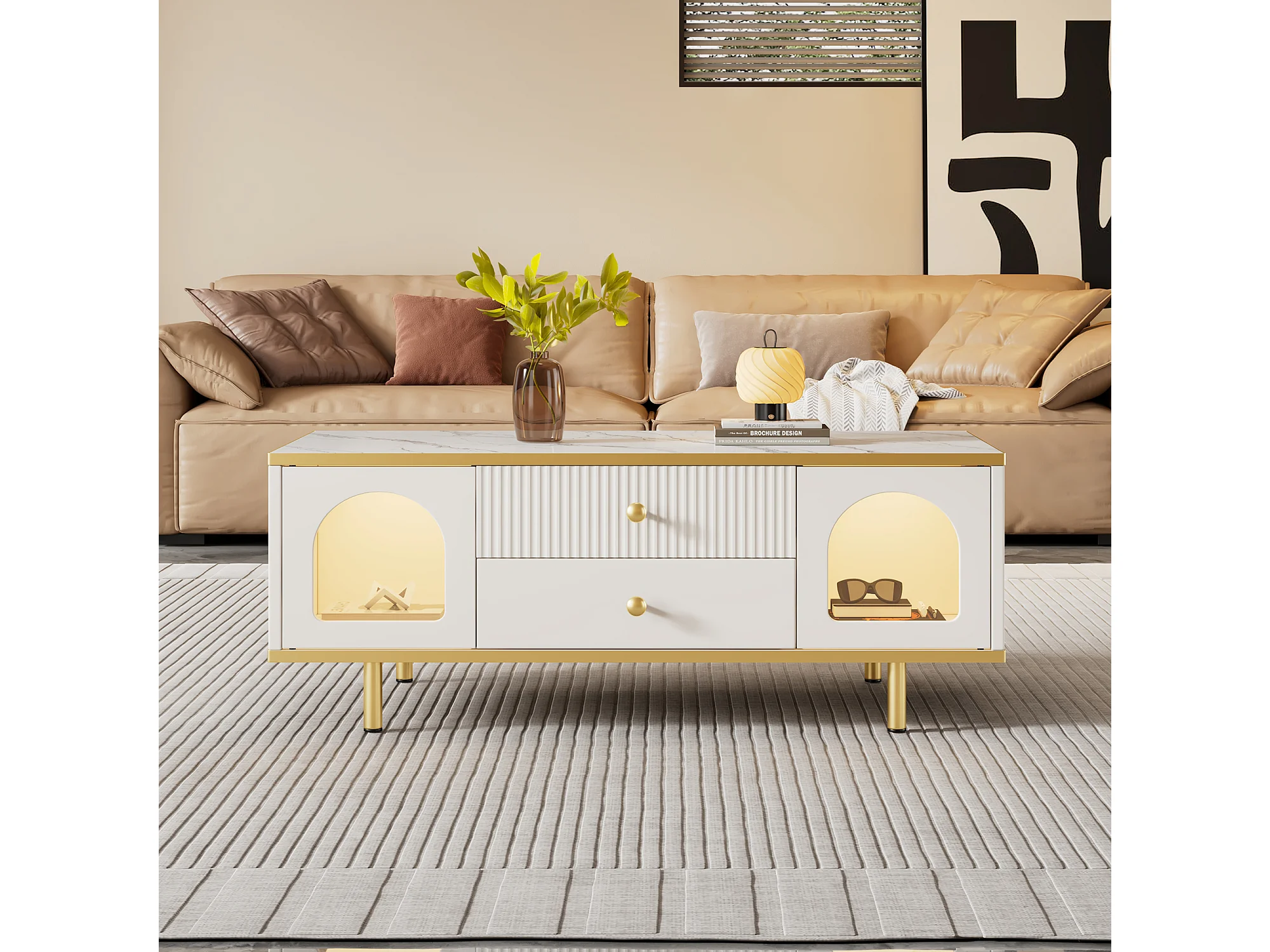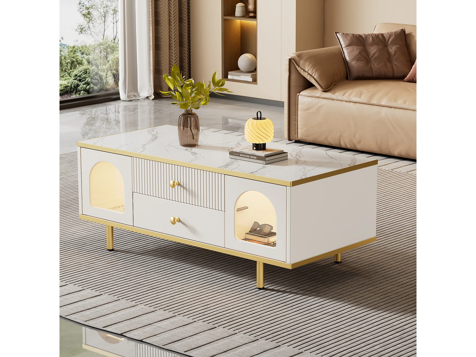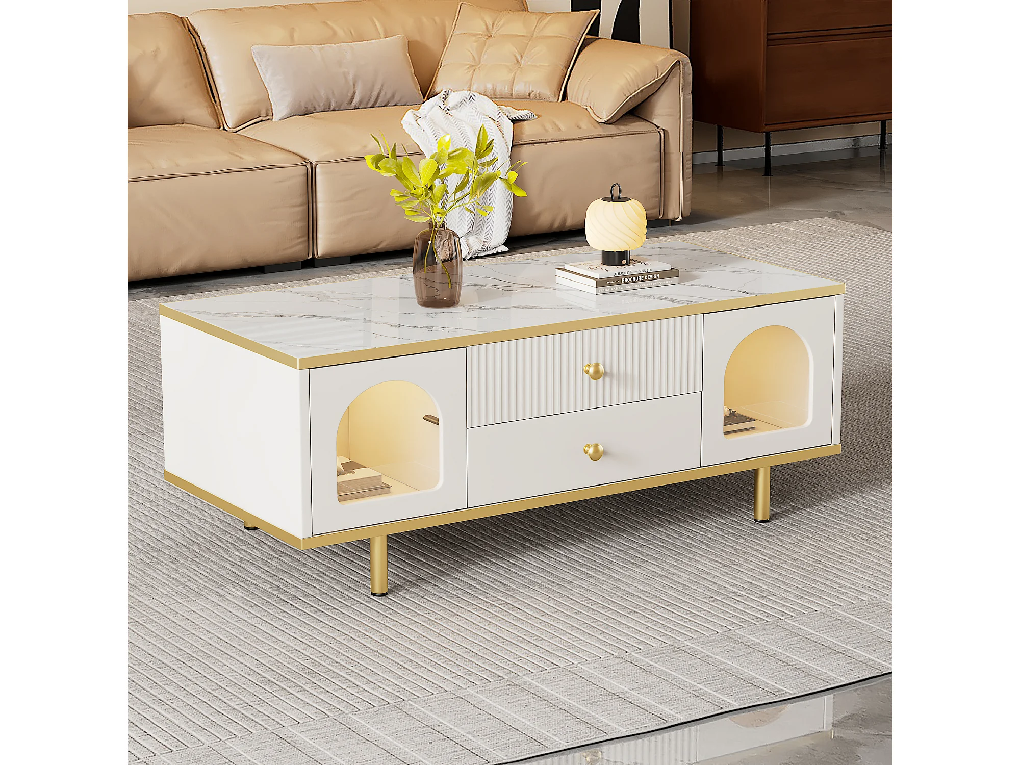 Table basse moderne avec 2 portes et 2 tiroirs - lumières LED - 100x50x43 cm - motif en marbre - métal doré et Panneaux de particules - blanc