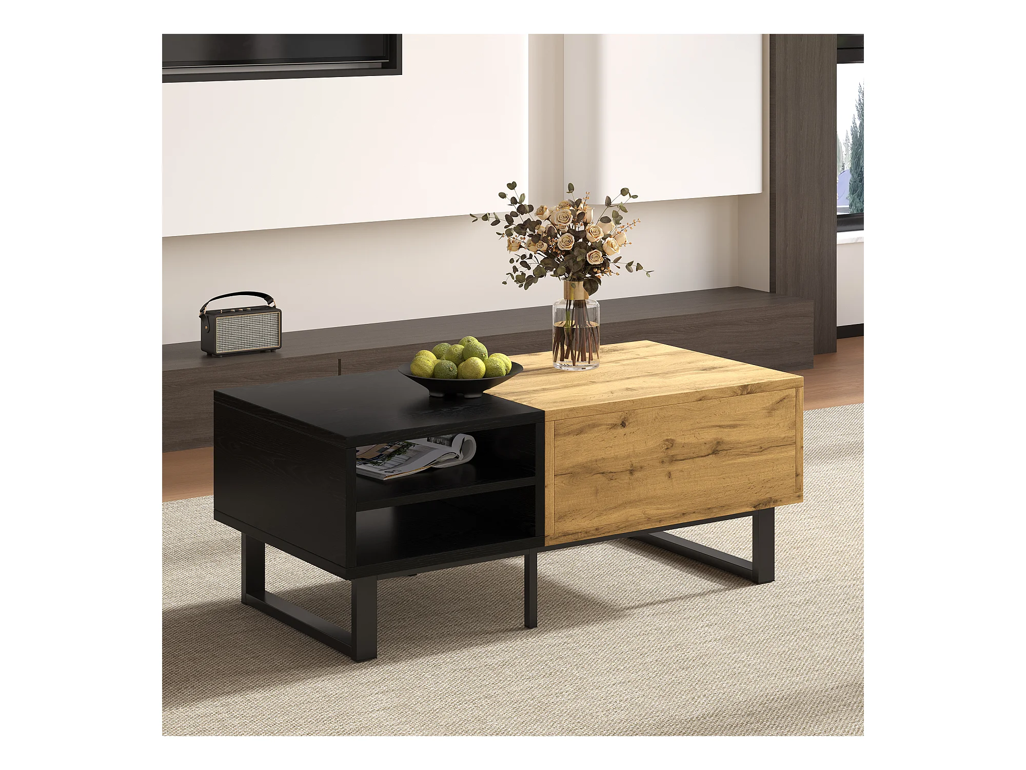 Table basse moderne avec compartiments et tiroirs, structure color-block, pieds métalliques, design élégant