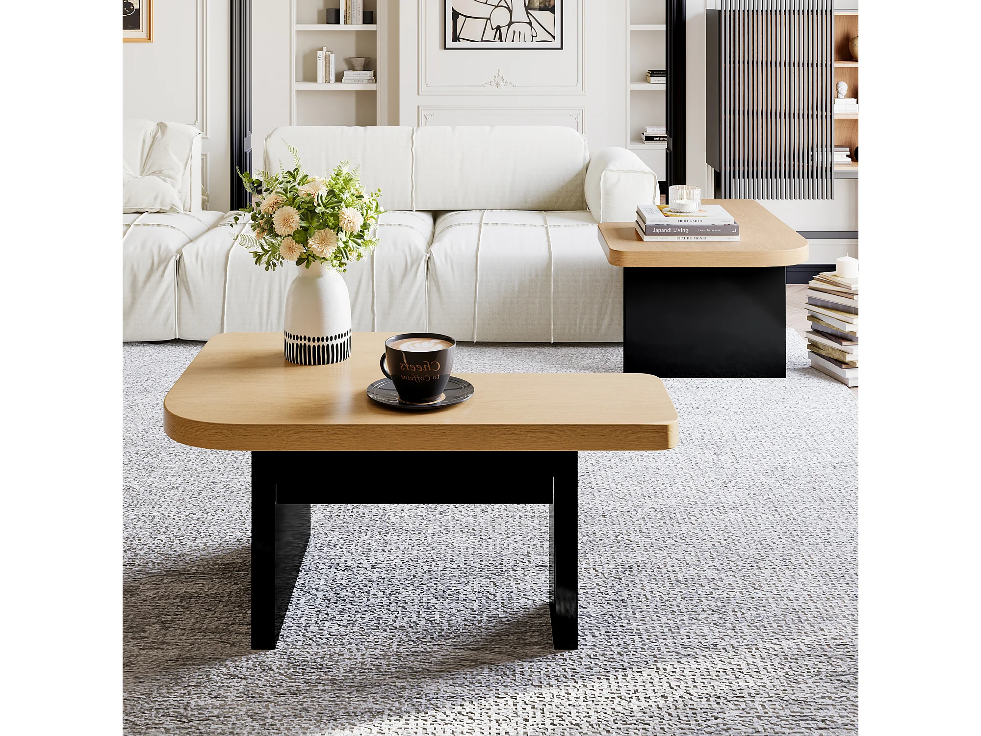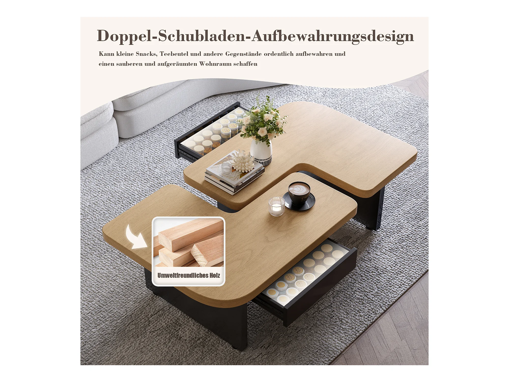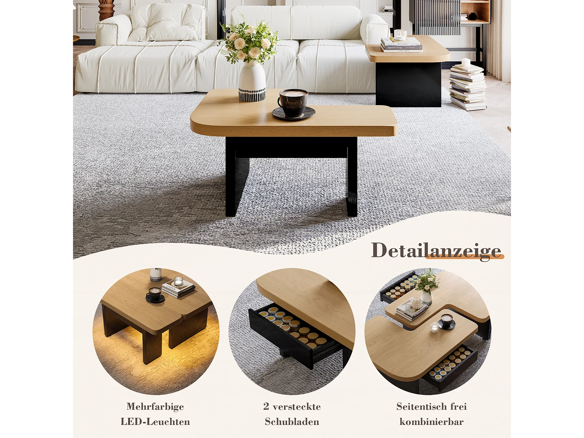 Table Basse Moderne avec LED, Design en Bois Écologique, 2-in-1, 2 Tiroirs, Éléments Modulables, Couleur Bois Naturel (90x60x44.5 cm)
