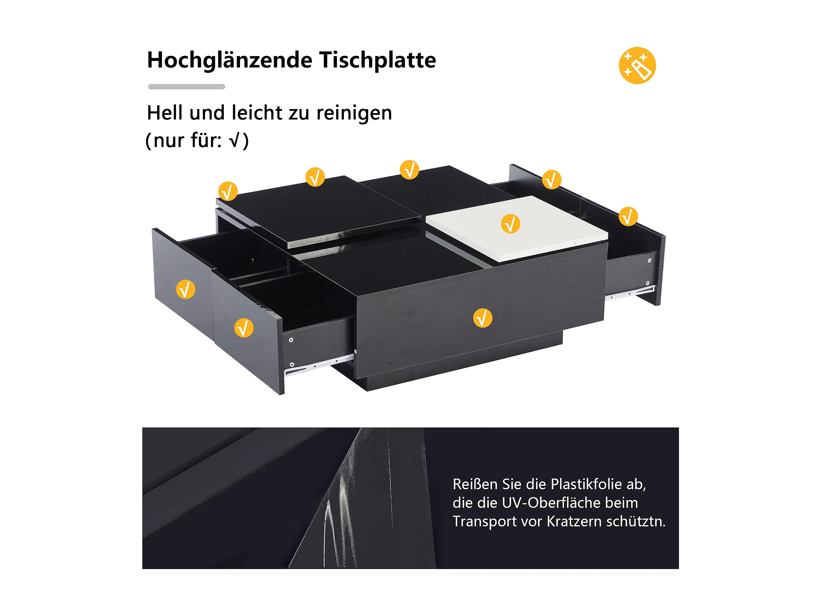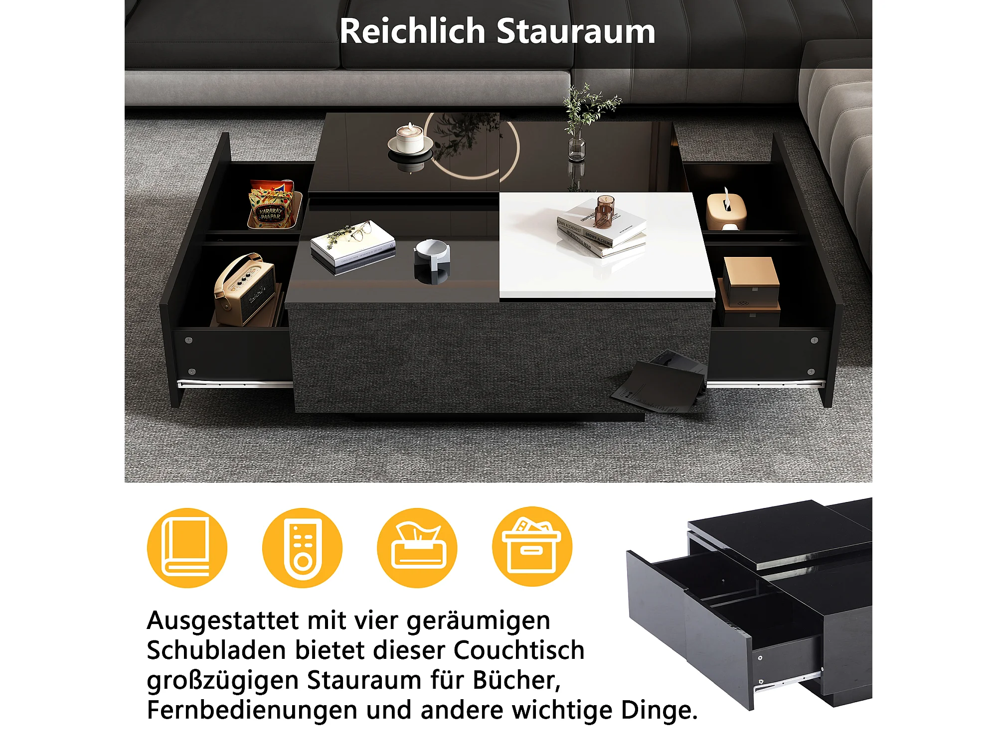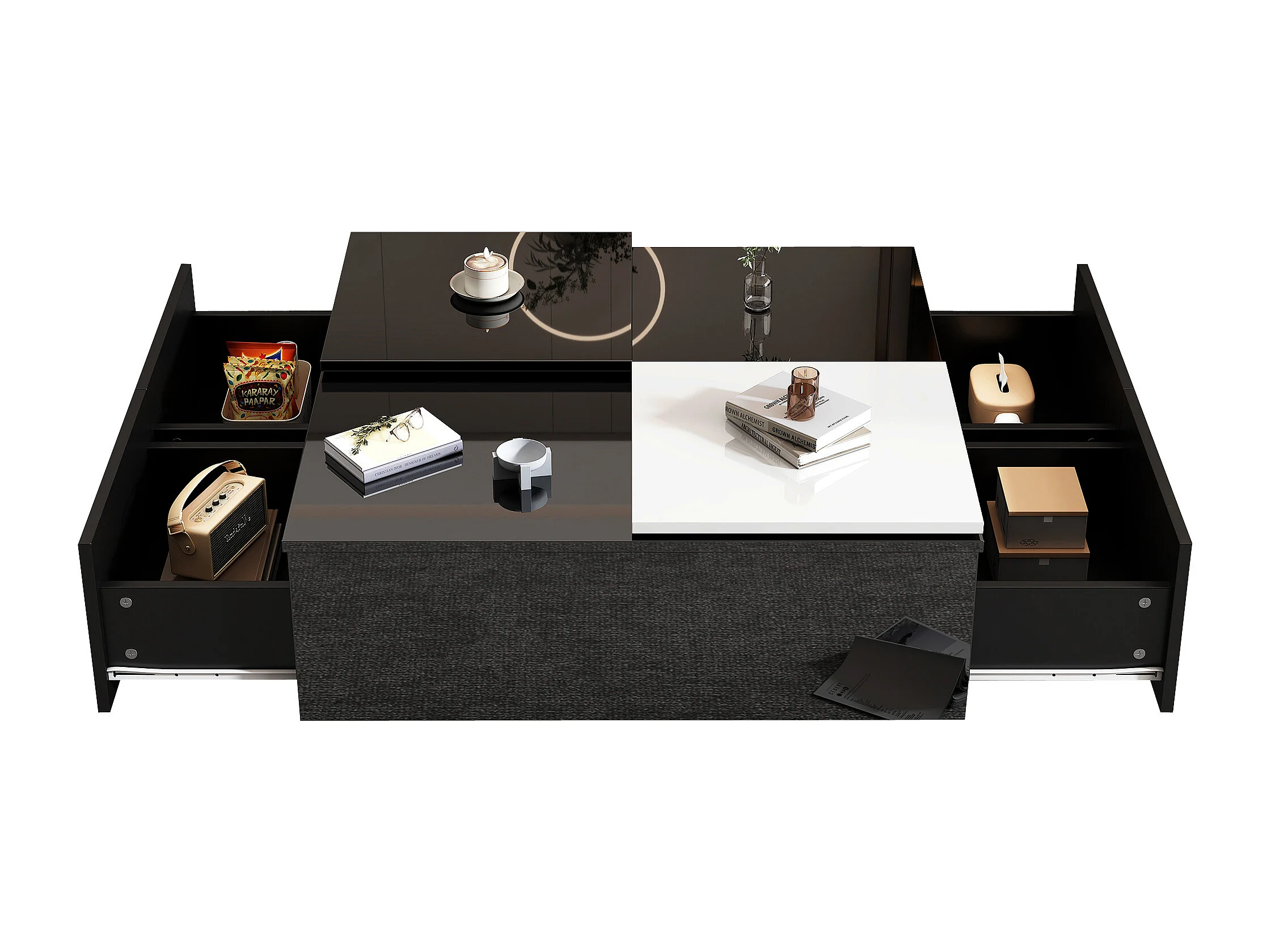 Table basse moderne carrée noire laquée avec plateau coulissant blanc, étagères, 75*75*33,5cm, capacité maximale 30 kg
