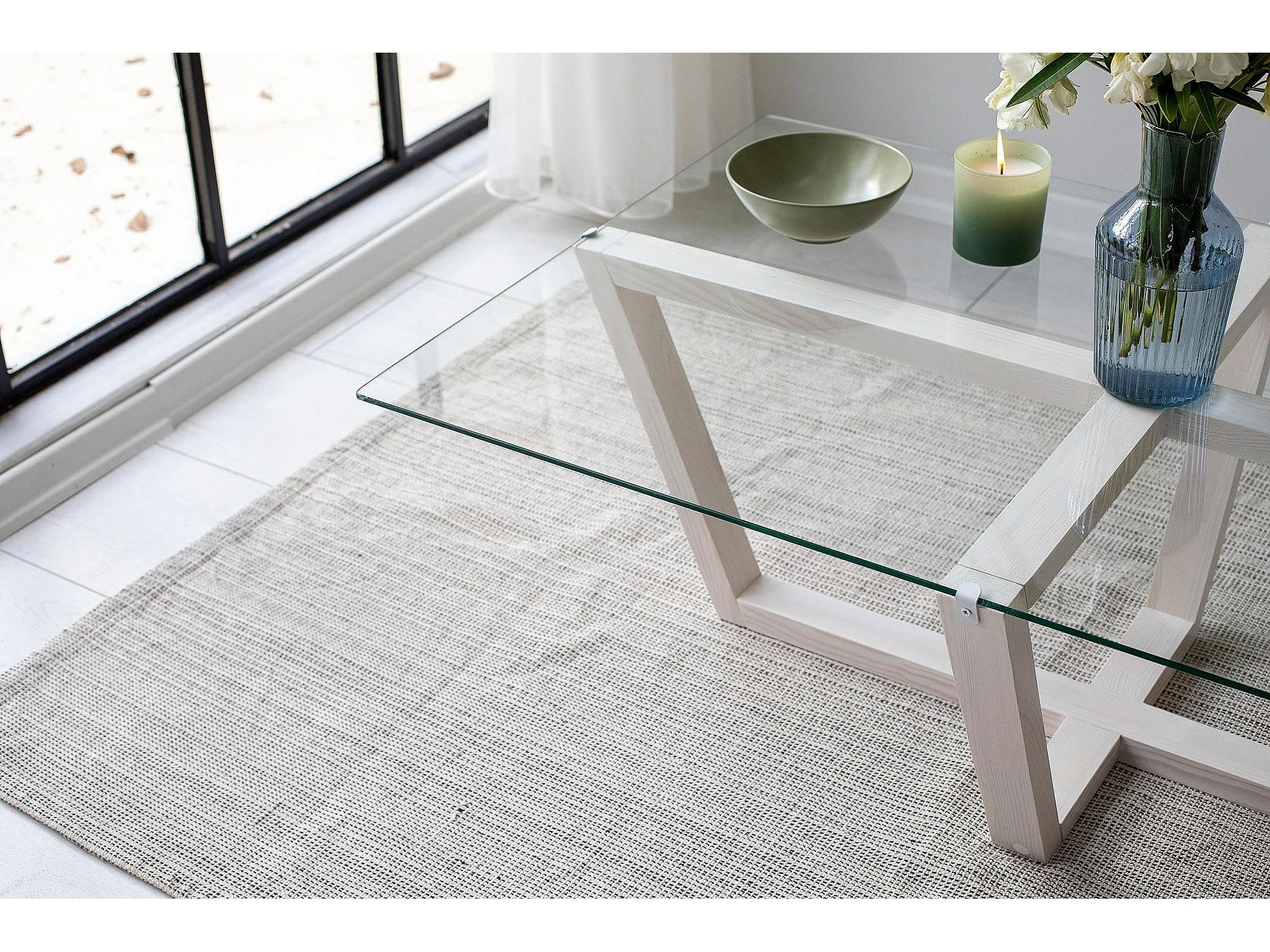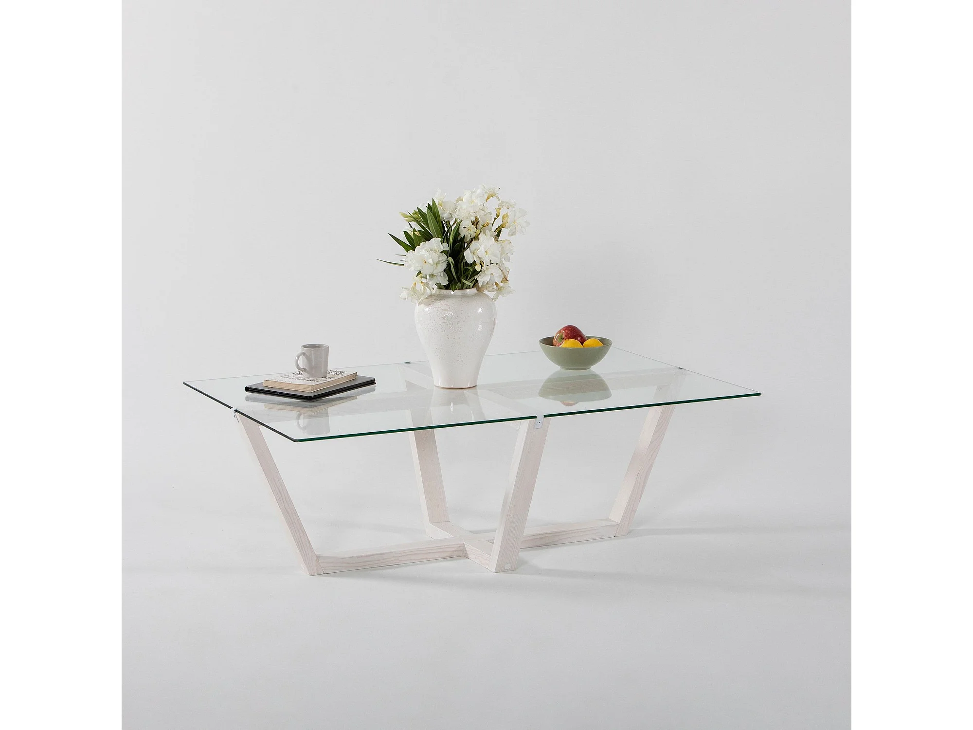 Table basse moderne Dinter L105cm Bois massif Blanc et Verre Transparent