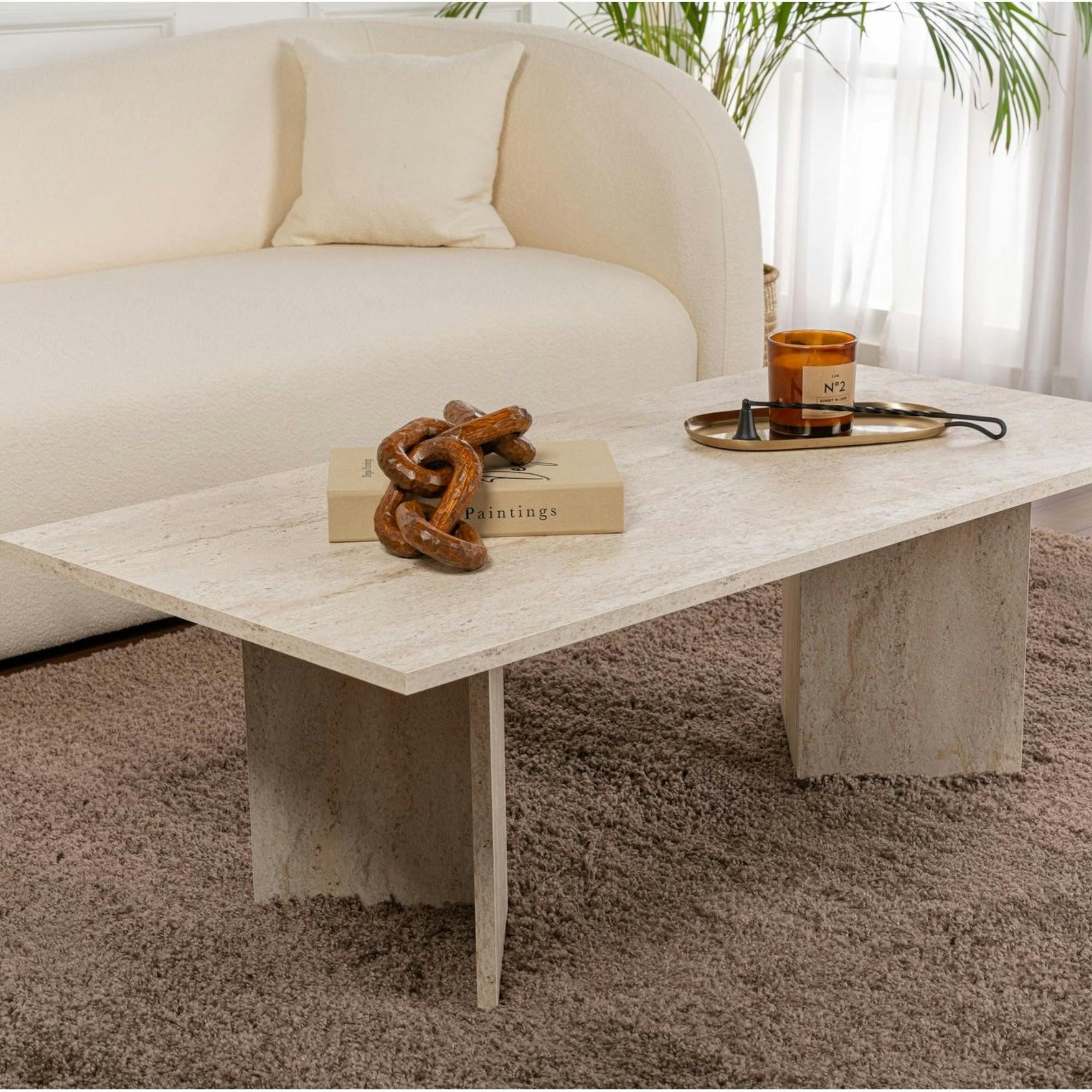 Table basse moderne effet travertin - pieds en V MARFA