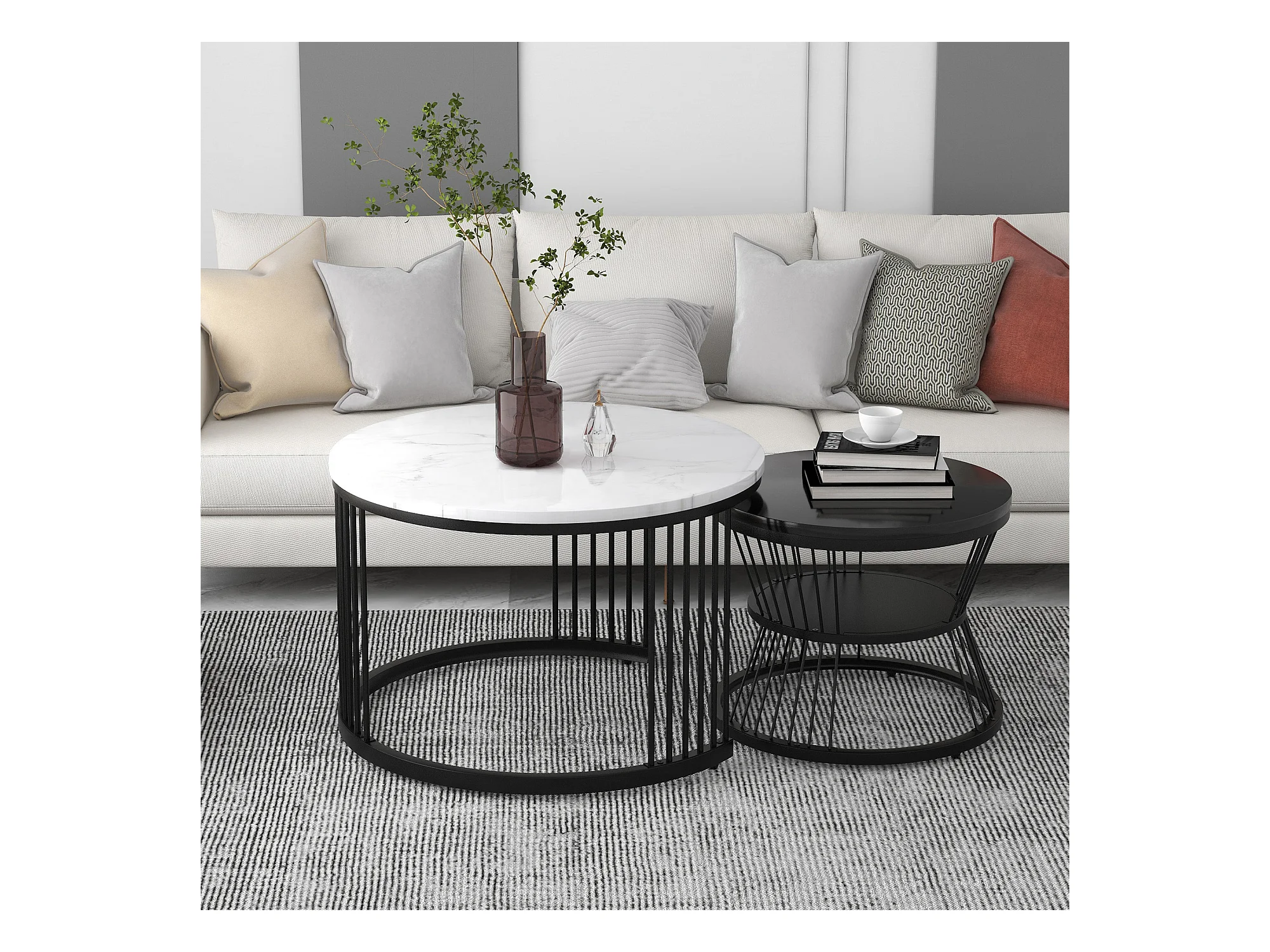 Table basse moderne empilable avec plateau en MDF à effet marbré, cadre noir, ensemble de 2 tables basses, design élégant et pratique pour salon