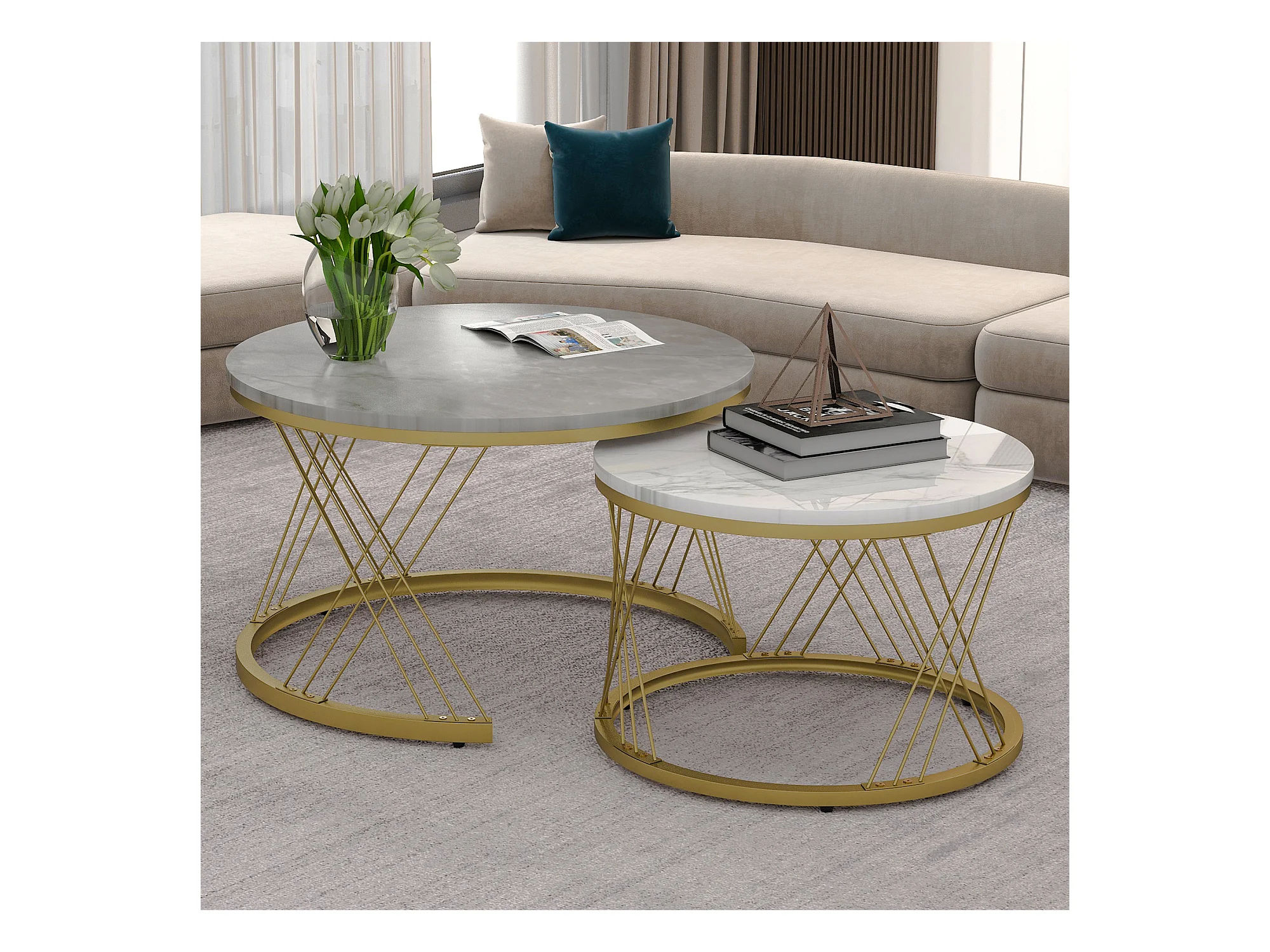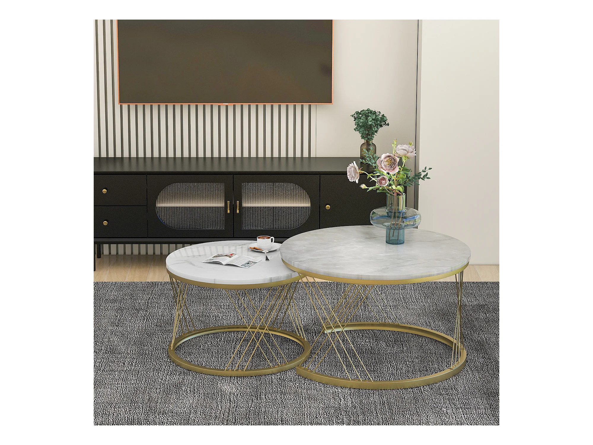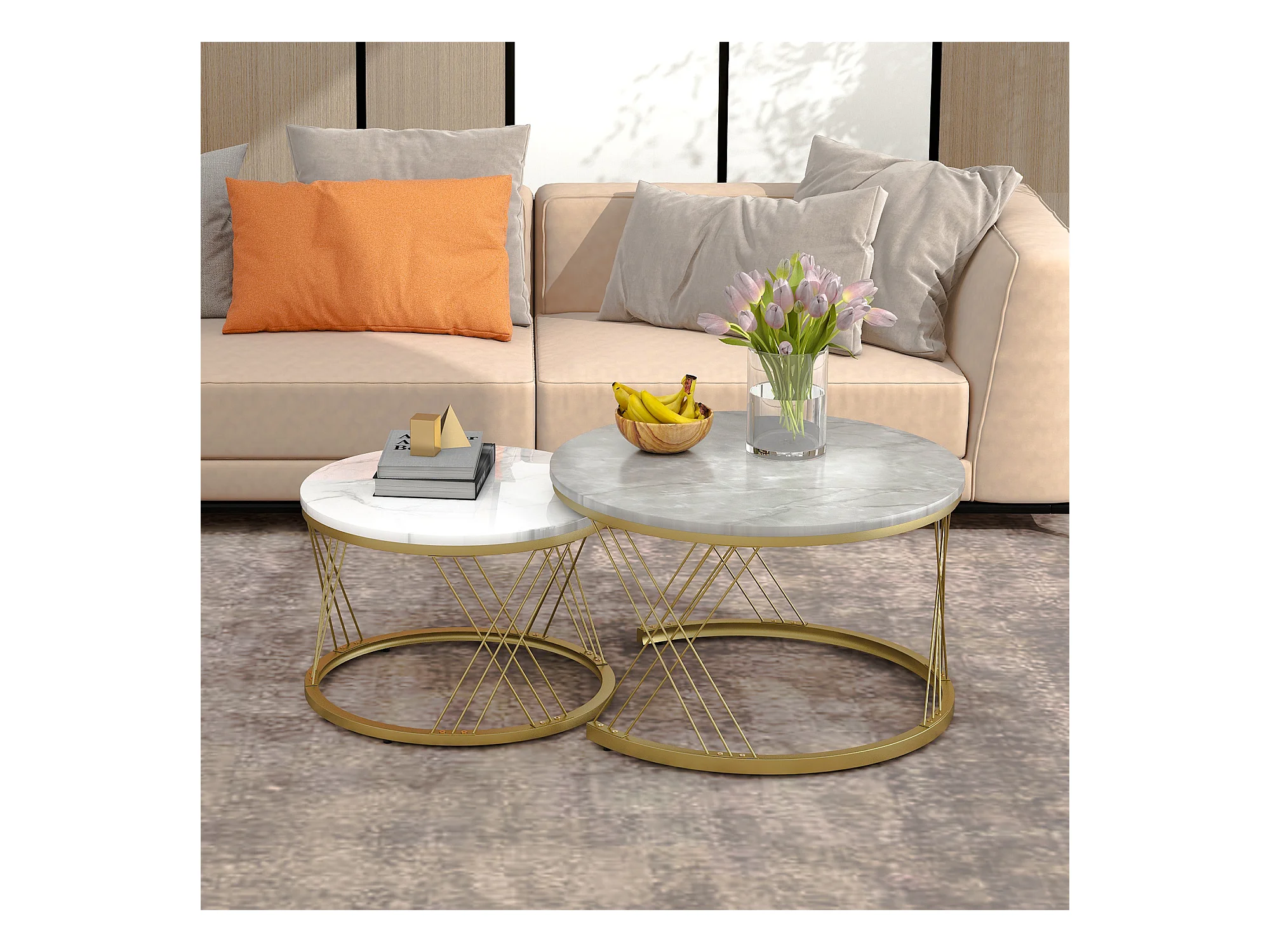 Table Basse Moderne Empilable – Set de 2 Tables Rondes avec Revêtement en Vinyle Marbré, Structure en Métal Doré, Pour Salon et Espaces Réduits