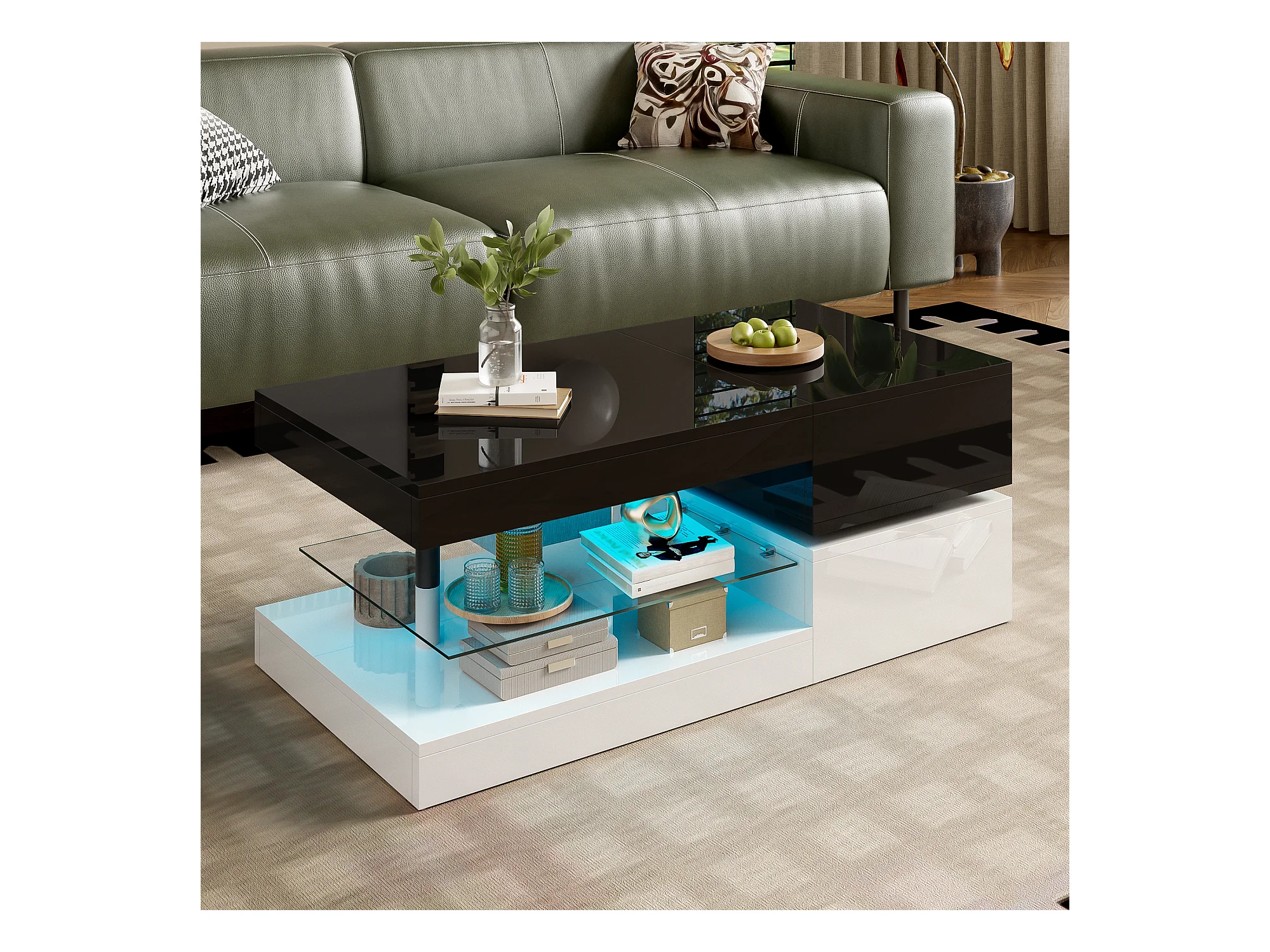 Table basse à deux niveaux avec LED 16 couleurs, finition brillante, étagère ouverte et tiroir coulissant, table centrale rectangulaire noire