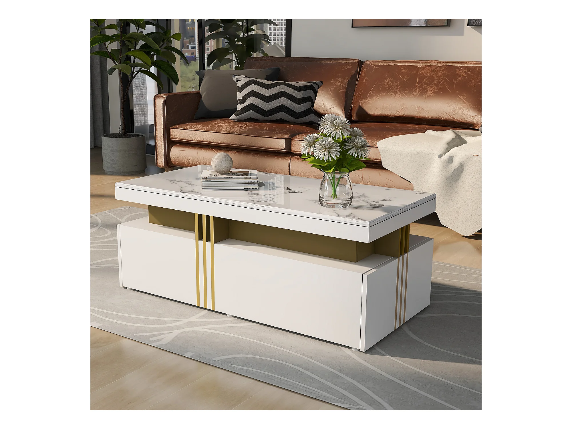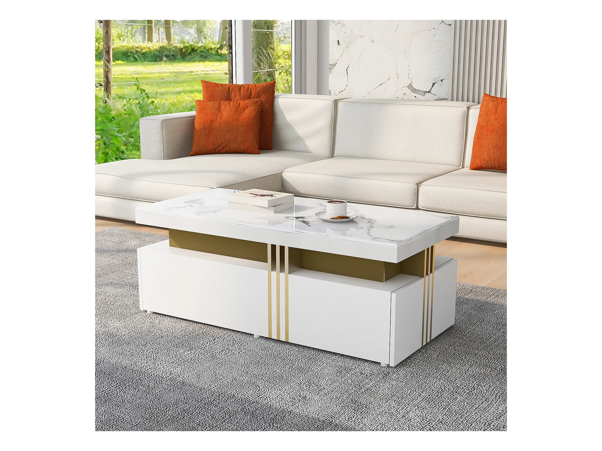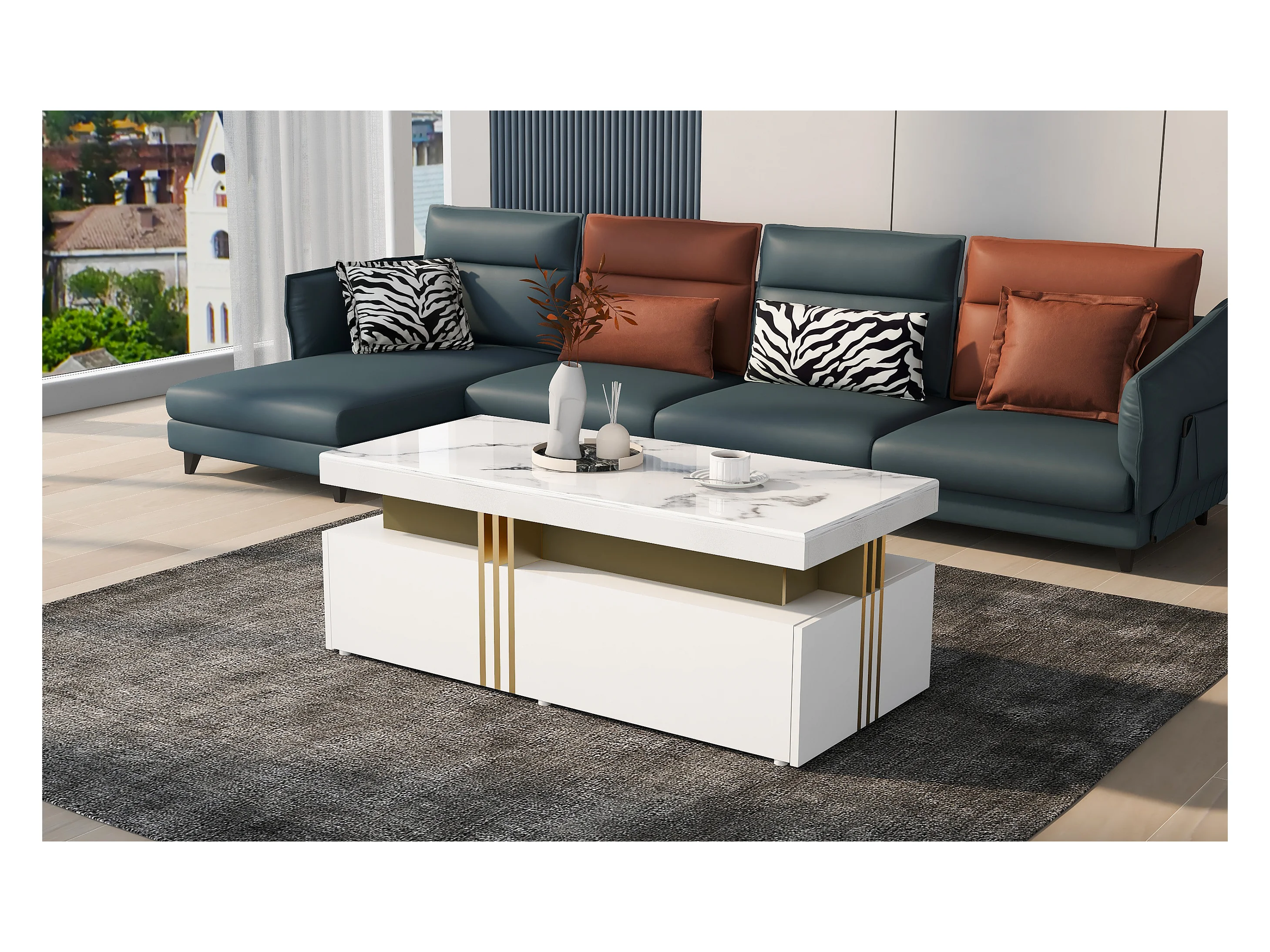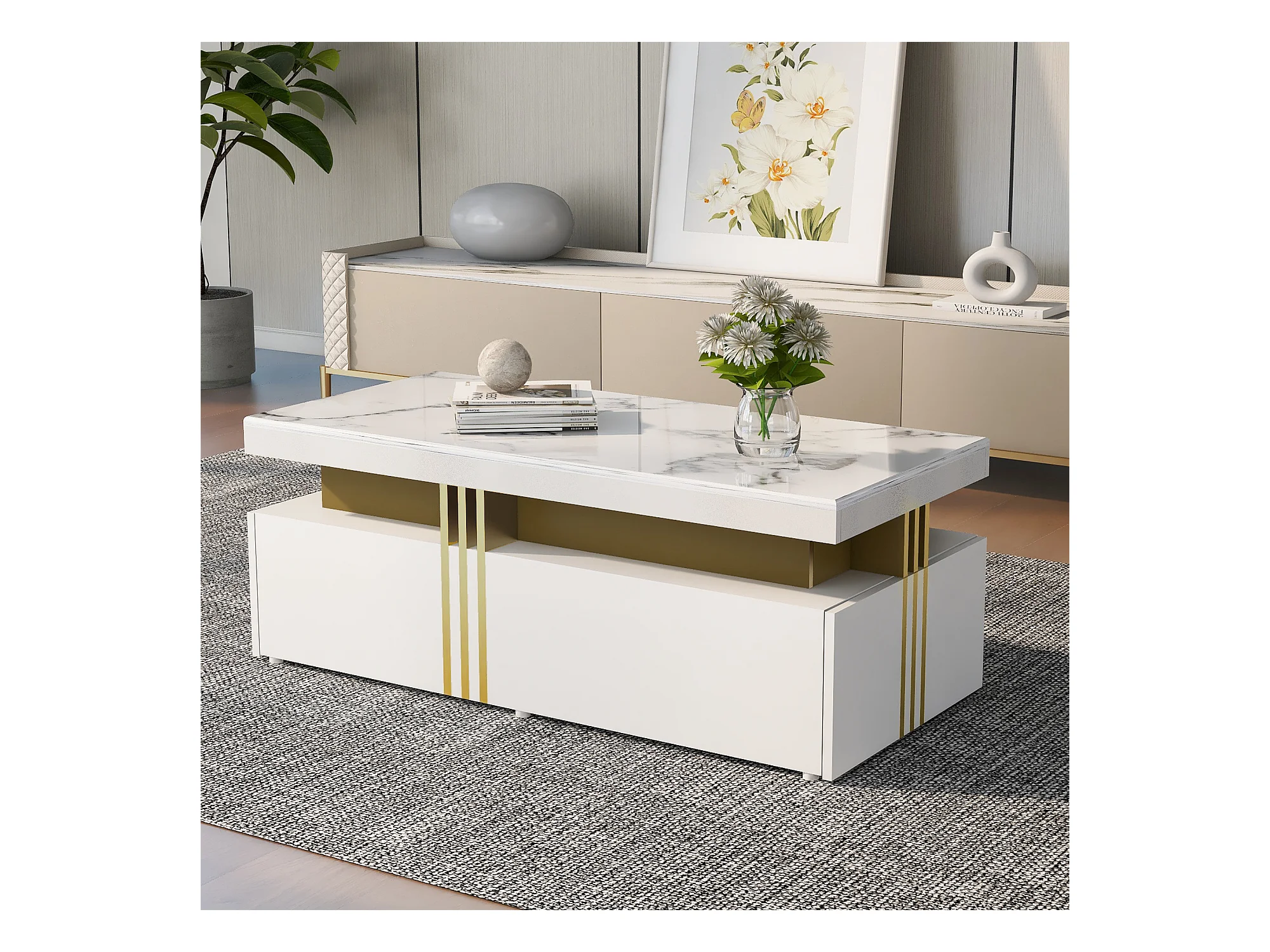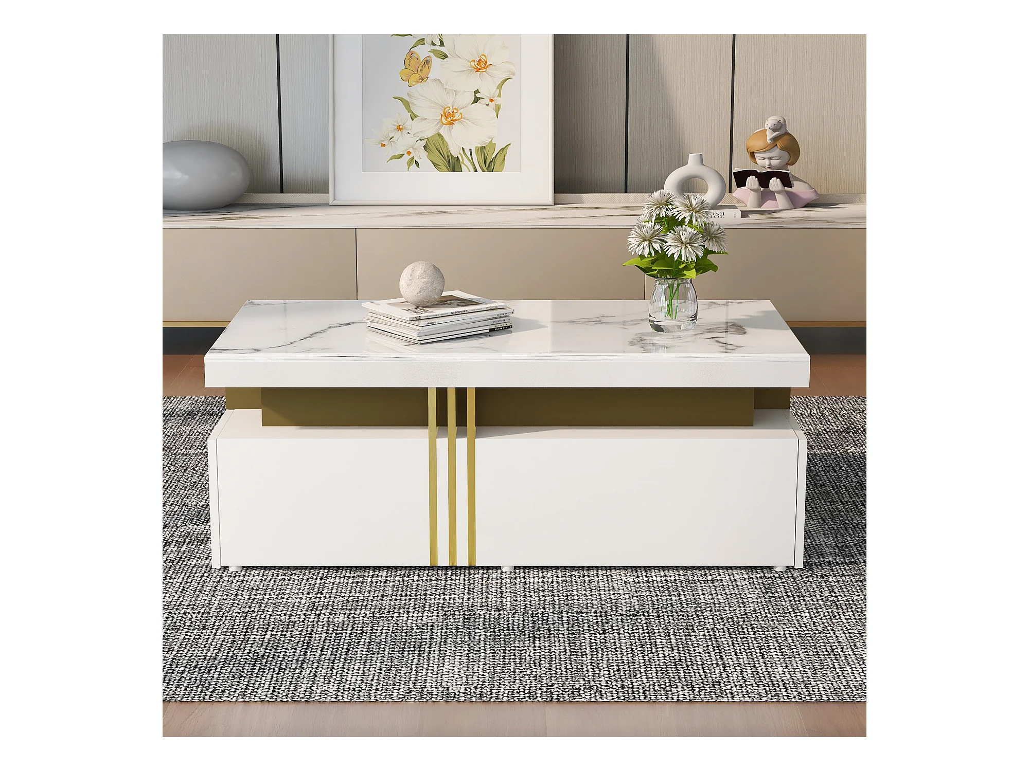 Table basse moderne rectangulaire avec plateau en pvc et 2 tiroirs en bois, 100*50*40 cm