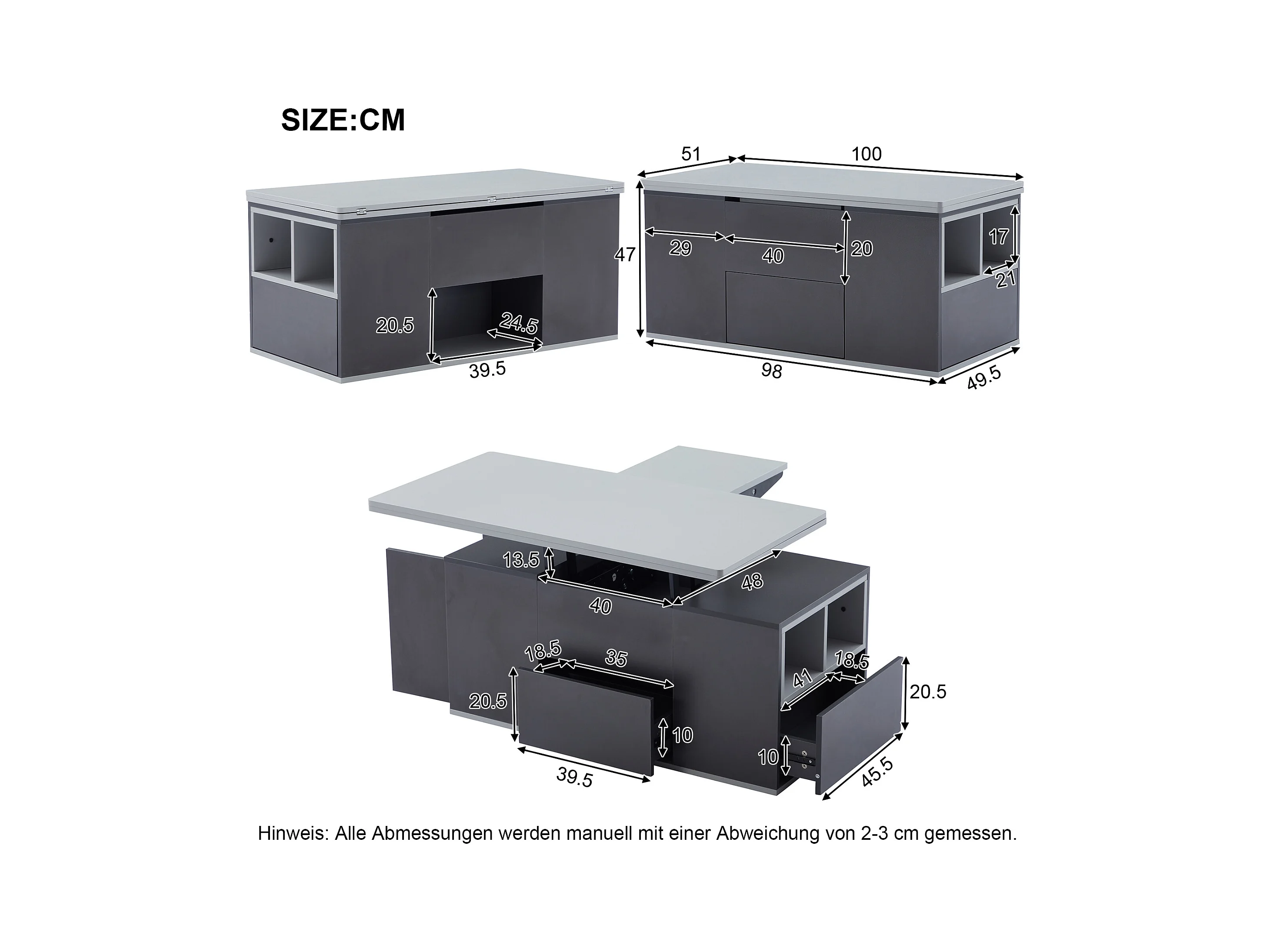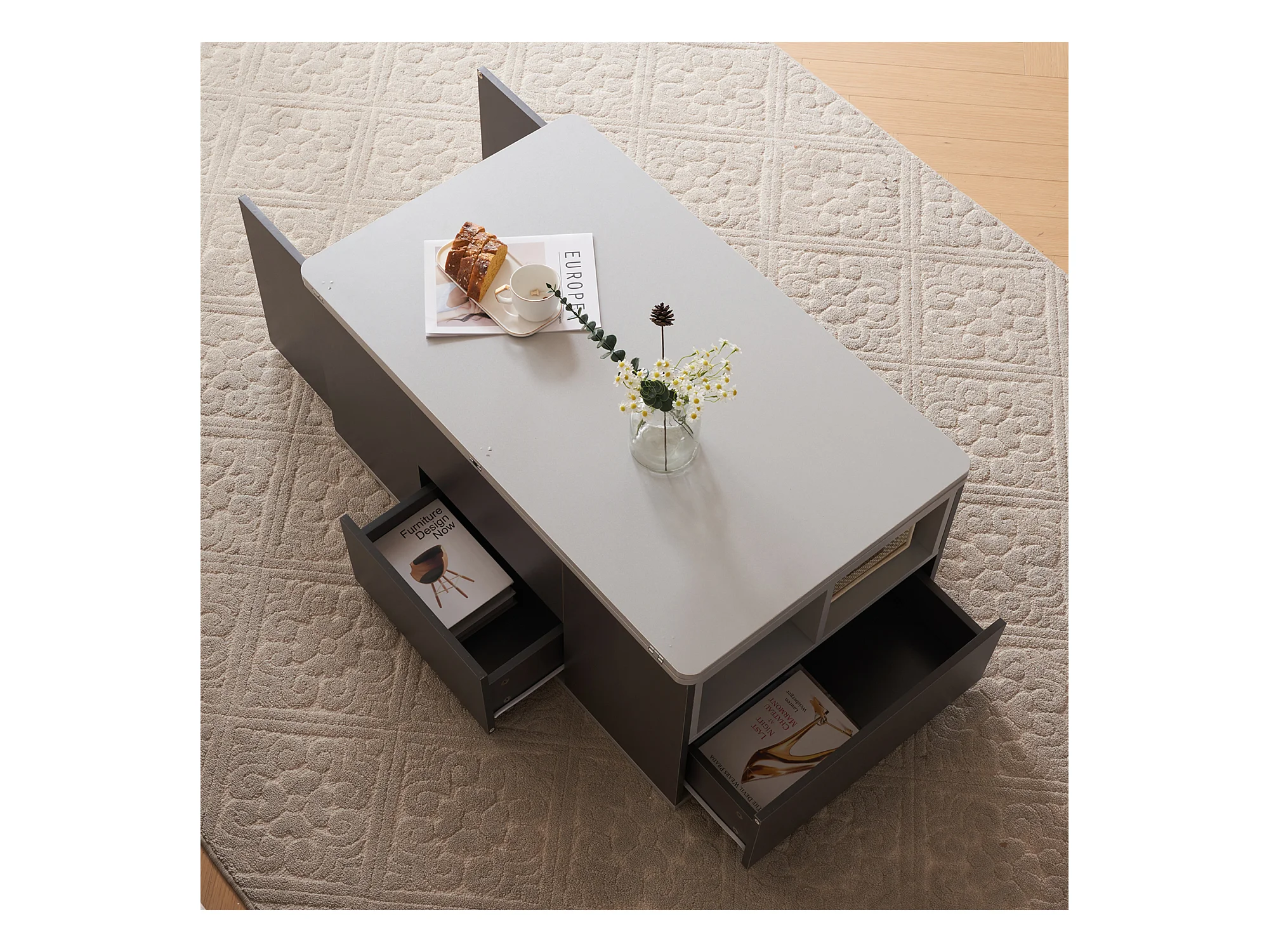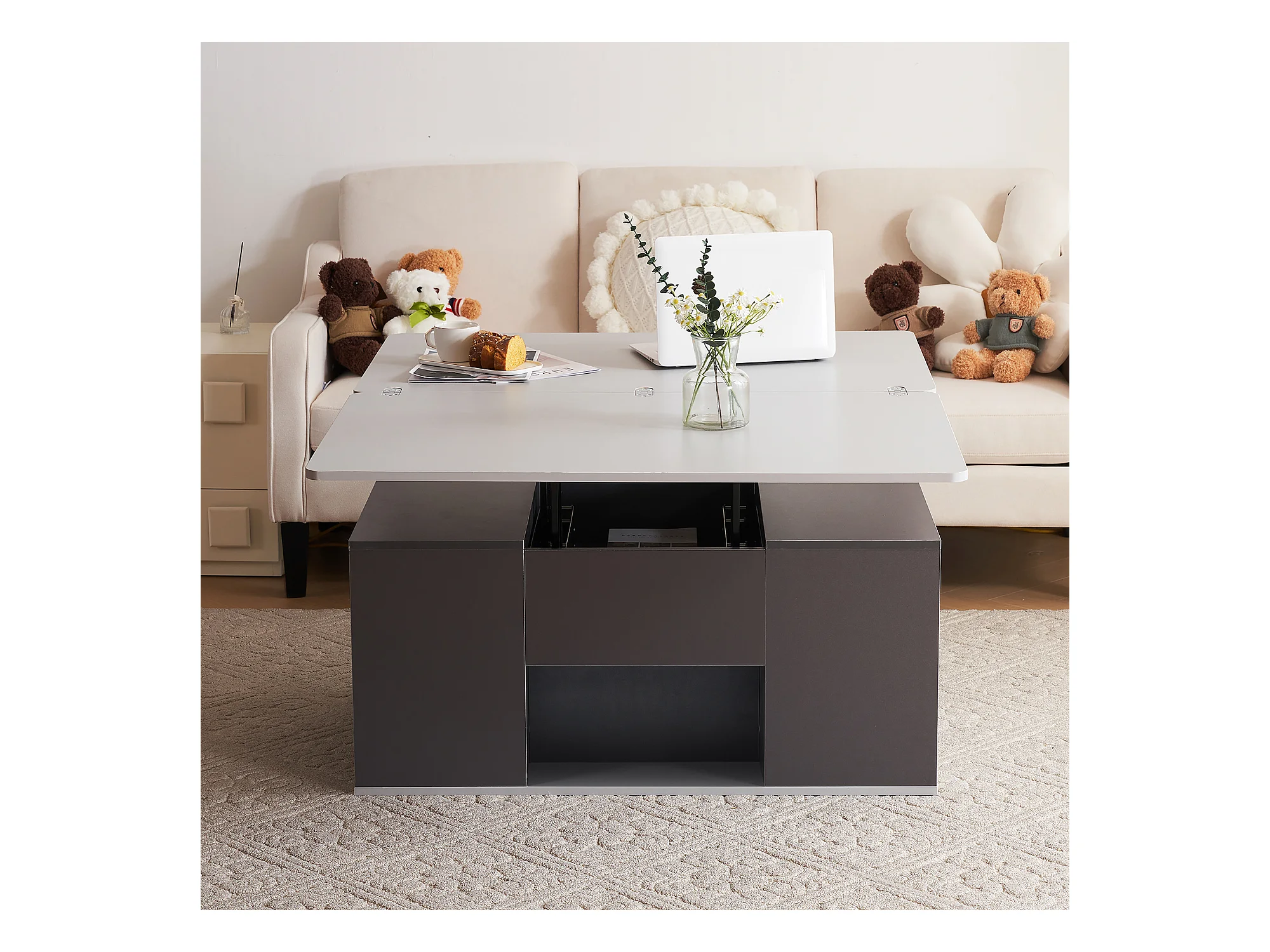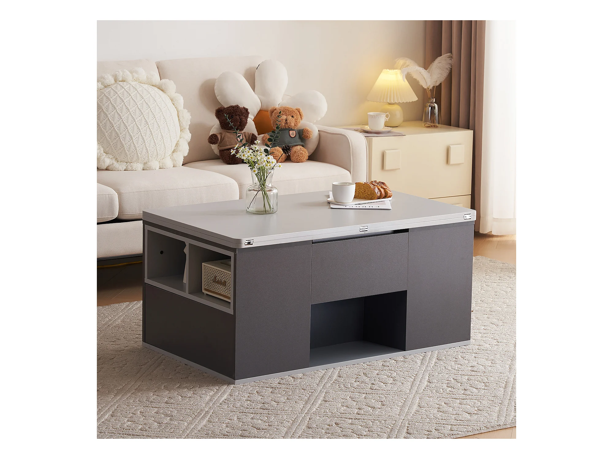 Table basse multifonction avec plateau réglable, s’ouvre en 2 tables, gris foncé + gris clair, grande capacité, meuble moderne salon.
