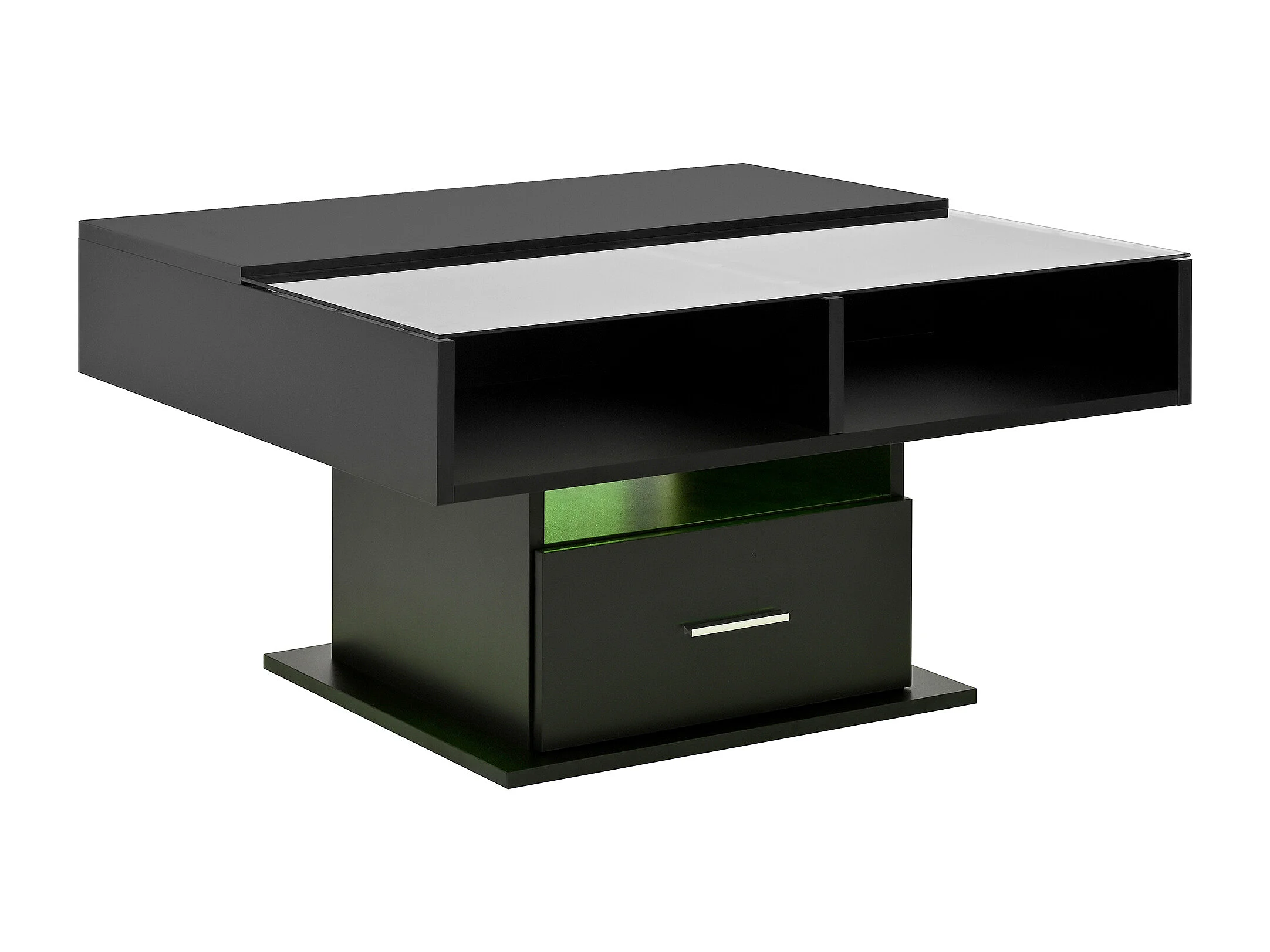 Table basse noire brillante avec plateau relevable et 2 tiroirs de rangement, éclairage LED