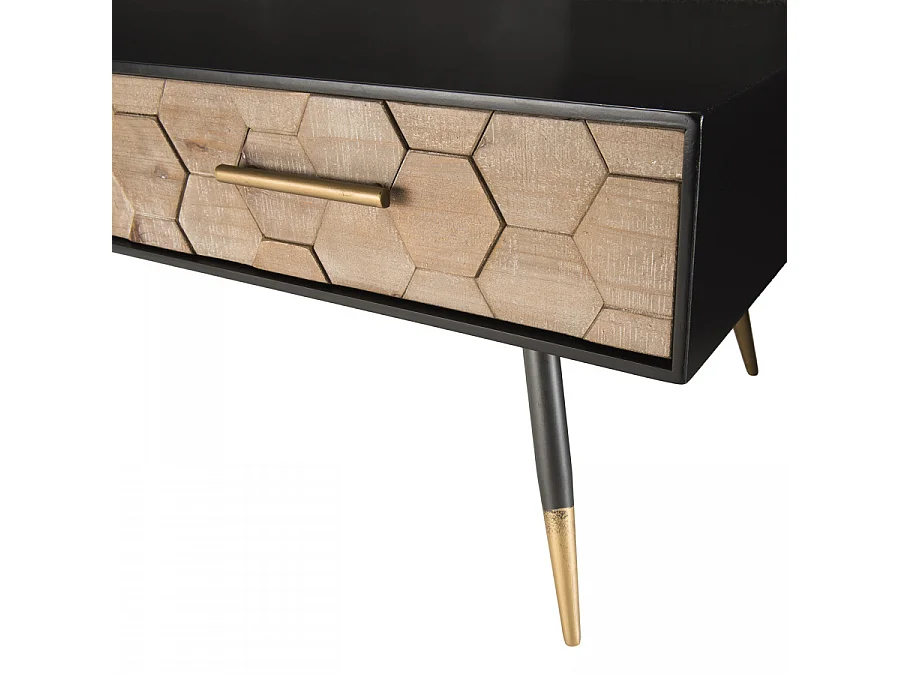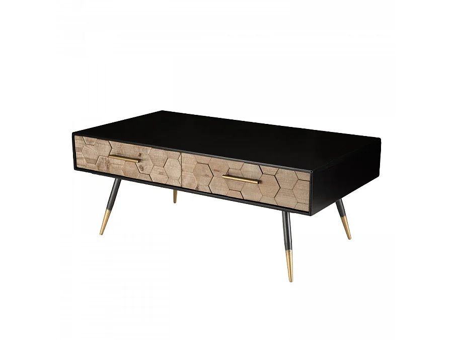DALIE - Table basse noire rectangulaire 2 tiroirs scandi bois sapin marqueté pieds métal doré