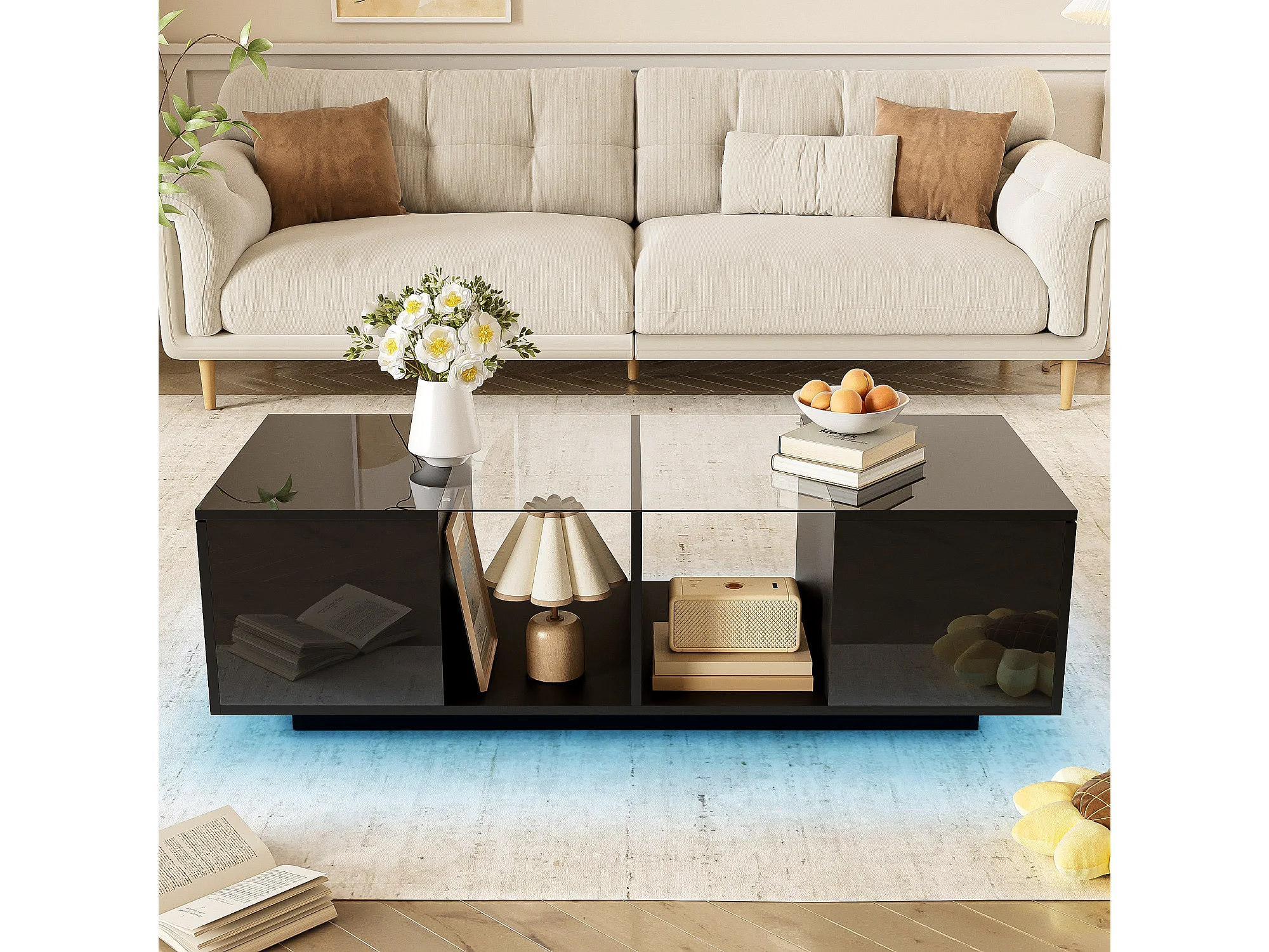 Table basse noire avec LED et rangement - Plateau finition brillant et central en verre