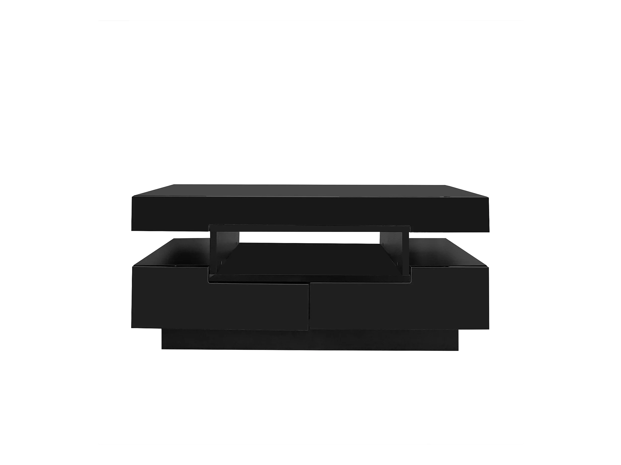 Table basse à deux niveaux avec LED 16 couleurs, finition brillante, étagère ouverte et tiroir coulissant, table centrale rectangulaire noire
