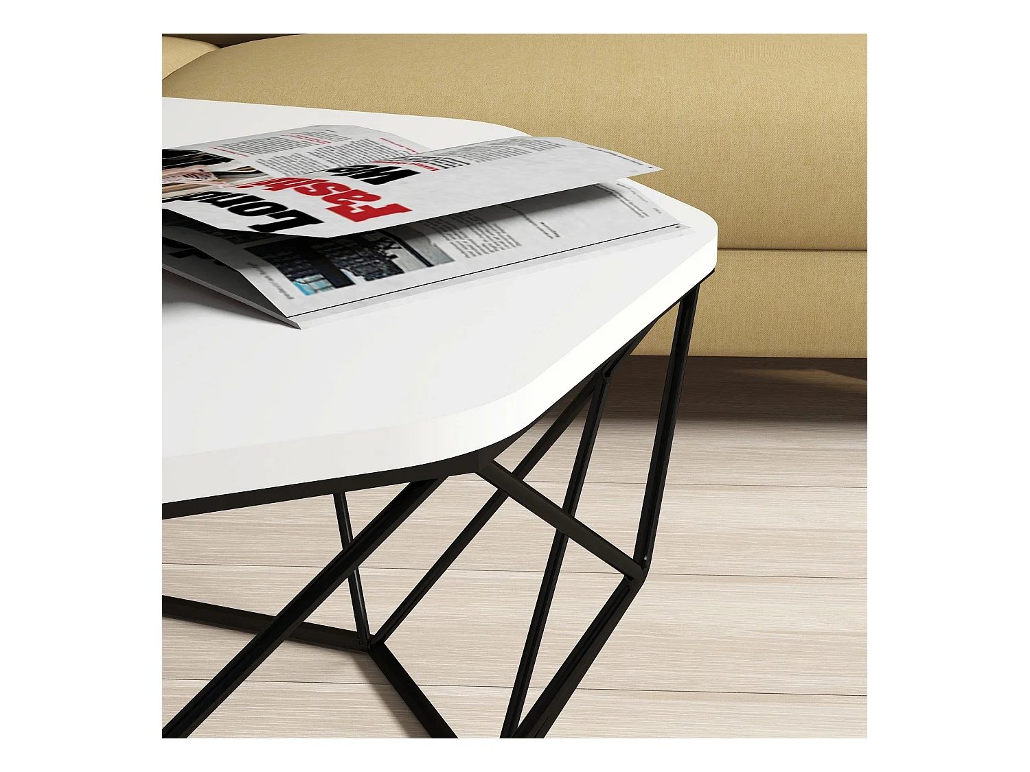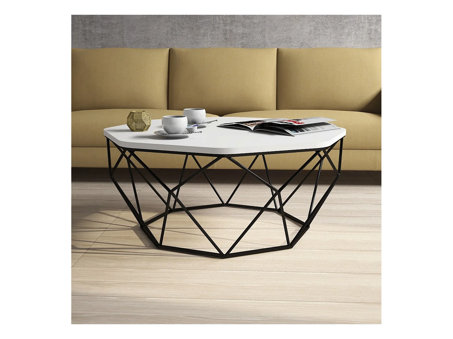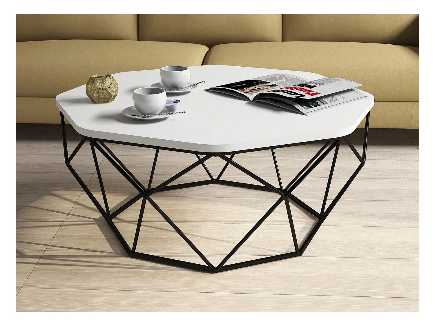 Table basse octogonale bois blanc et pieds acier noir Diva 90cm