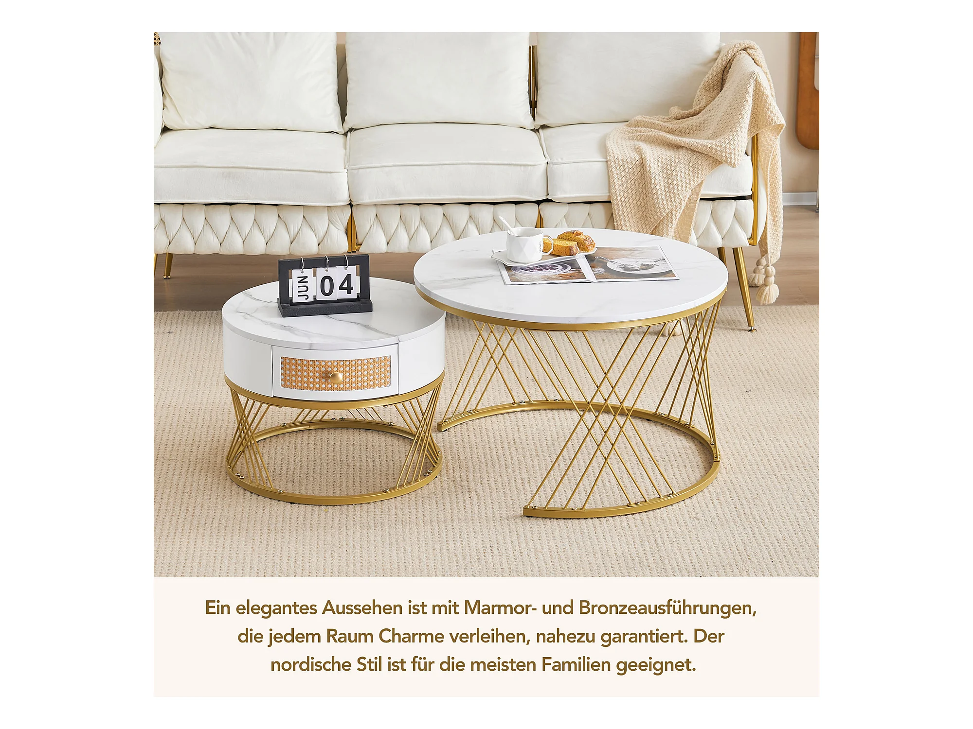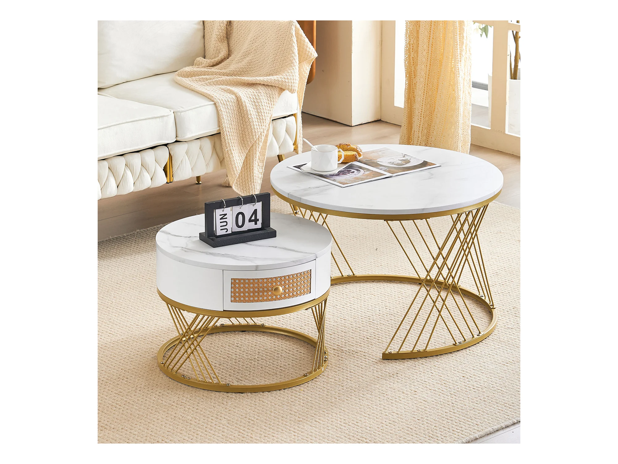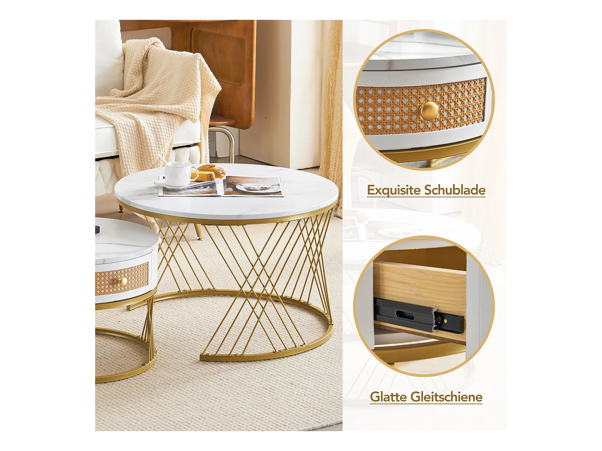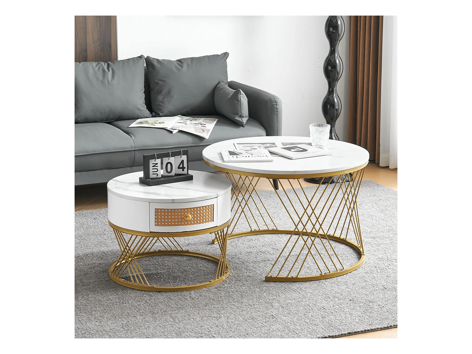 Table basse ovale en marbre avec structure en fer doré, tiroirs et étagères