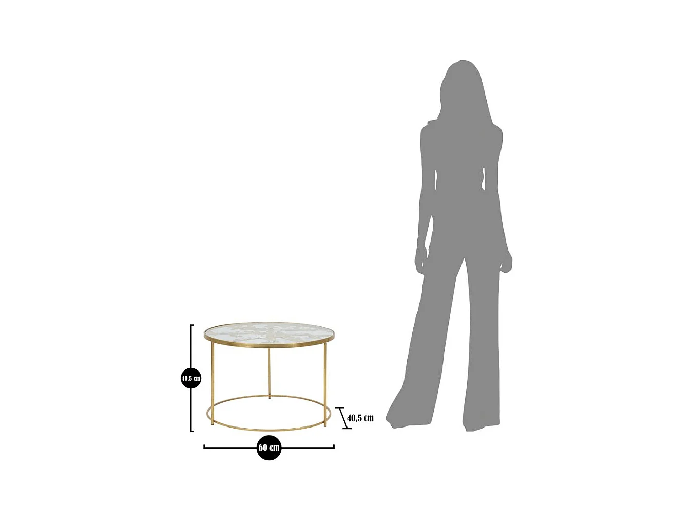 Table basse design avec plateau style marbre de 60 cm de diamètre et structure en acier doré Melba