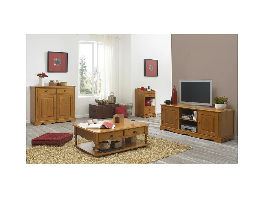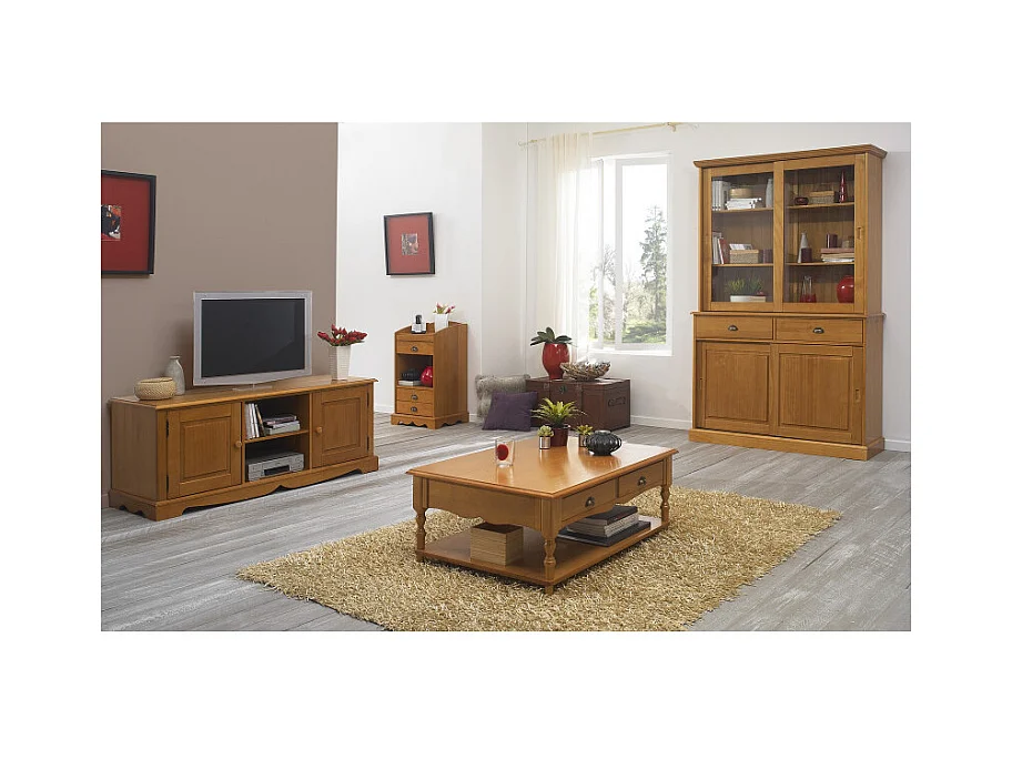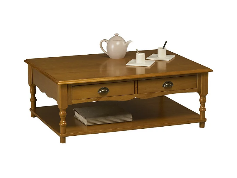 Table Basse Rectangle Pin Miel Style Anglais 2 Tiroirs 1 Niche L 100 H 38 P 70 cm