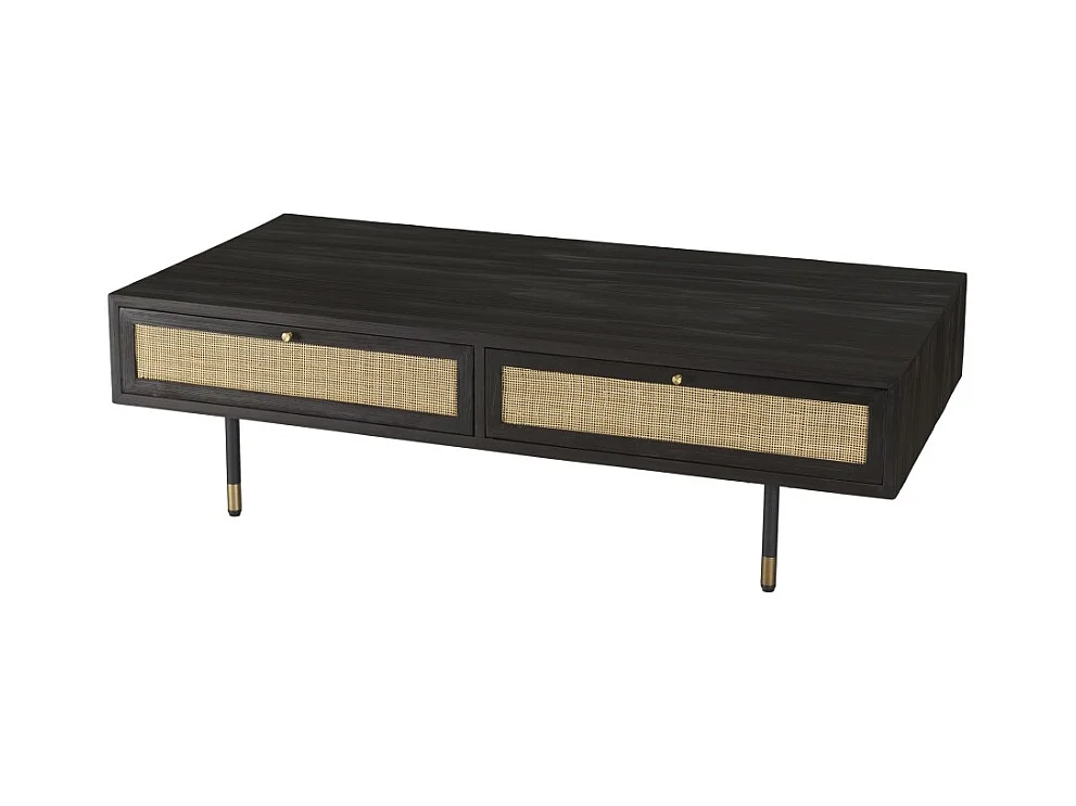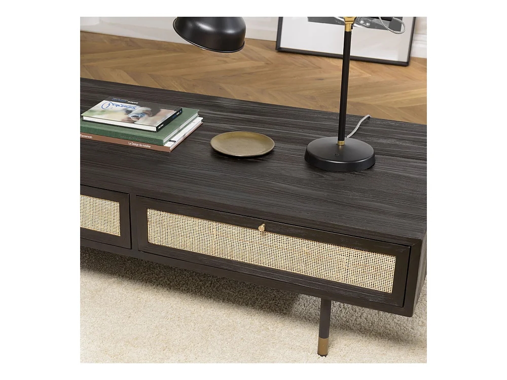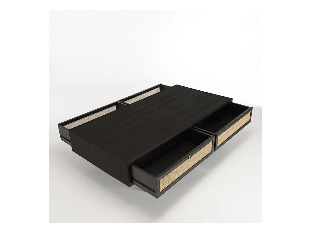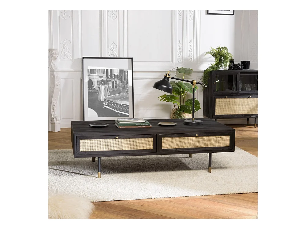 YANIS - Table basse noire bois Pin 4 tiroirs cannage