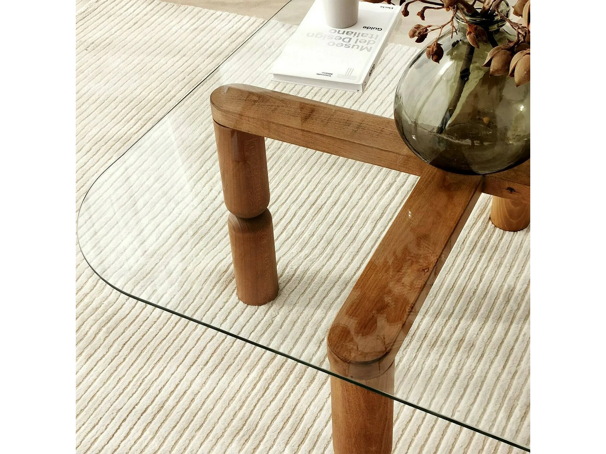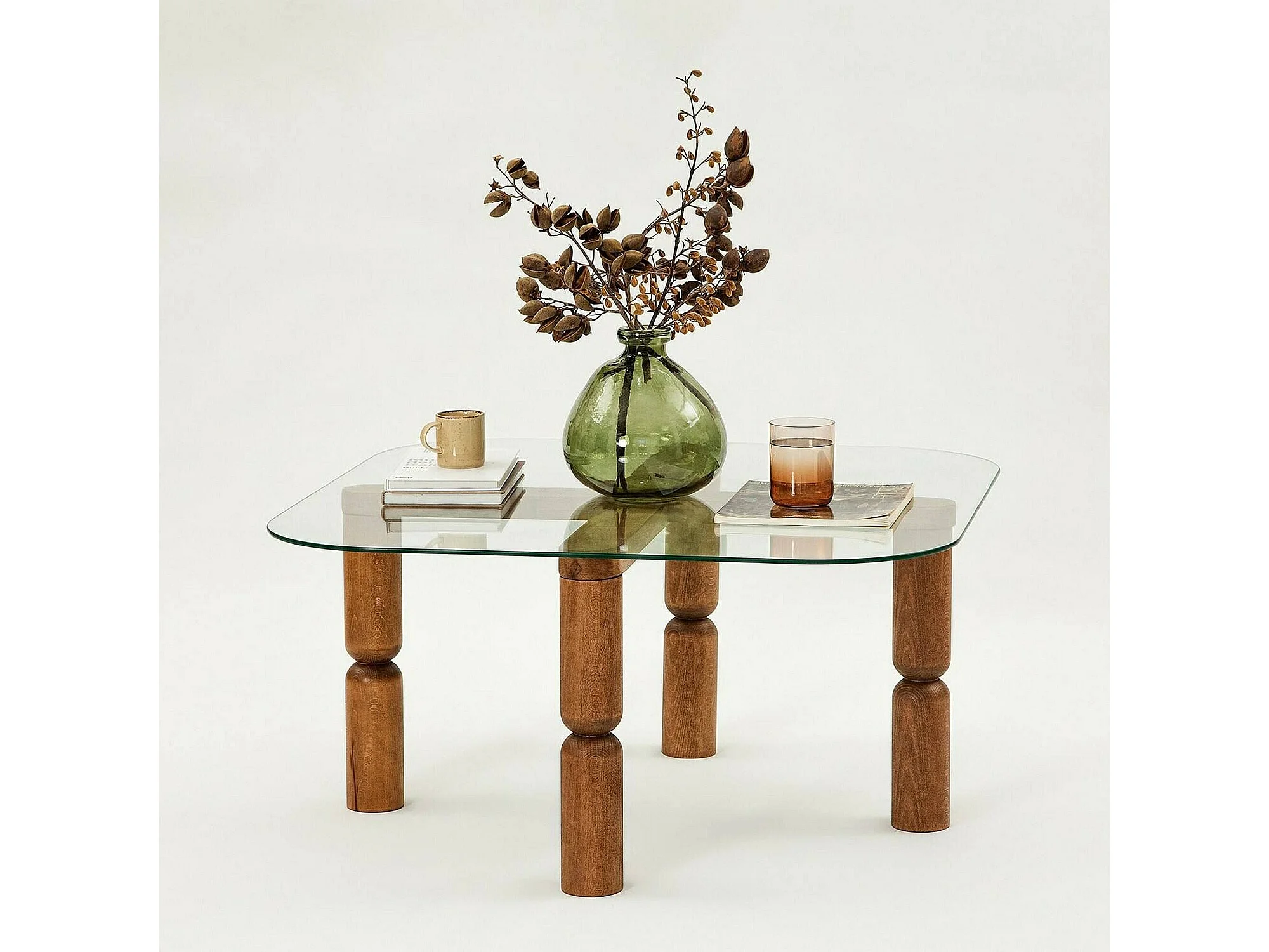 Table basse Psamathe, Table basse, Porte-revues pour canapé, Etagère de salon, 80x80h40 cm, Noyer et Transparent