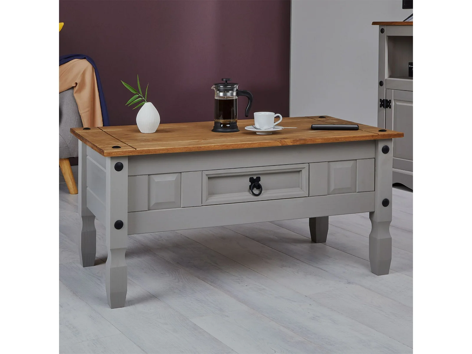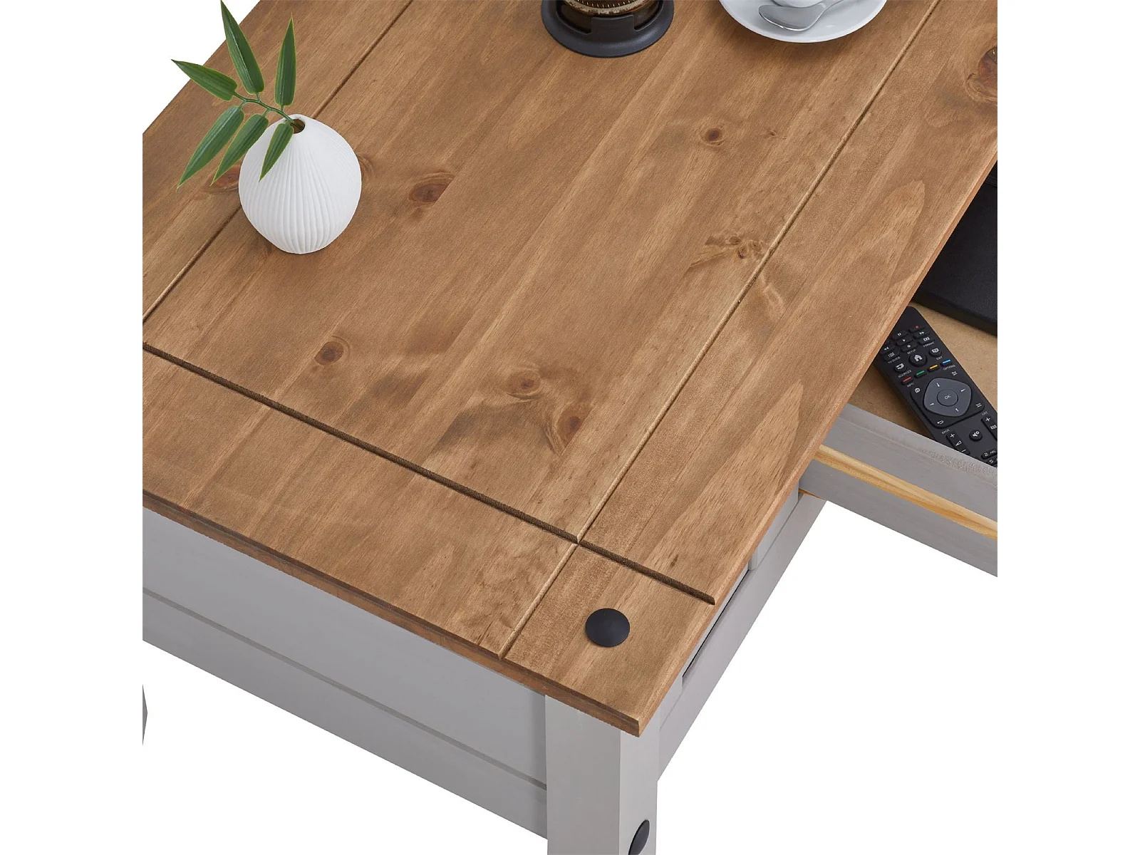 Table basse RAMON table d'appoint rectangulaire en pin massif gris et brun avec 1 tiroir, meuble de salon style mexicain en bois