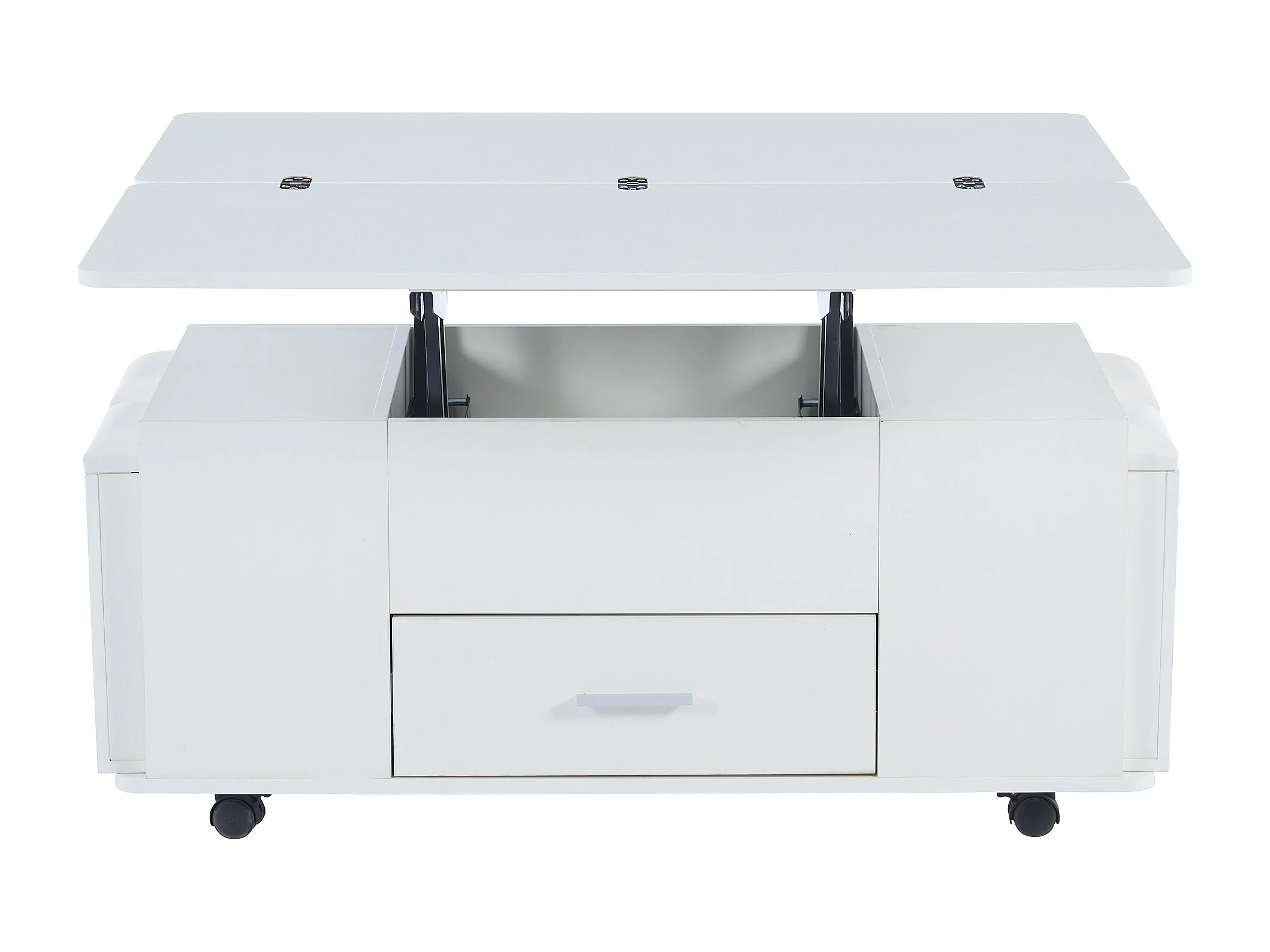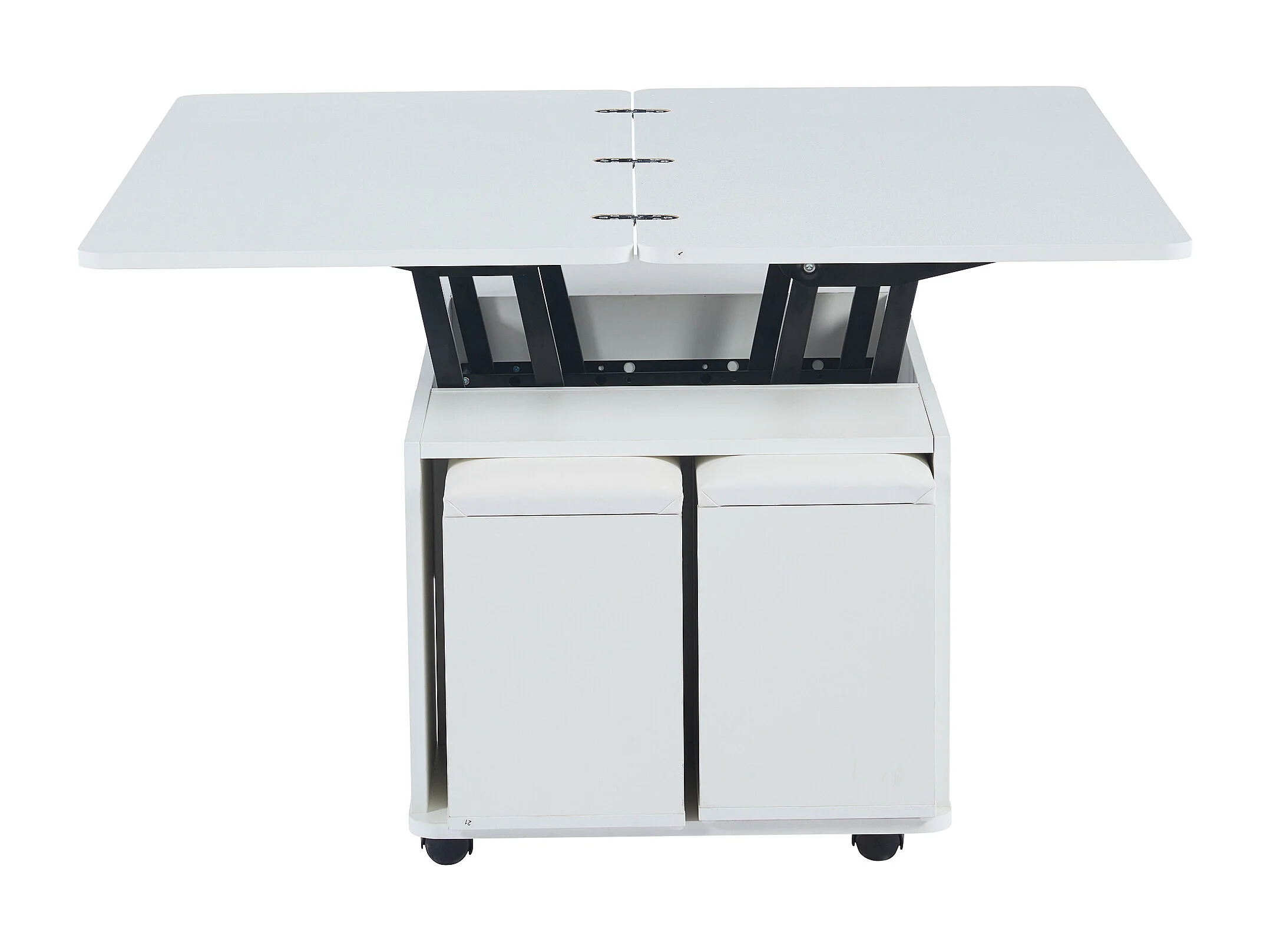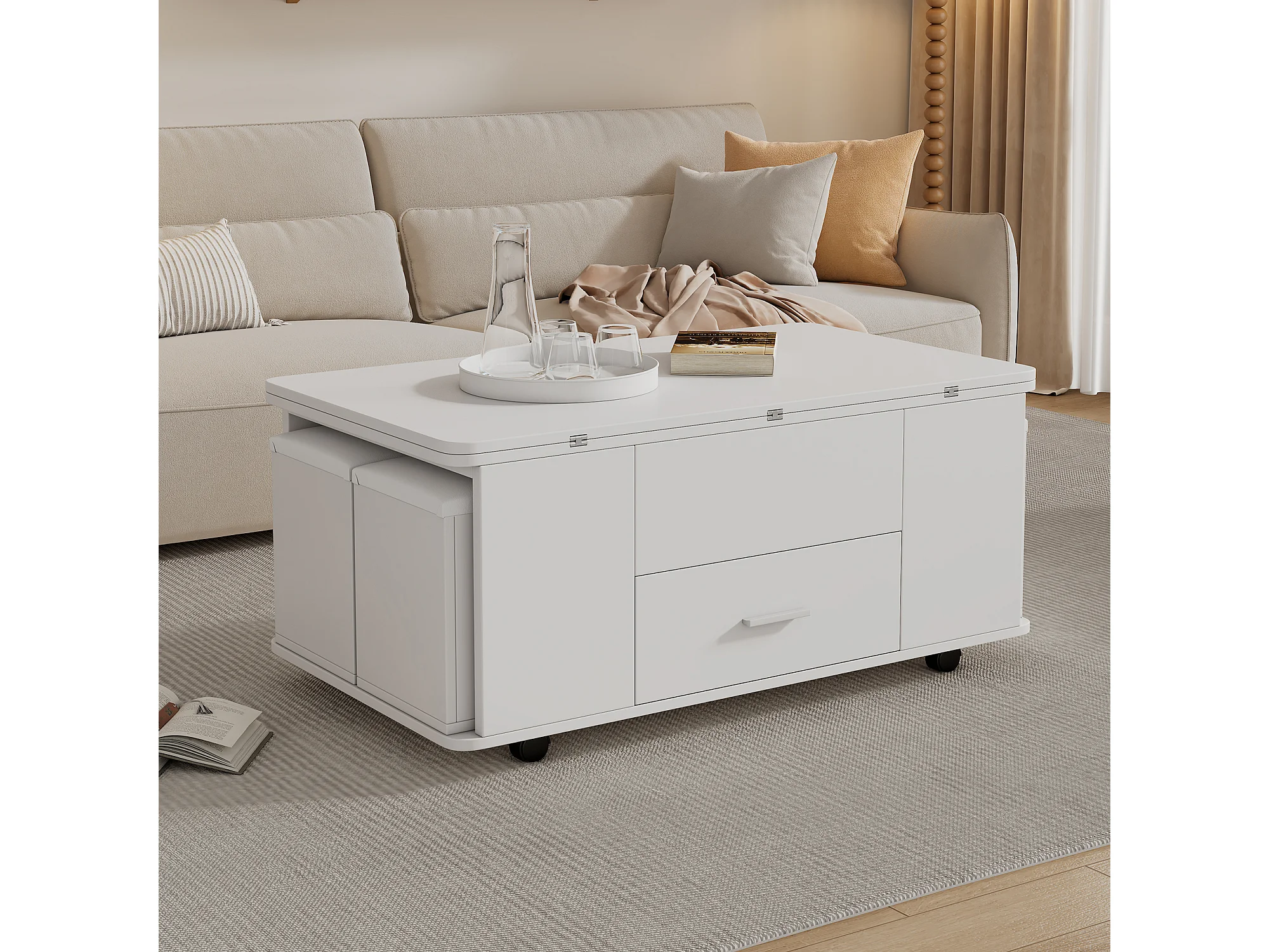 Table basse rectangle à roulettes 100x50x45cm avec plateau relevable et 1 tiroir, 4 tabourets intégrés, blanc
