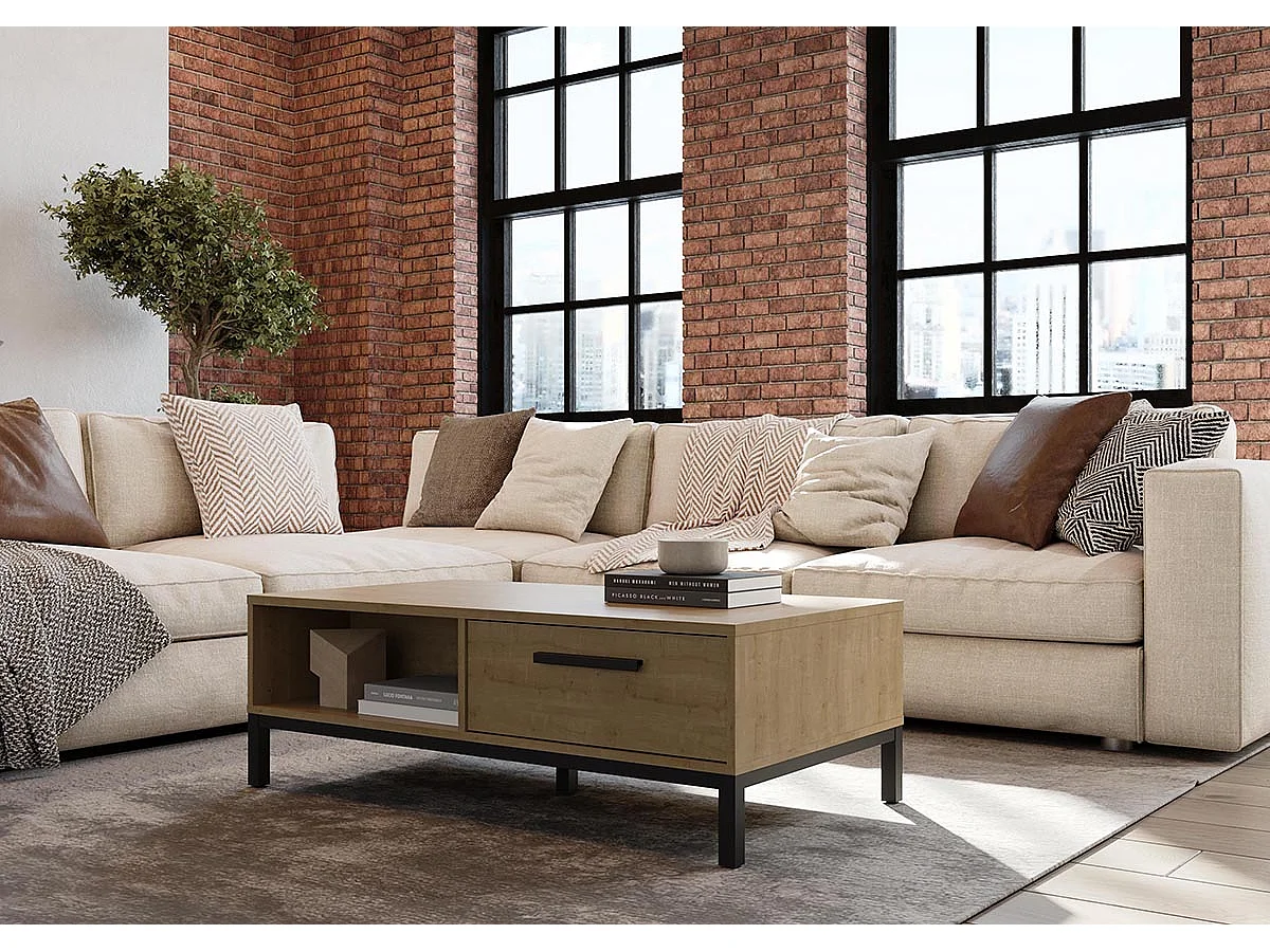Table basse rectangulaire avec rangement 2 niches 2 tiroirs couleur chêne / noir mat - Largeur 110,4 x Profondeur 60 x Hauteur 36,9 cm