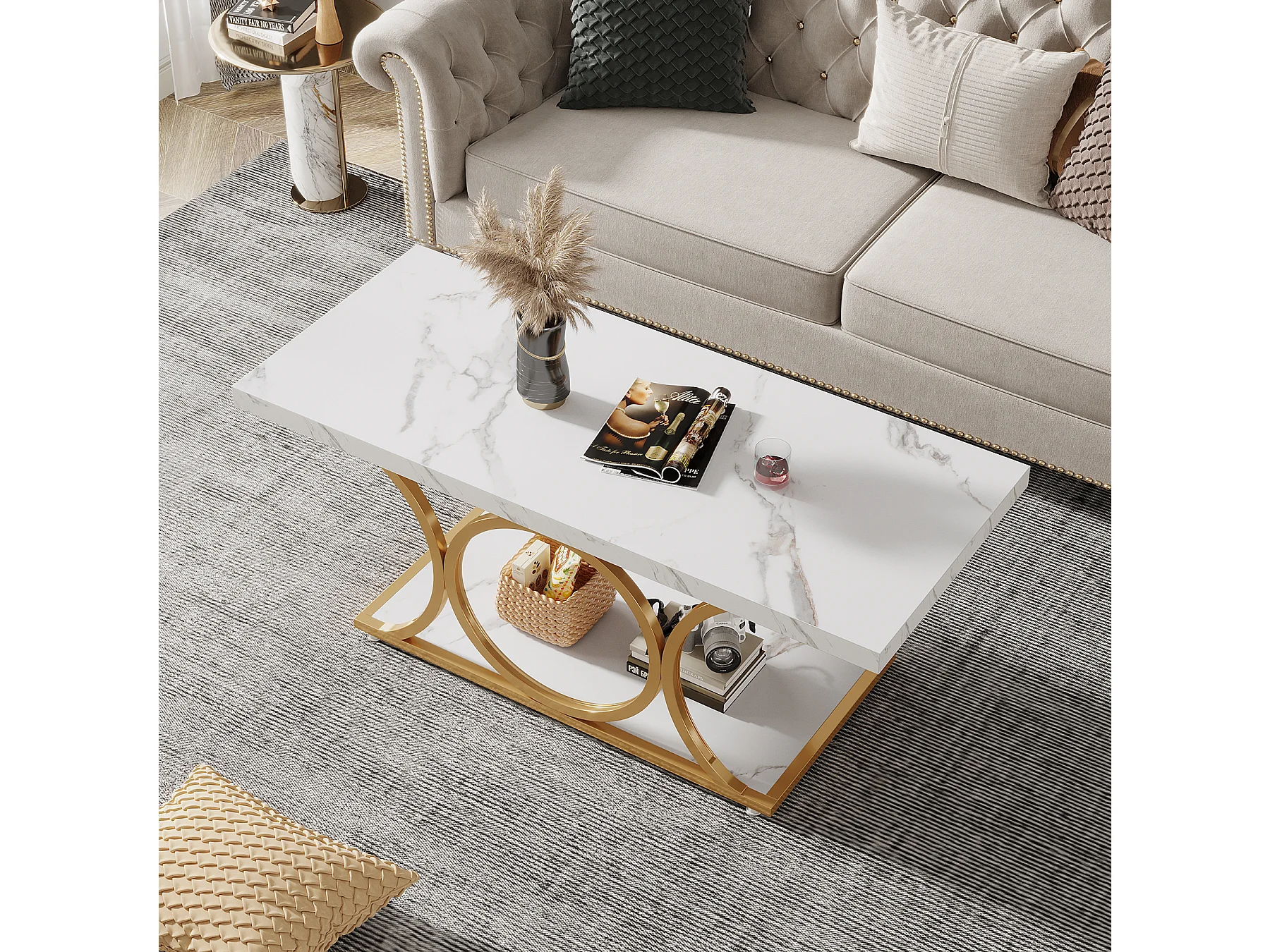 Table basse rectangulaire de 118 cm, placage imitation marbre, table basse moderne à 2 niveaux pour salon