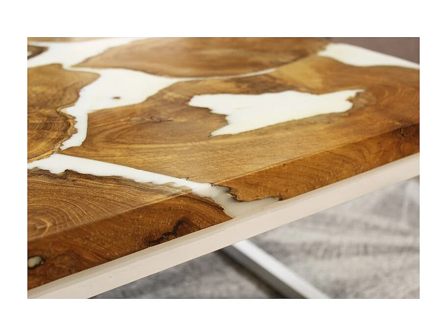 Table basse 110 cm en teck et résine blanche pieds métal - PAULETTE