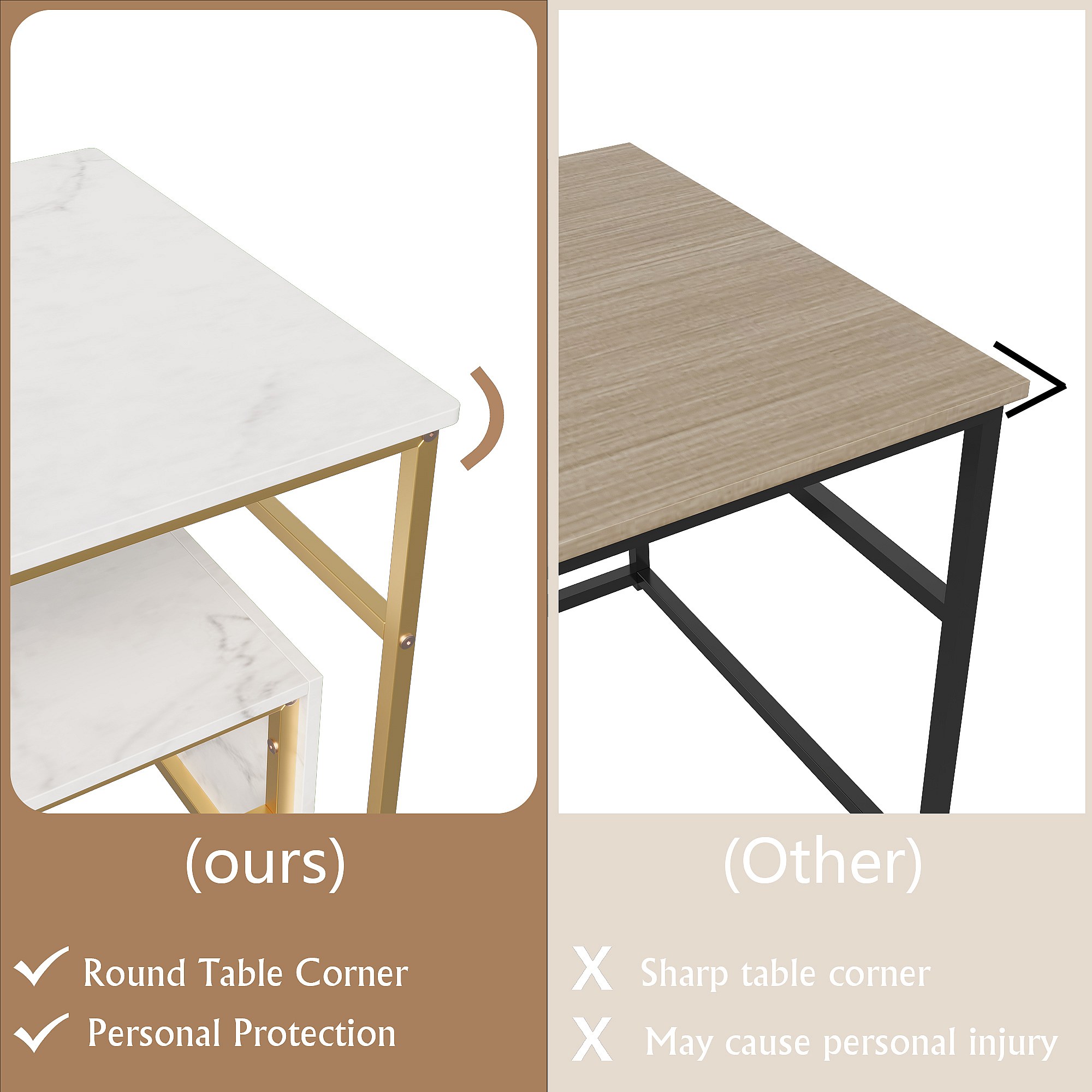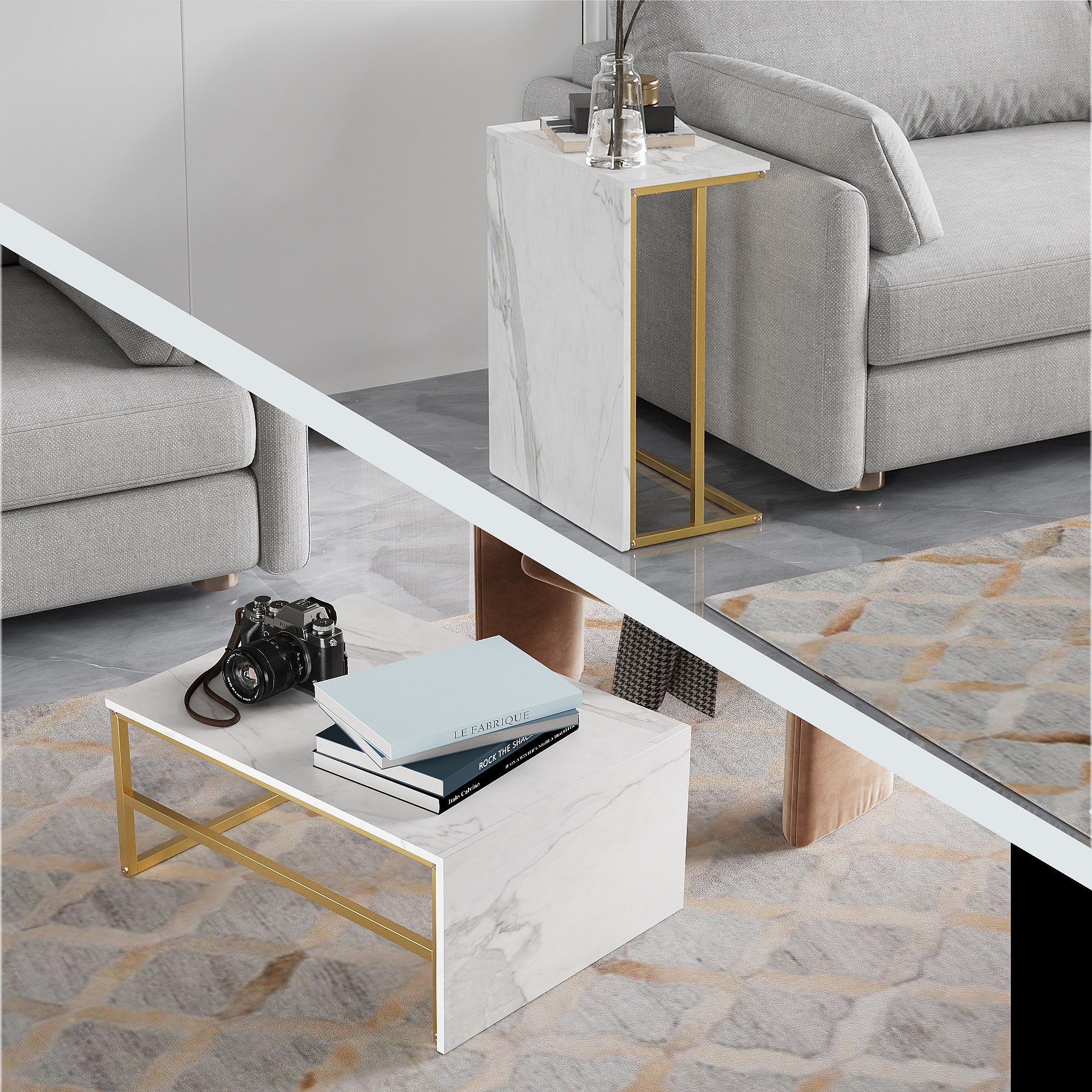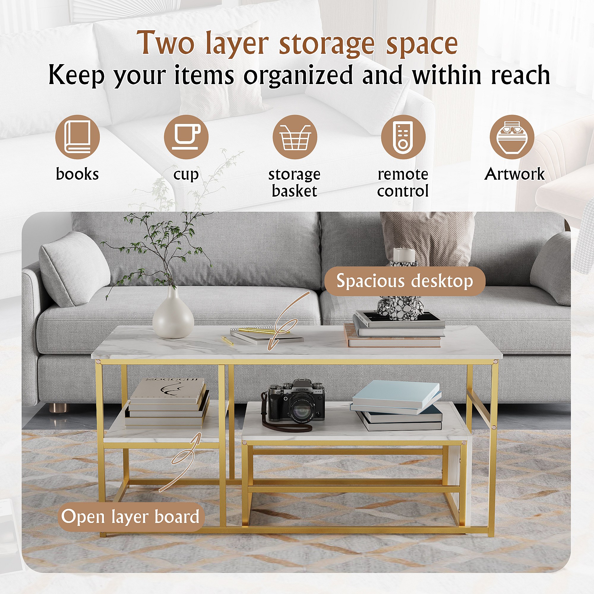 Table Basse Rectangulaire,Lot de 2 Tables Basses Gigognes,Table Basse Effet Marbre,Facile à Assembler,Utilisation Multifonctionnelle, Doré + Blanc