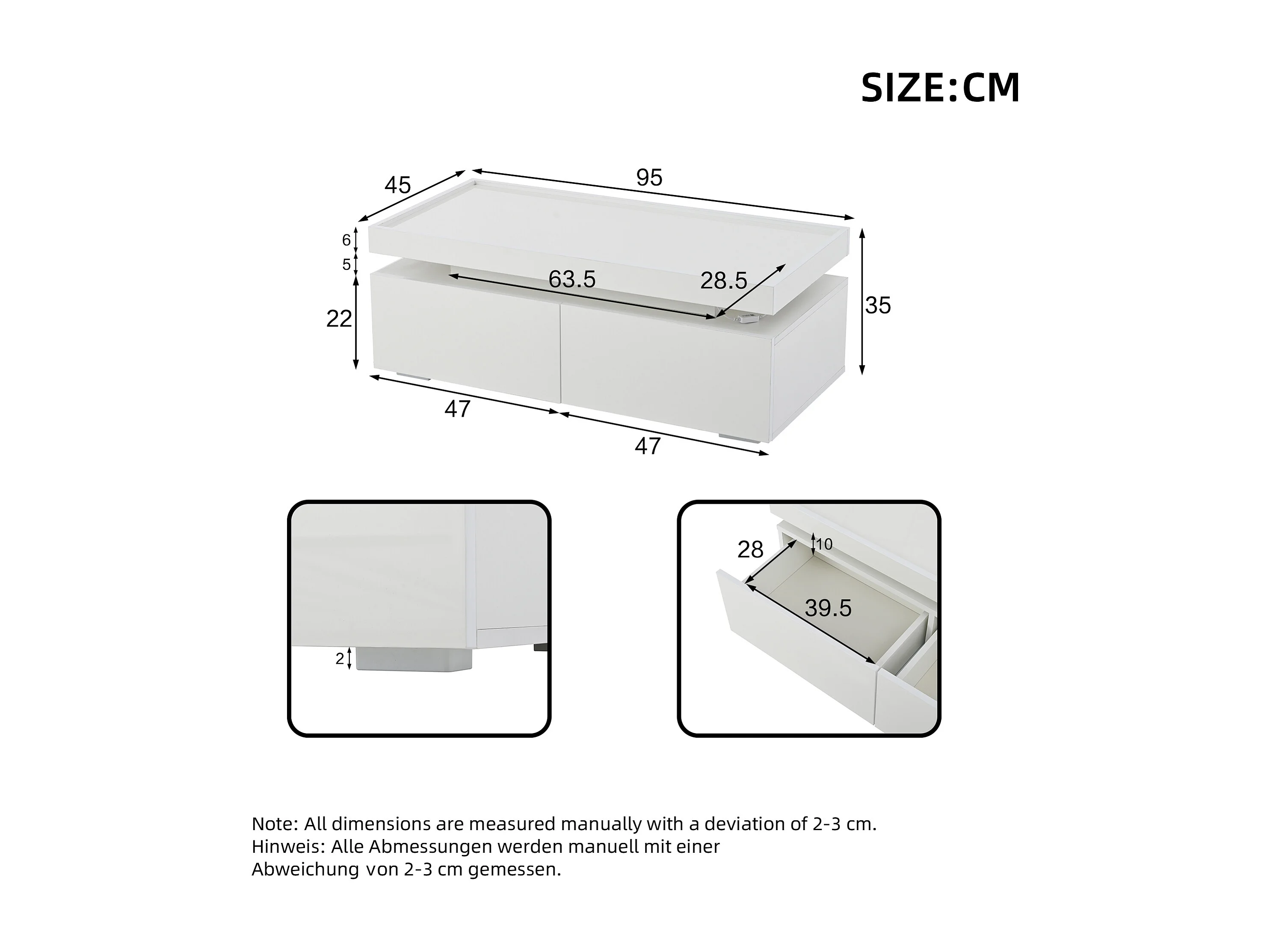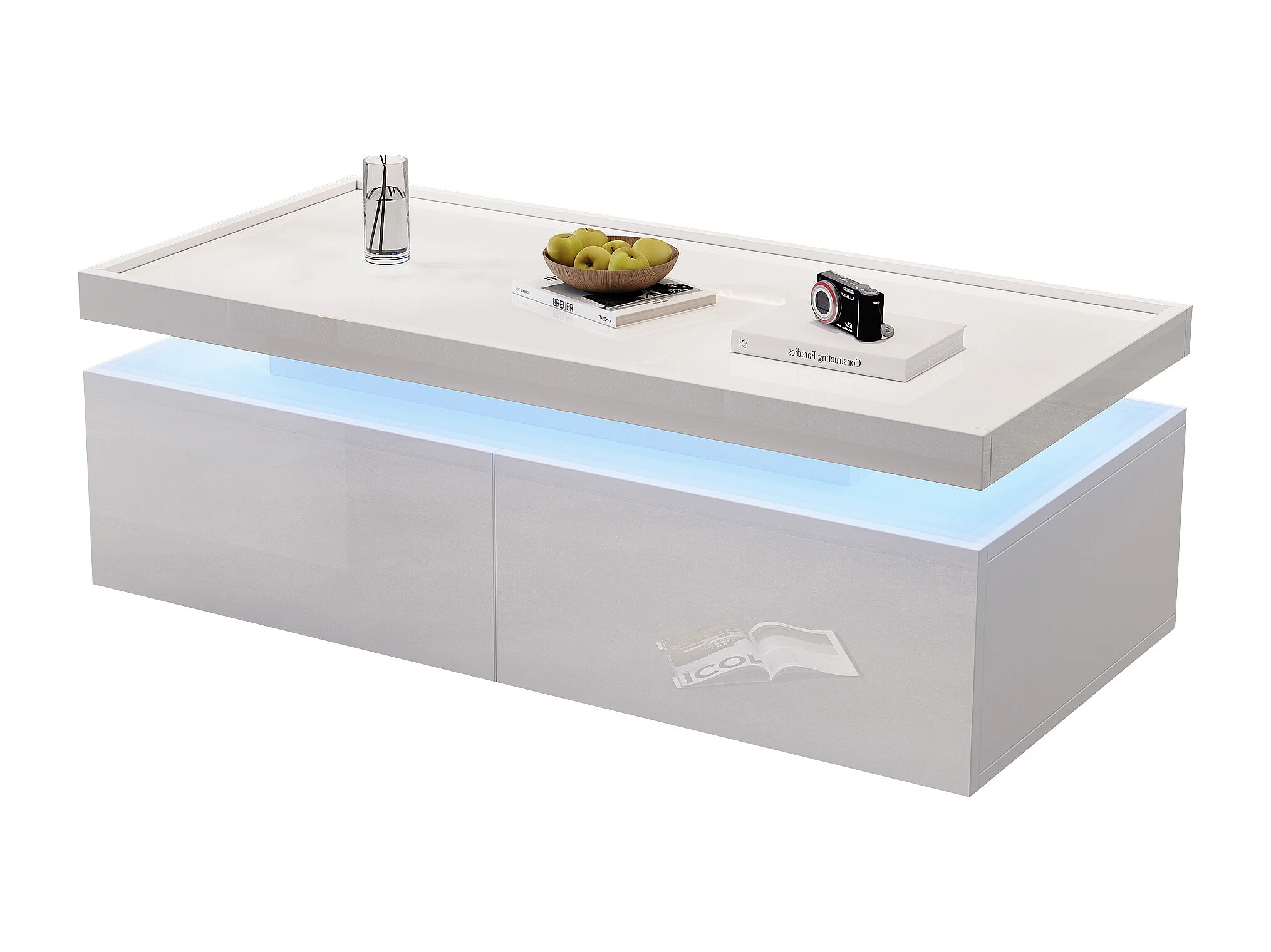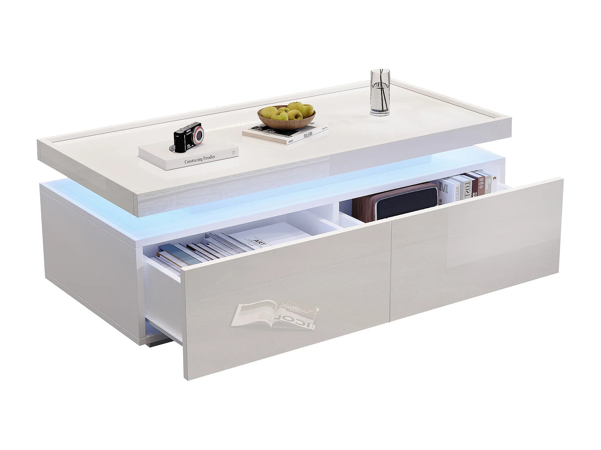 Table basse rectangulaire moderne - Table basse à 2 tiroirs avec éclairage LED - plateau brillant - blanc