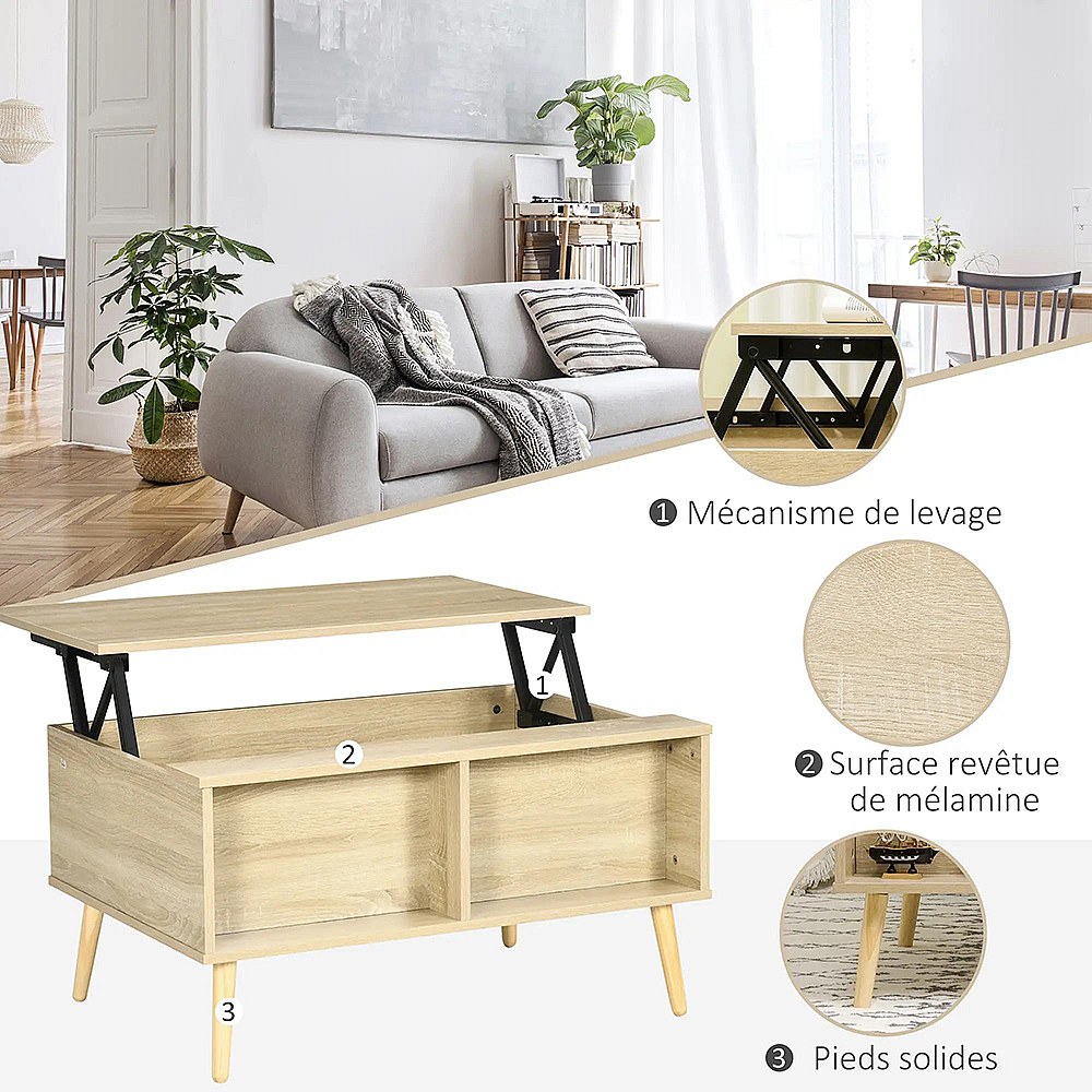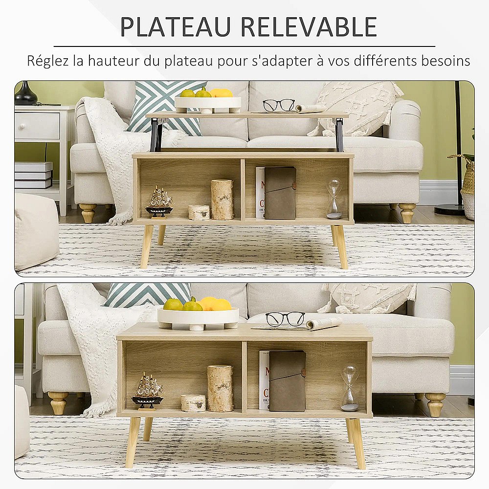 Table basse plateau relevable table de salon avec étagères et compartiment bois chêne