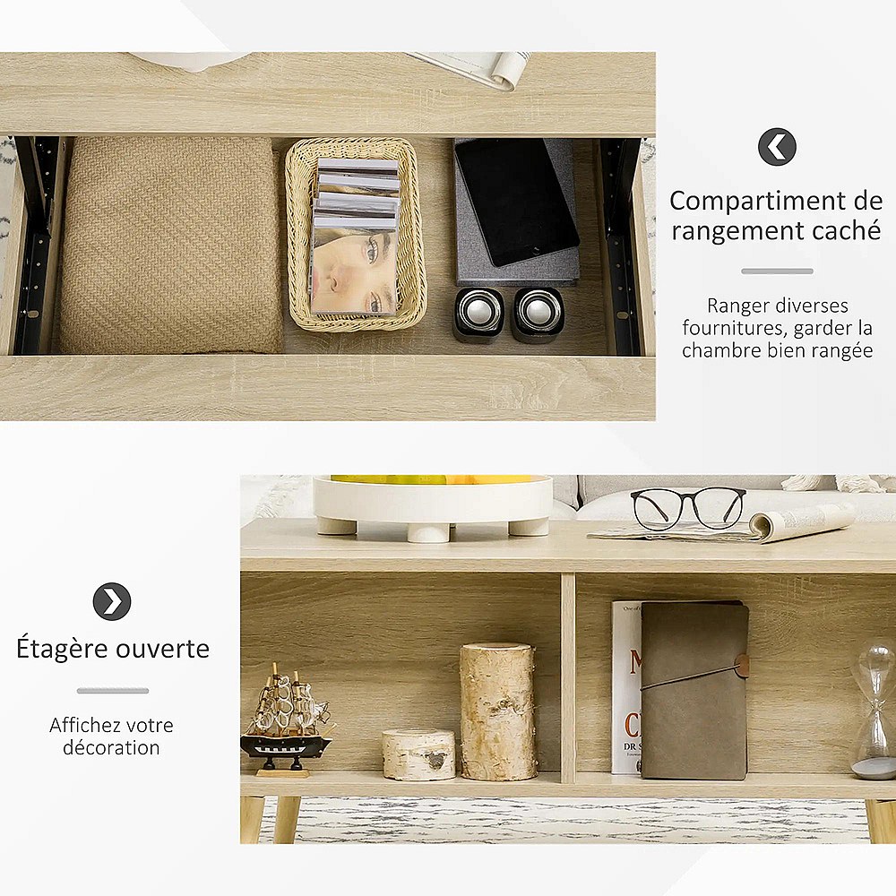 Table basse rectangulaire table de salon plateau relevable 2 niches coffre en bois bois clair