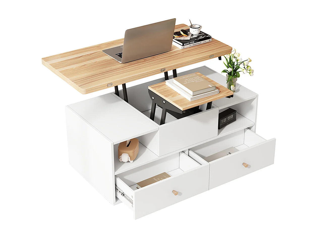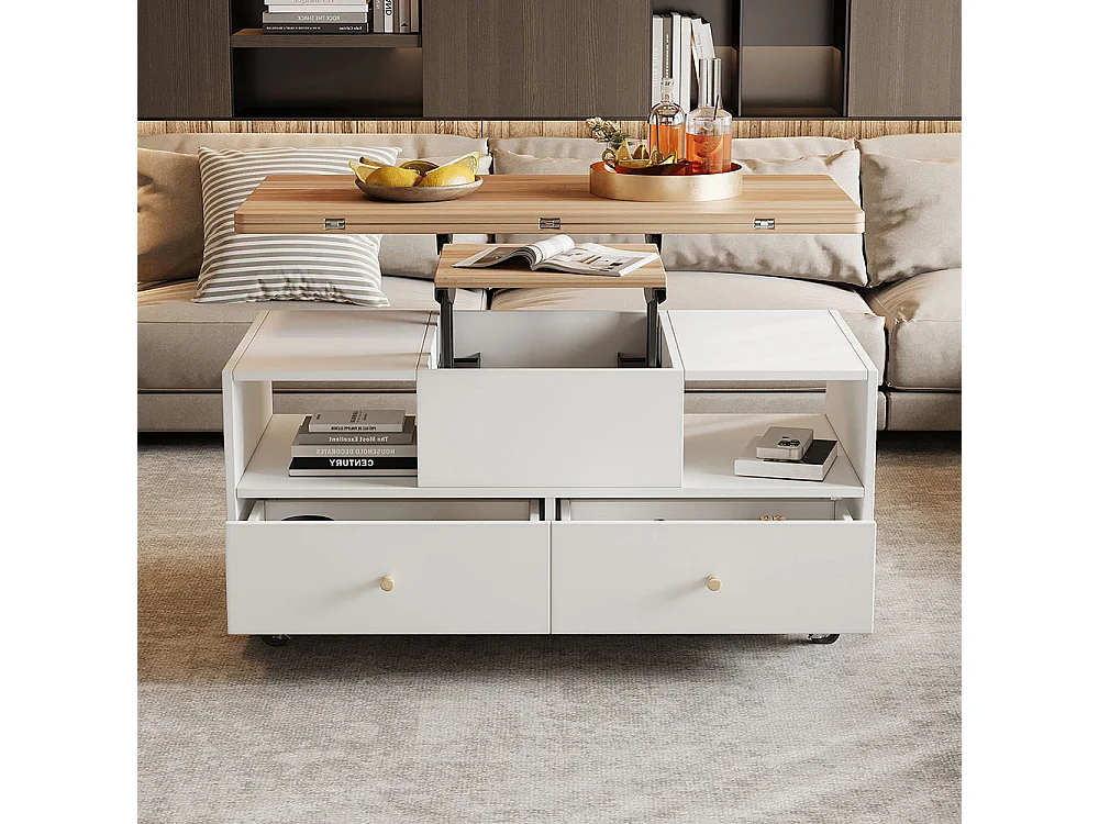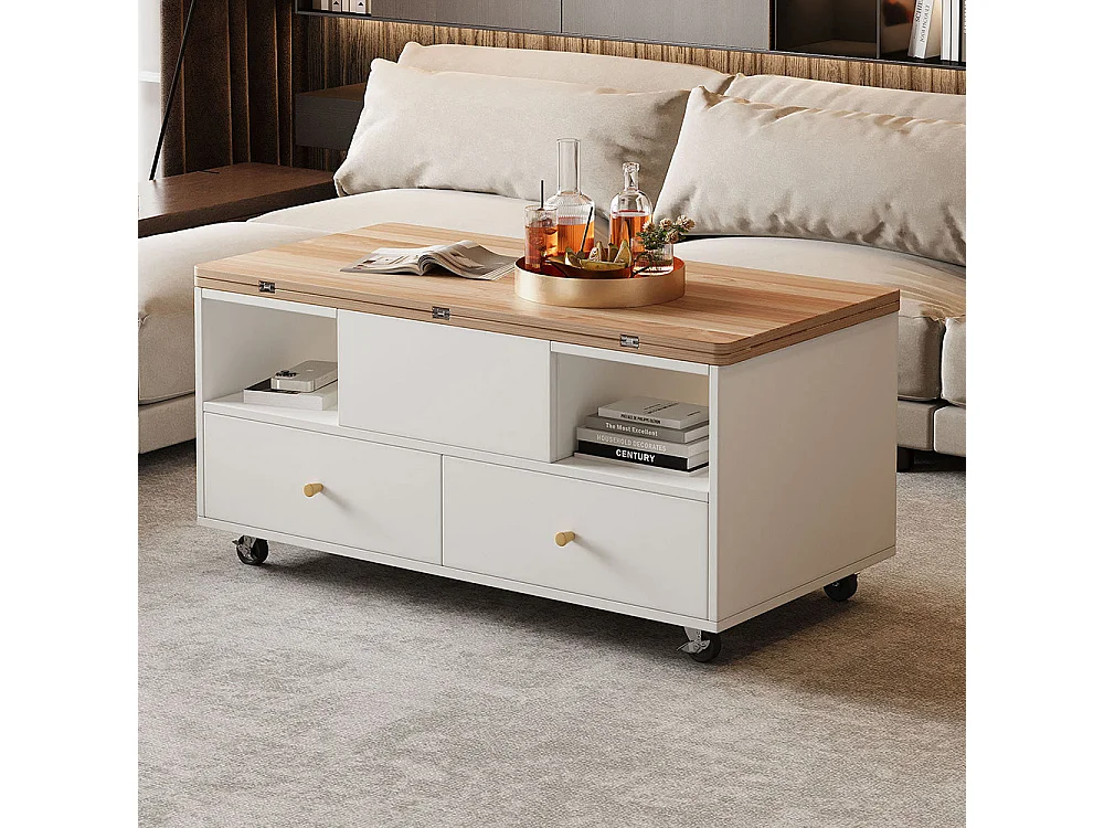 Table basse réglable rabattable 100x50x47 cm 4 tiroirs roulettes hydraulique