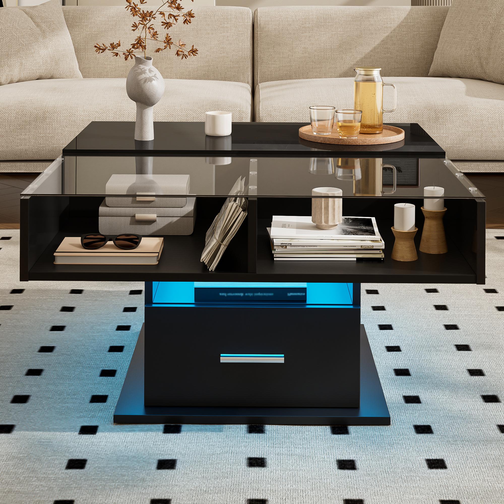 Table basse relevable - 80 x 80 x 45 cm - avec rangement dissimulé + 2 tiroirs + Leds - aggloméré + verre trempé - noire