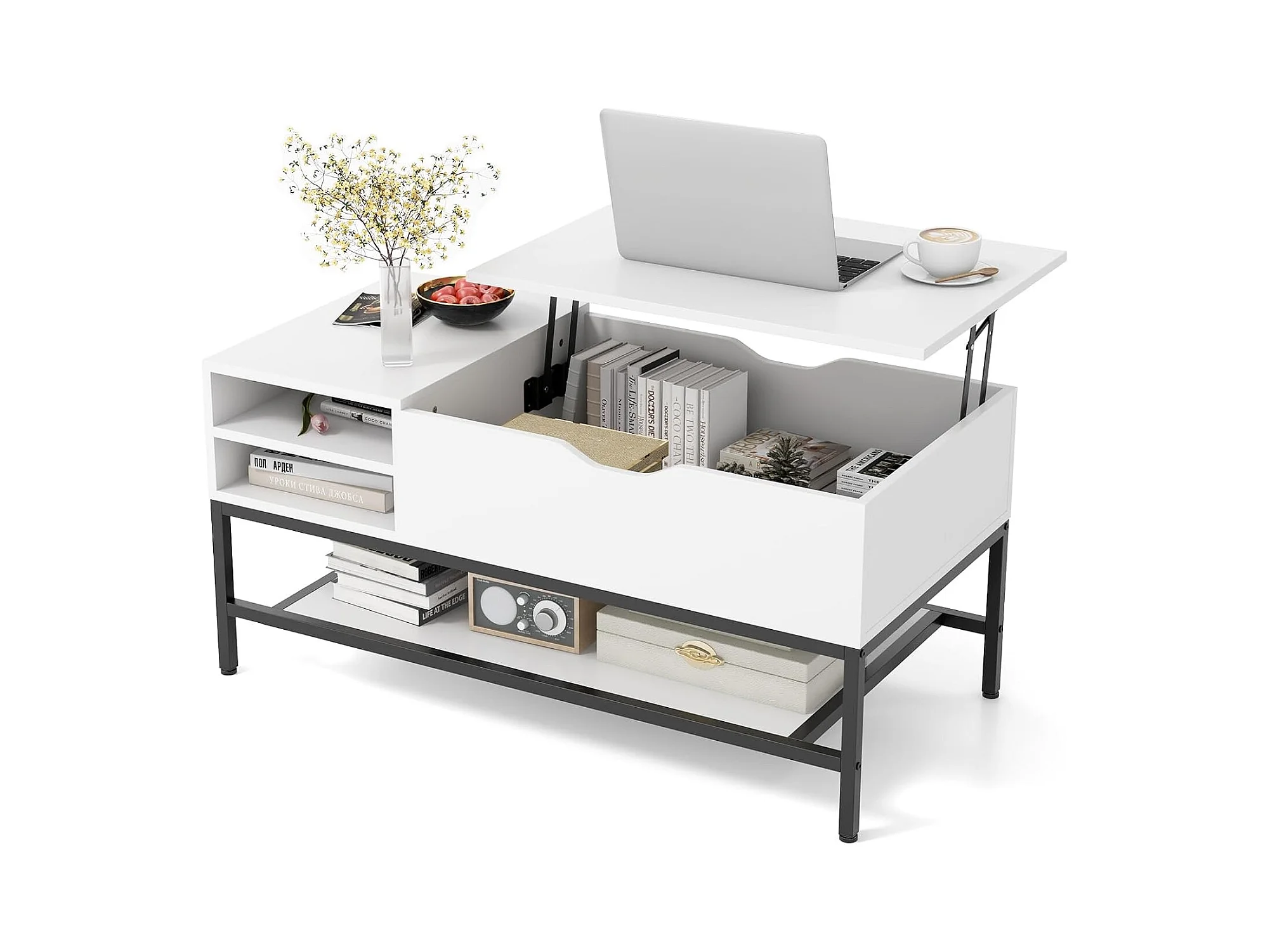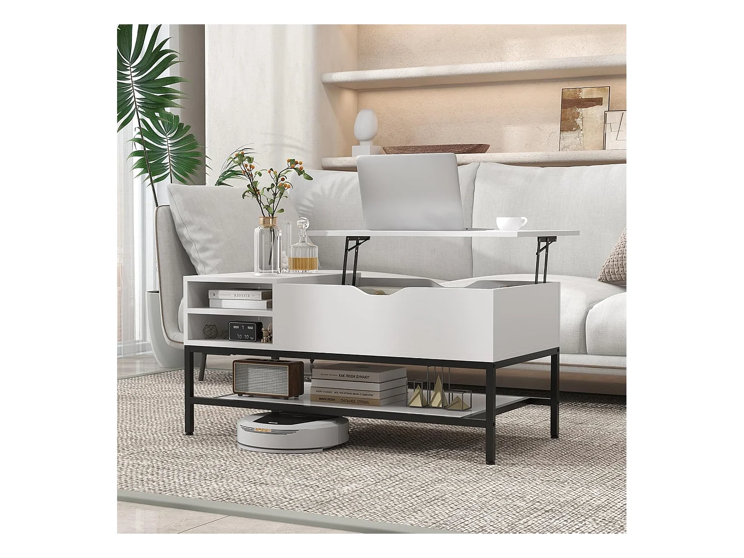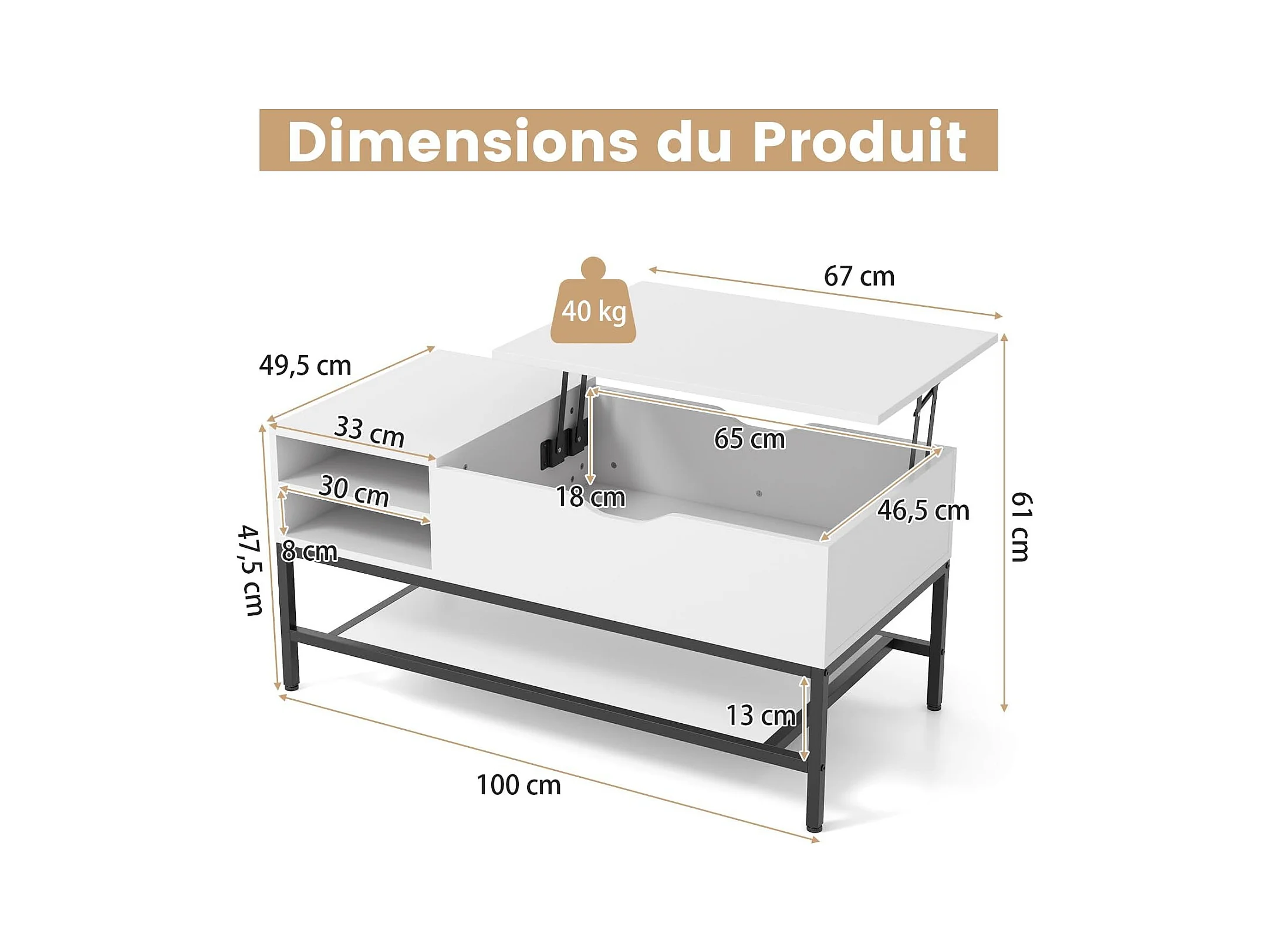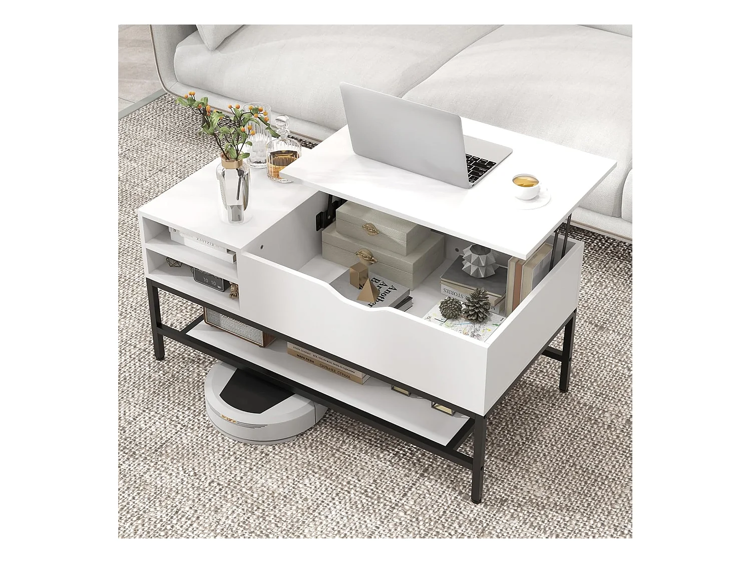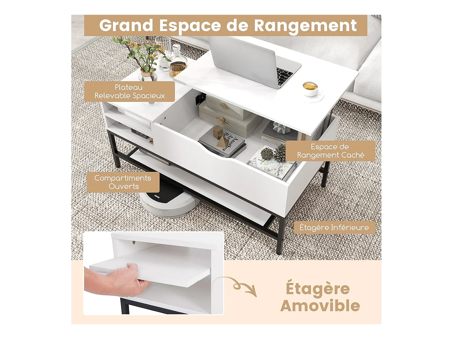Table basse relevable, compartiment caché, étagère amovible, levage à vérins à gaz(blanc)