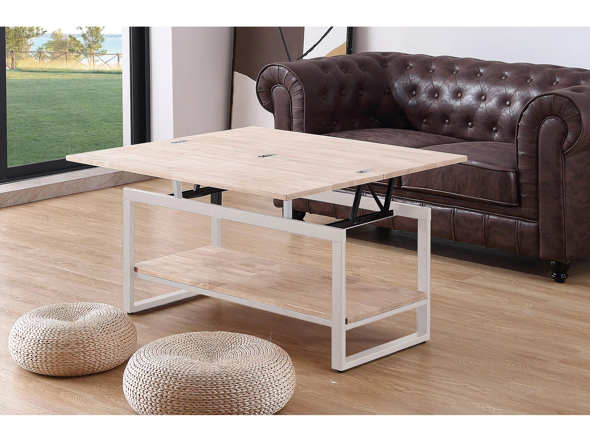 Table basse relevable et extensible en bois de chêne avec pied en métal blanc-Longueur 100 x Profondeur 45-90 x Hauteur 47-62 cm