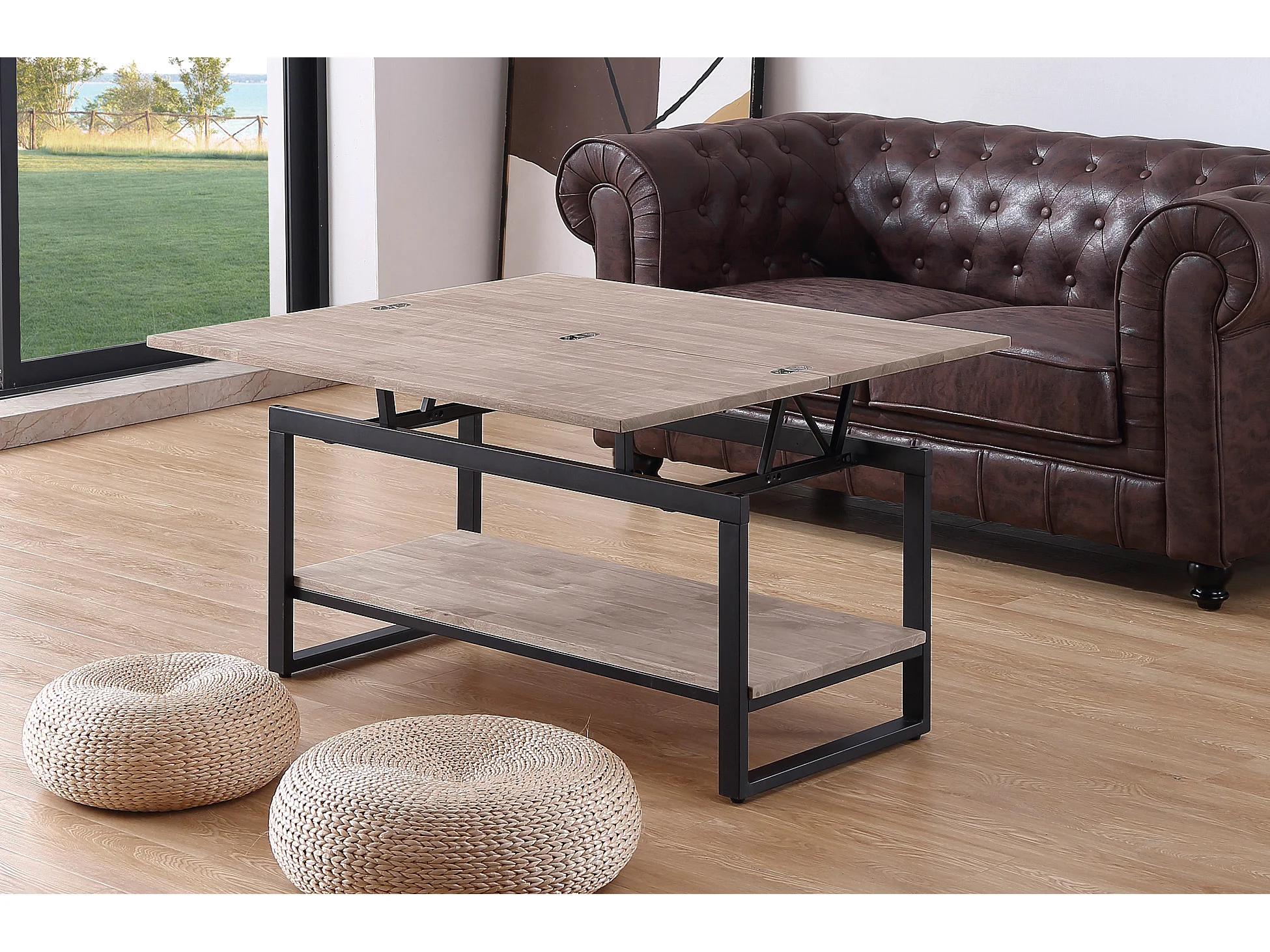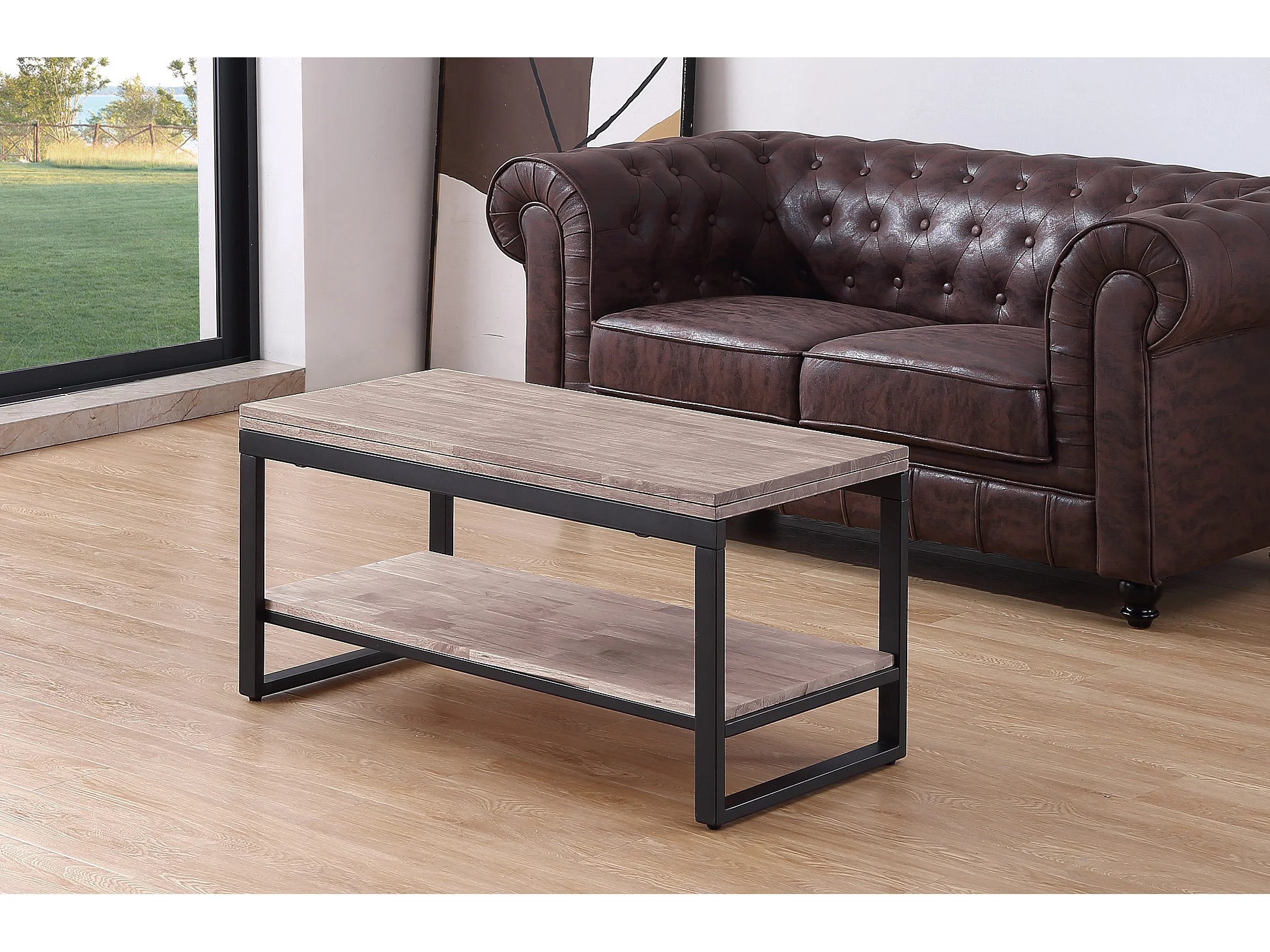 Table basse relevable et extensible en bois de chêne miel avec pieds en métal-Longueur 100 x Profondeur 45-90 x Hauteur 47-62 cm