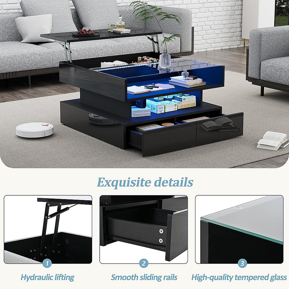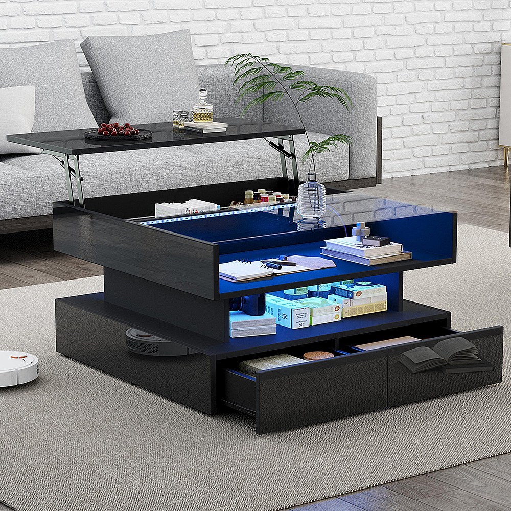 Table basse noire brillante avec plateau relevable et 2 tiroirs de rangement, éclairage LED